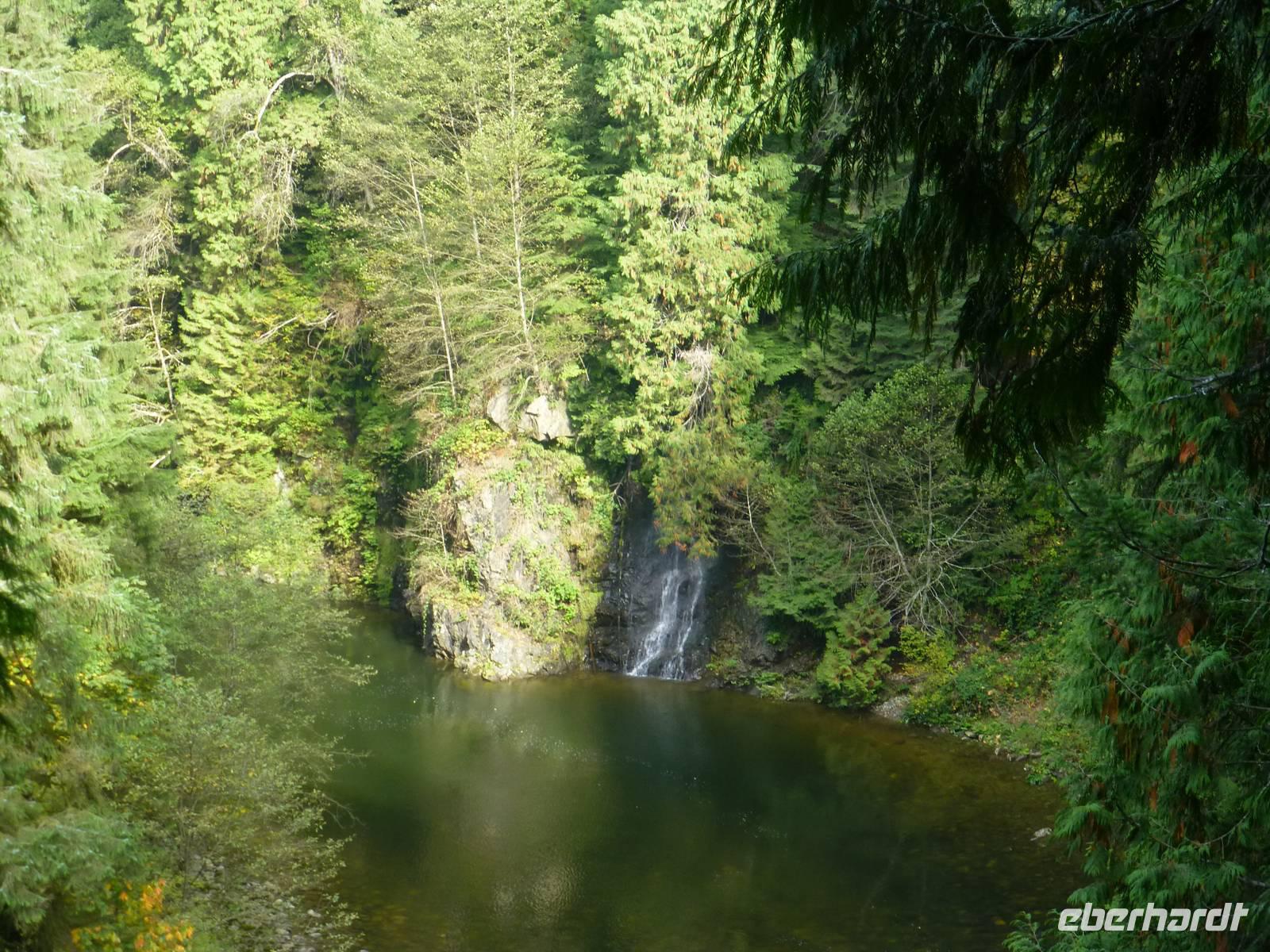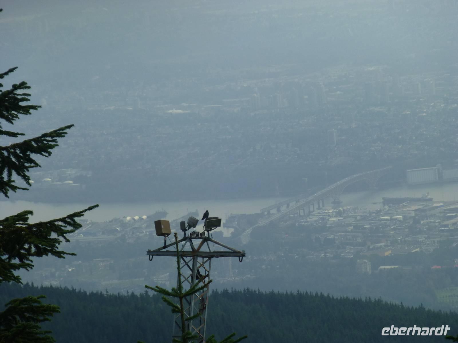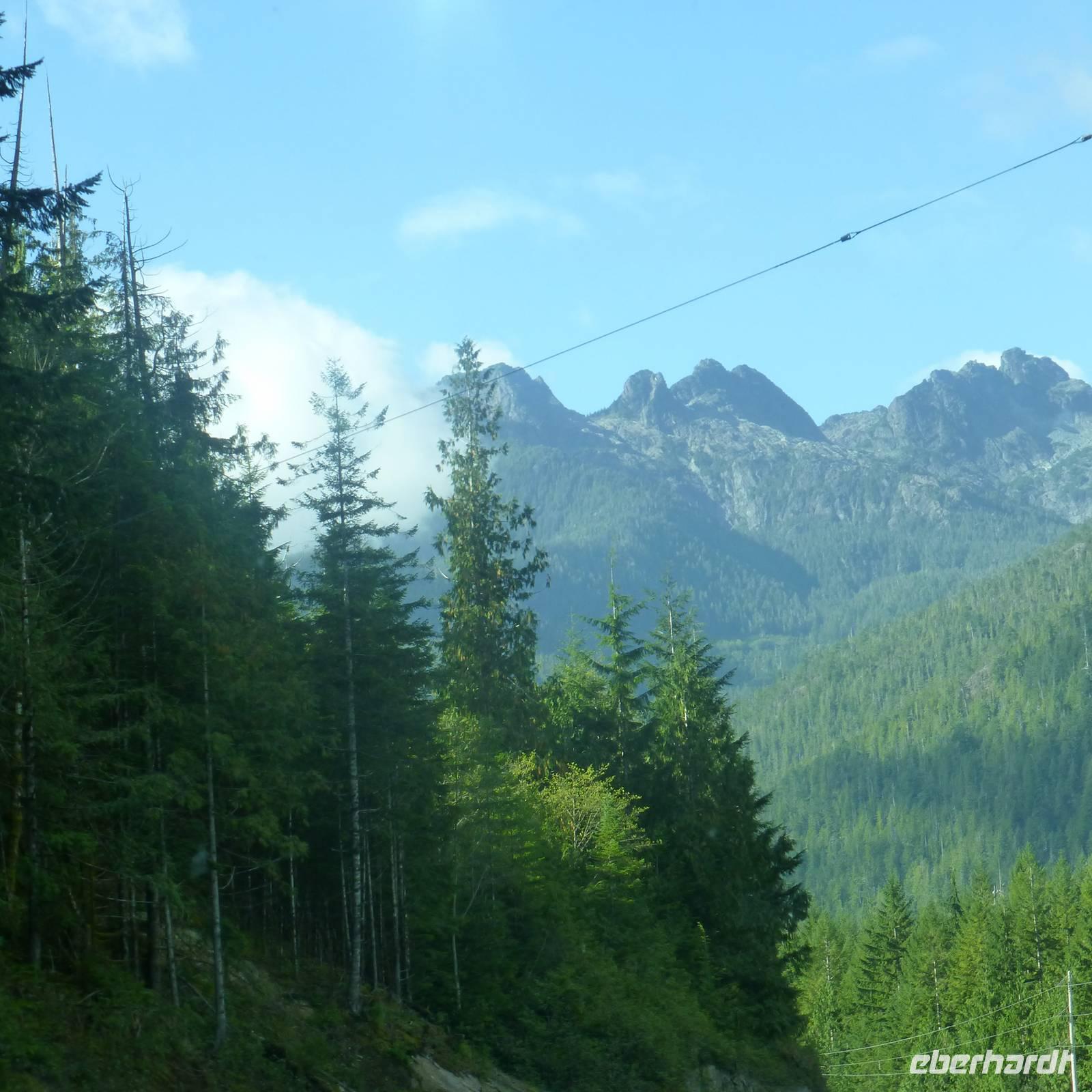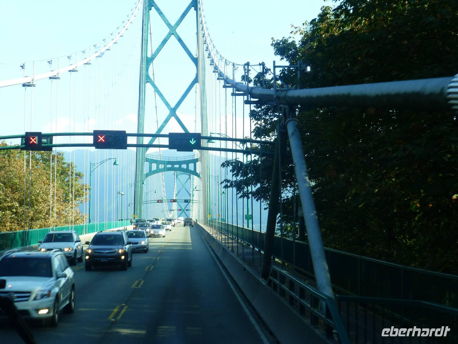 Der heutige Ausflug führte uns in den Norden von Vancouver. Doch erst fuhren wir in den Stanlay Park. An den Totempfählen der Westküsten Indianer legten wir einen Stopp ein und bestaunten die Skyline von Vancouver. Anschließend besuchten wir die Capilano Salmon Hatchery, eine Lachszuchtanstalt, wo der Lebenskreis der Lachse demonstriert wird. Über eine Lachstreppe überwinden Sie Lachse die Stromschnellen und springen Stromaufwärts. Im Anschluss daran besuchten wir den Capilano Suspension Bridge Park. Als erstes überquerten wir mutig die Capilano Suspension Bridge, die längste und höchste Fußgängerhängebrücke der Welt! Es schaukelte schon etwas. Auf dem Baumlehrpfad konnten wir auf sieben Hängebrücken entlang wandeln. Auch den neuen Cliffwalk liefen wir entlang. Anschließend fuhren wir mit Nordamerikas größter Luftseilbahn auf den Hausberg von Vancouver, den Grouse Mountain. Wir genießen bei einem Picknick den Blick über Vancouver. Auch wenn wir schon Schwarzbeeren gesehen haben, fehlte noch der Besuch der Grizzly Bären. Einer der Bären hatte sich im Wald schlafen gelegt. Doch der andere stellte sich gern als Fotomotiv zur Verfügung. Die Holzfäller Show Lumber Jacks' war lustig und amüsant.