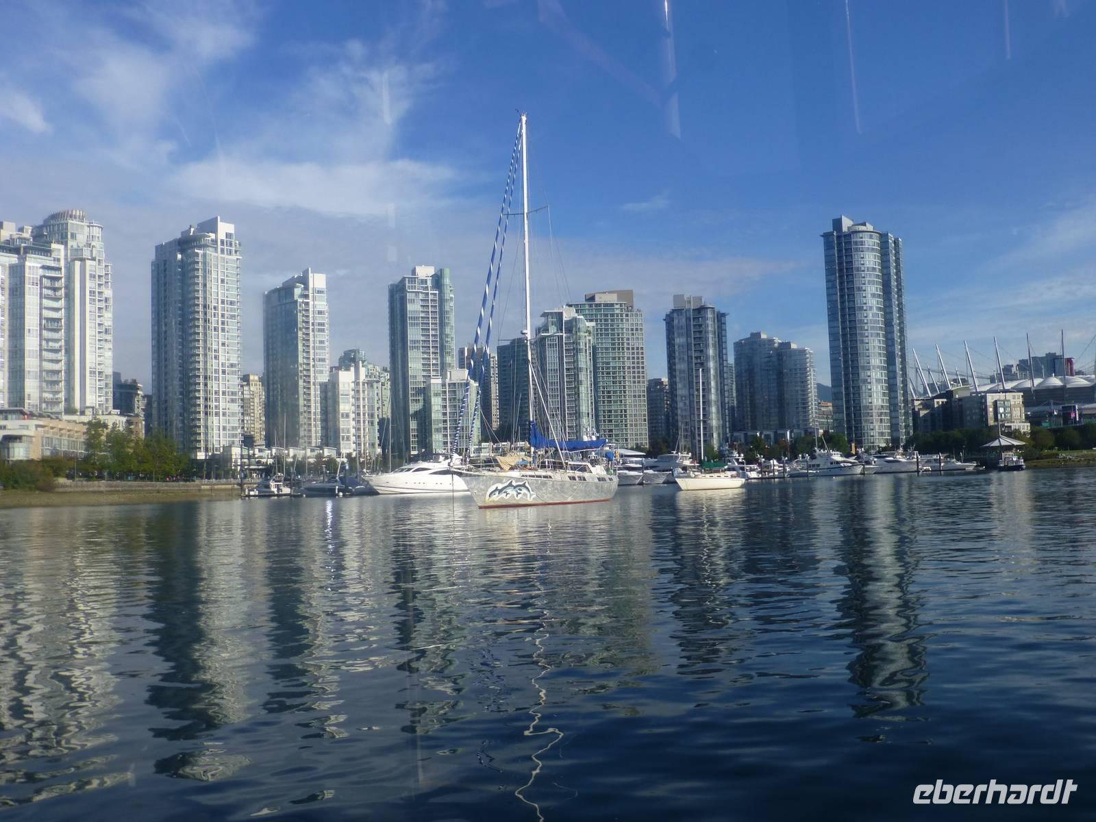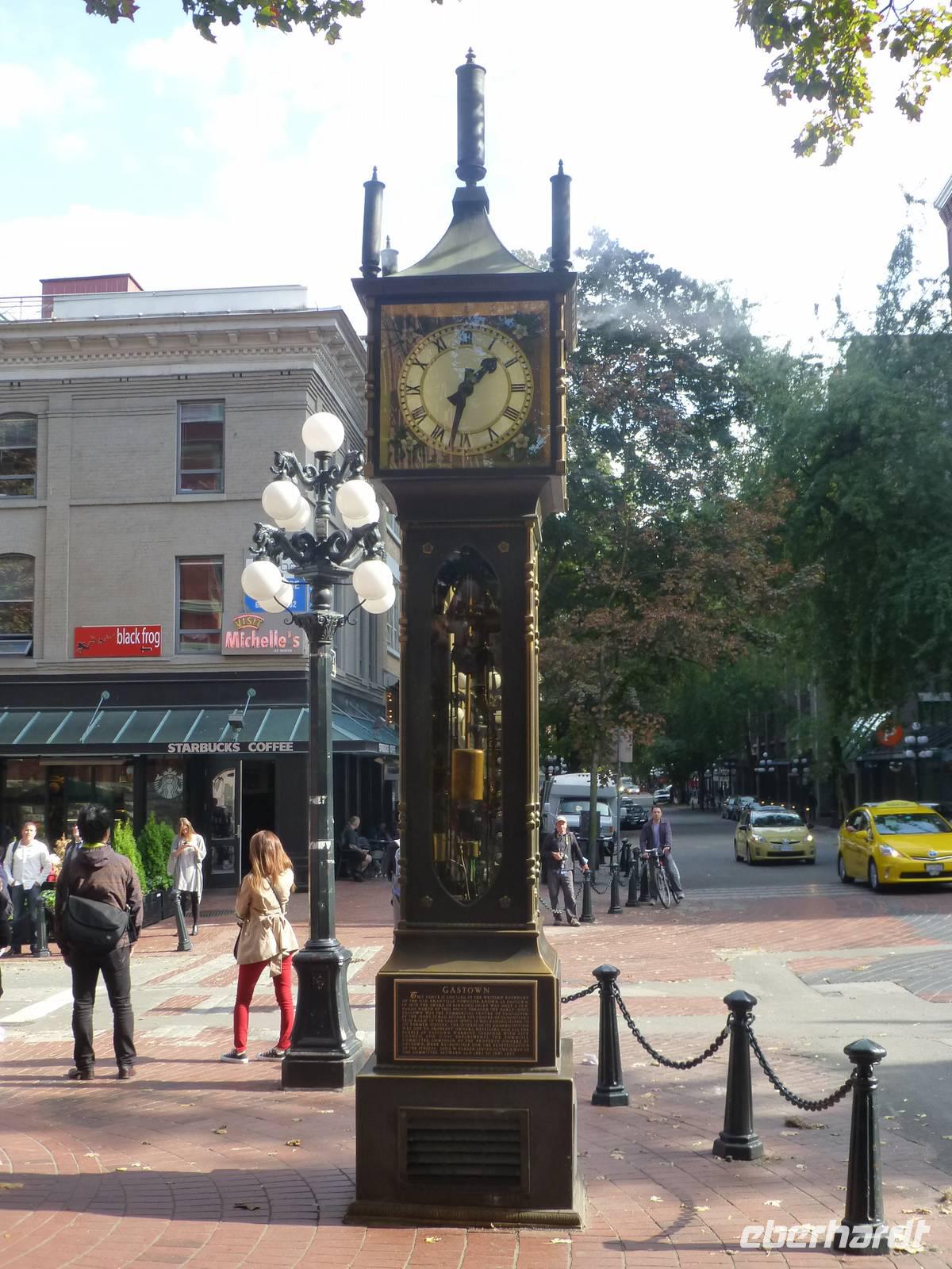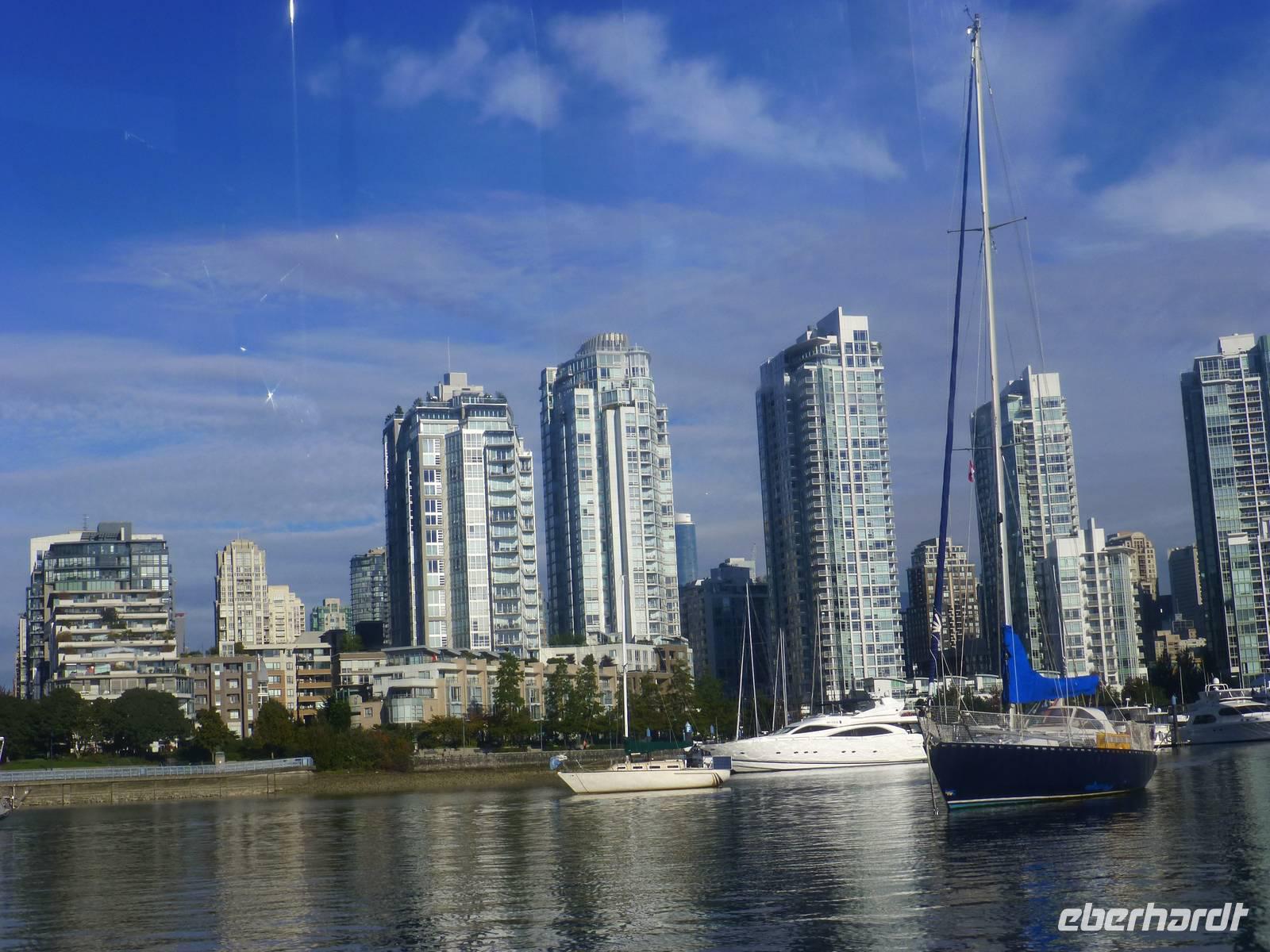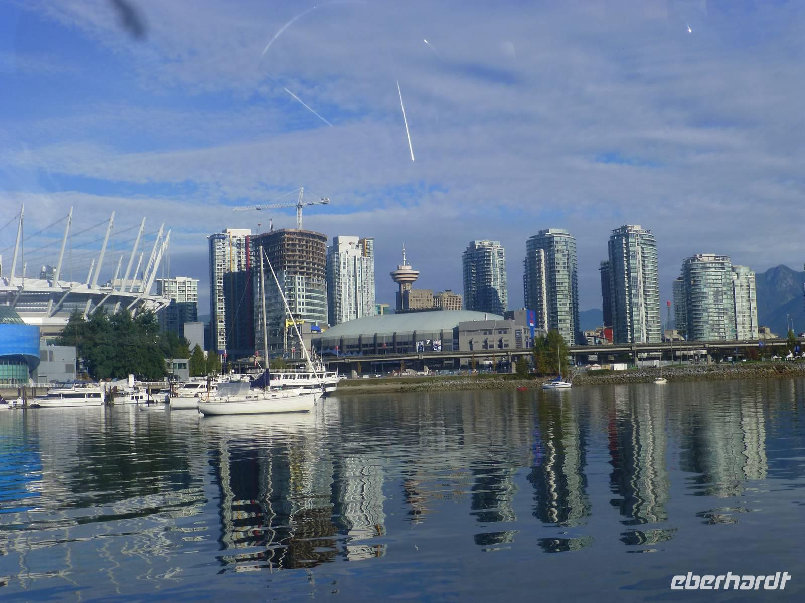 Am Vormittag legte unsere Fähre in Naimo nach Vancouver ab. Es war etwas windig und so saßen wir während der Fährüberfahrt unter Deck. Nach einer kurzen Fahrt durch den Stanley Park erreichten wir das Stadtzentrum. Durch Chinatown hindurch fuhren wir nach Gastown, den ältesten Stadtteil. Dem Namensgeber „Gassy Jack" ist auch in einem Denkmal gewidmet. Wir besuchten die berühmte Steam Clock. Die Uhr wird mit einer Dampfmaschine betrieben und stößt jede viertel Stunde eine Melodie durch die dampfenden Pfeifen aus. Unser nächstes Ziel ist der Canada Place, wo 2010 das olympische Feuer brannte und die Olympiasieger geehrt wurden. Gleichzeitig legen hier die großen Kreuzfahrtschiffe an und ab. Unser letztes Ziel war Granville Island, ein belebtes Künstlerviertel, mit vielen Geschäften Galerien und Restaurants. Wir erreichten unser Hotel und nutzten die Zeit für einen Stadtbummel oder einen Spaziergang am Hafen. Den Tag ließen wir auch dort ausklingen, den Anett lud uns zu Ihrem Geburtstag zu einem Whisky ein.