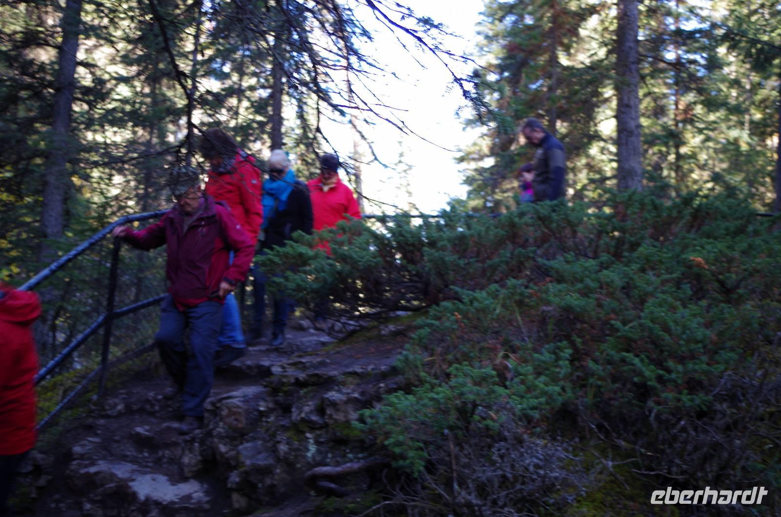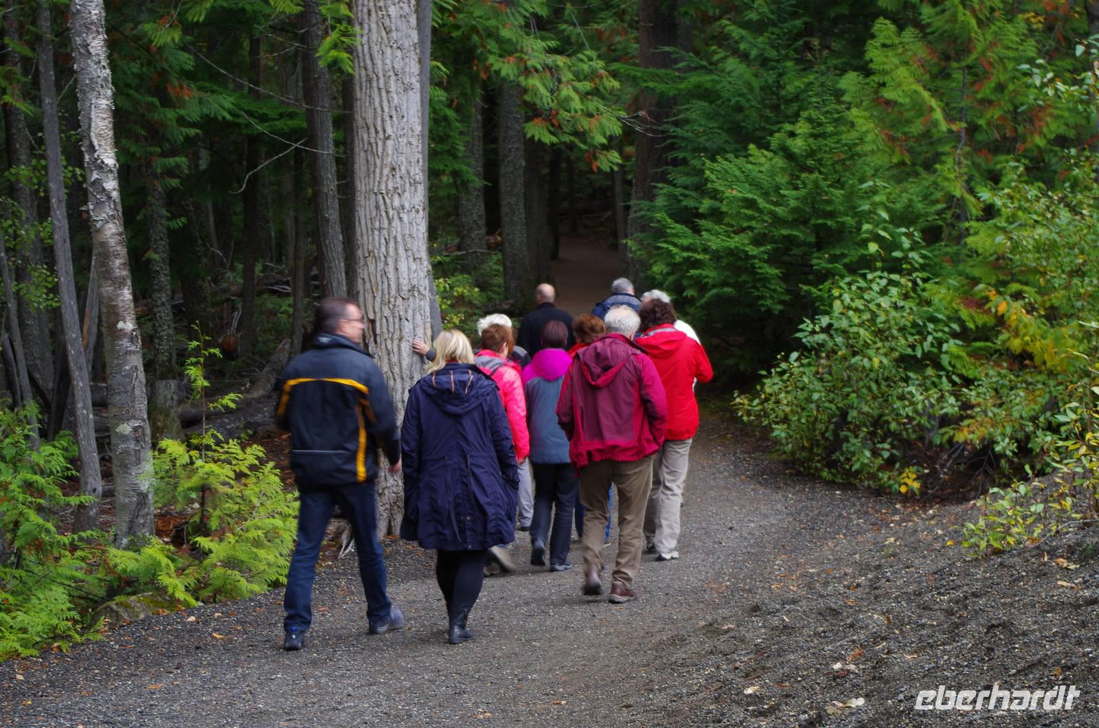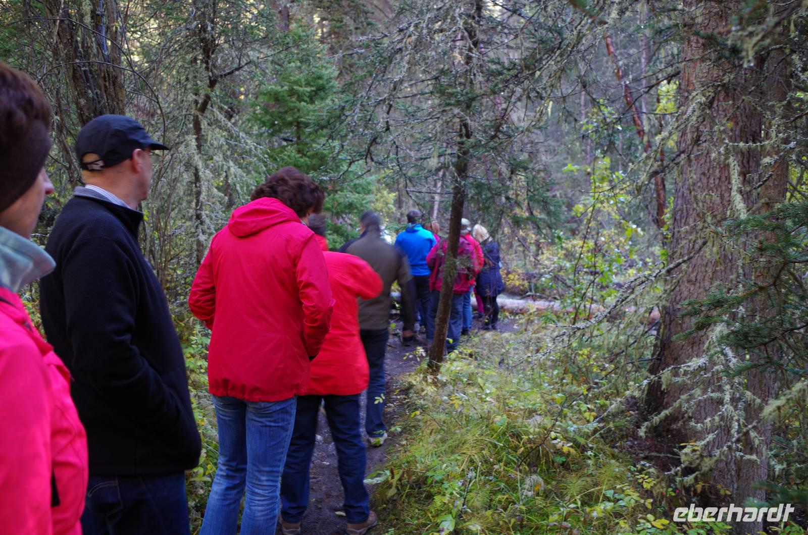 Nach einem reichhaltigem Frühstück begann der Tag auch wieder mit Sonnenschein. Unser erstes Ziel waren die Athabasca Wasserfälle.Doch leider war der Weg zu diesen gewaltigen Wasserfällen gesperrt, da es zuvor durch starke Regenfälle zu Baumbrüchen kam. Die Alternative war ein Spaziergang zur anderen Flusseite des Athabasca Rivers. Wir erreichten Jasper und fuhren zum Patrizia See und weiter zum Pyramiden See. Dort genossen wir die morgendliche Ruhe und den Mount Pyramid in seiner roten Farbe. Auf dem Yellowhead-Highway fuhren über den Yelloheedpass an die Grenze. Am Rande der Straße führte der Farbwechsel der Laubbäume zu einem spekatulären Kontrast zwischen goldenen, orangenen und grünen Blättern. Wir verließen Alberta und weiter ging es nach Britisch Columbia. Das bedeutete unsere Uhren noch einmal 1 Stunde zurück zu stellen .Wir erreichten den Mount Robson Provincial Park. Entlang der High Mountain Road fuhren wir über den Fraser River. Vorbei am Moose Lake kamen wir am Mount Robson Center an.Weiter ging es zu den Reargard Falls. Hier befindet sich der nördlichste Punkt wohin die Königslachse kommen, wenn sie nach einer langen und anstrengenden Reise versuchen, die Fälle zu überqueren, um zu ihren Laichgründen zu gelangen. Leider waren keine mehr zu sehen. Entlang des Thomsen River fuhren wir in Wieglers Heli Ski Resort. Uns erwarteten tolle Holzhäuser mit mehreren Zimmern und einem gemütlichen Gemeinschaftsraum. Kaffeemaschinen waren auch vorhanden und so ließen wir es uns schmecken. Nach der Kaffeepause spazierten wir zum See und wurden durch eine schöne Laubfärbung überrascht. Auch wurden einige durch den Besuch eines Schwarbären vor ihrer Tür überrascht. Nach dem Abendessen in Tonys Grill, wo es die leckersten Steaks der gesamten Reise gab, setzten wir uns noch gemütlich zusammen und ließen bei einem kanadischen Whiskey und Gebäck den Abend gemeinsam ausklingen.
