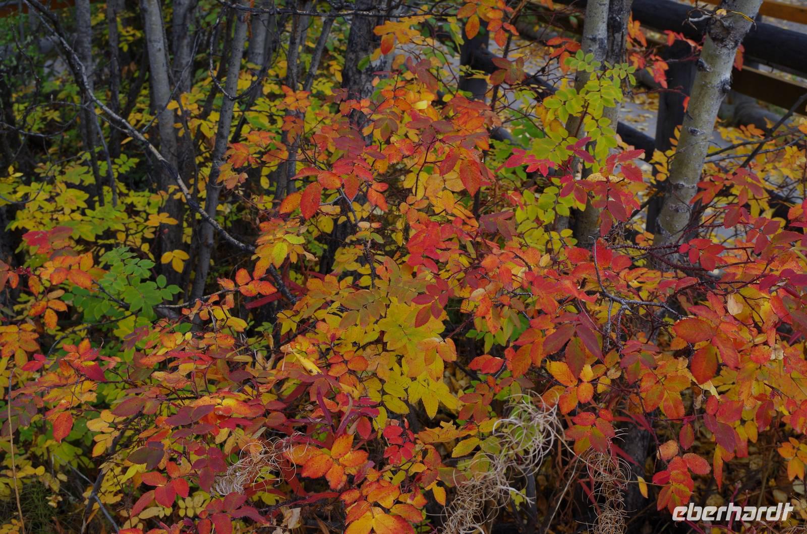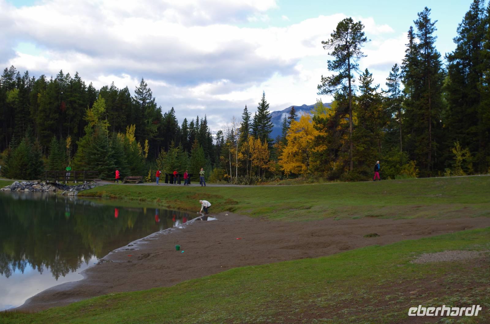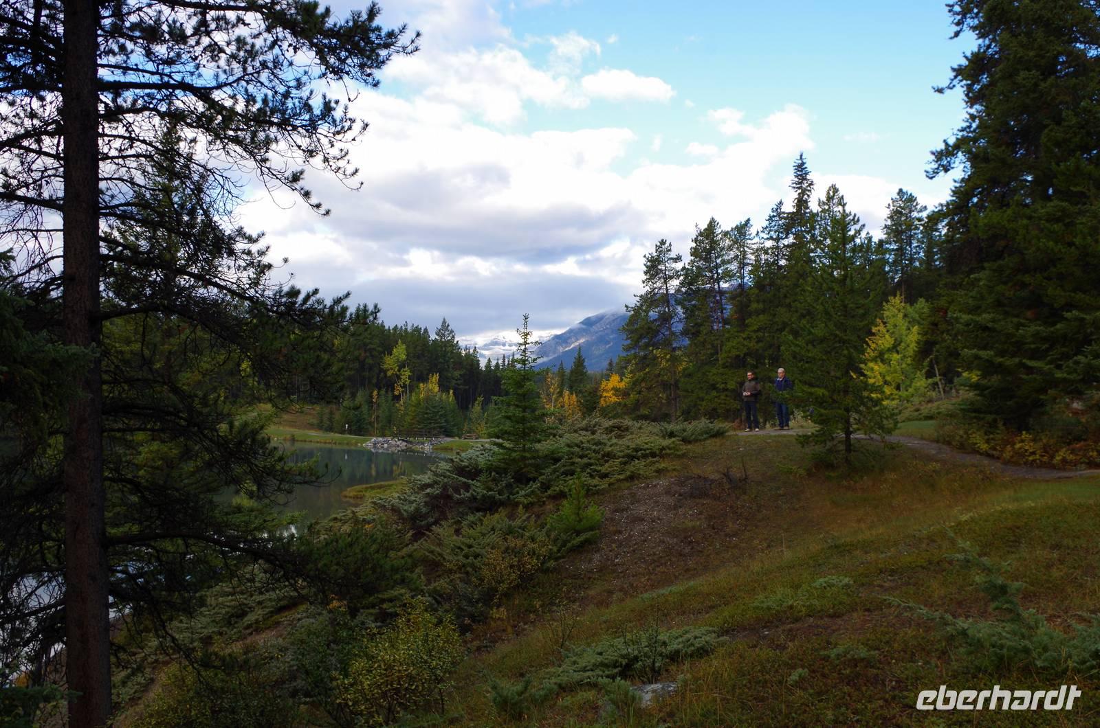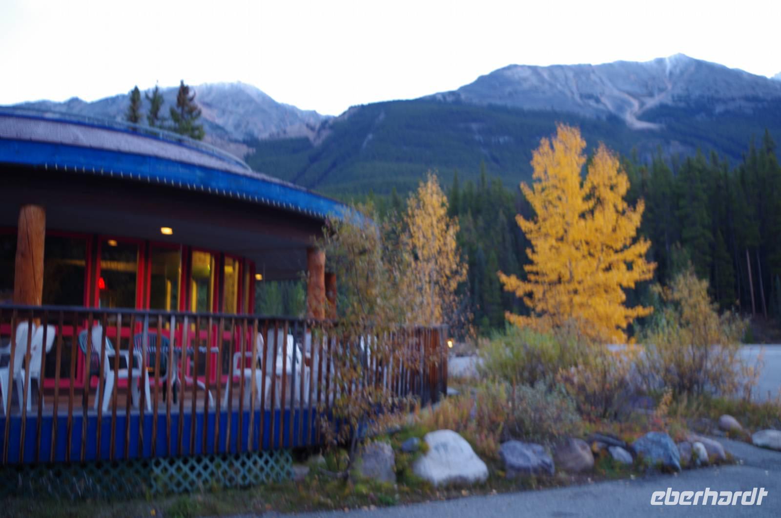 Nach einem reichhaltigem Frühstück begann der Tag auch wieder mit Sonnenschein. Unser erstes Ziel waren die Athabasca Wasserfälle.Doch leider war der Weg zu diesen gewaltigen Wasserfällen gesperrt, da es zuvor durch starke Regenfälle zu Baumbrüchen kam. Die Alternative war ein Spaziergang zur anderen Flusseite des Athabasca Rivers. Wir erreichten Jasper und fuhren zum Patrizia See und weiter zum Pyramiden See. Dort genossen wir die morgendliche Ruhe und den Mount Pyramid in seiner roten Farbe. Auf dem Yellowhead-Highway fuhren über den Yelloheedpass an die Grenze. Am Rande der Straße führte der Farbwechsel der Laubbäume zu einem spekatulären Kontrast zwischen goldenen, orangenen und grünen Blättern. Wir verließen Alberta und weiter ging es nach Britisch Columbia. Das bedeutete unsere Uhren noch einmal 1 Stunde zurück zu stellen .Wir erreichten den Mount Robson Provincial Park. Entlang der High Mountain Road fuhren wir über den Fraser River. Vorbei am Moose Lake kamen wir am Mount Robson Center an.Weiter ging es zu den Reargard Falls. Hier befindet sich der nördlichste Punkt wohin die Königslachse kommen, wenn sie nach einer langen und anstrengenden Reise versuchen, die Fälle zu überqueren, um zu ihren Laichgründen zu gelangen. Leider waren keine mehr zu sehen. Entlang des Thomsen River fuhren wir in Wieglers Heli Ski Resort. Uns erwarteten tolle Holzhäuser mit mehreren Zimmern und einem gemütlichen Gemeinschaftsraum. Kaffeemaschinen waren auch vorhanden und so ließen wir es uns schmecken. Nach der Kaffeepause spazierten wir zum See und wurden durch eine schöne Laubfärbung überrascht. Auch wurden einige durch den Besuch eines Schwarbären vor ihrer Tür überrascht. Nach dem Abendessen in Tonys Grill, wo es die leckersten Steaks der gesamten Reise gab, setzten wir uns noch gemütlich zusammen und ließen bei einem kanadischen Whiskey und Gebäck den Abend gemeinsam ausklingen.