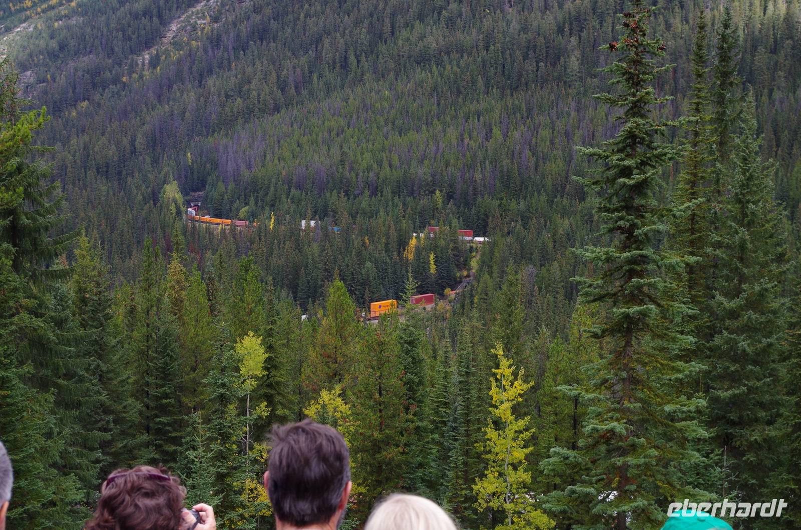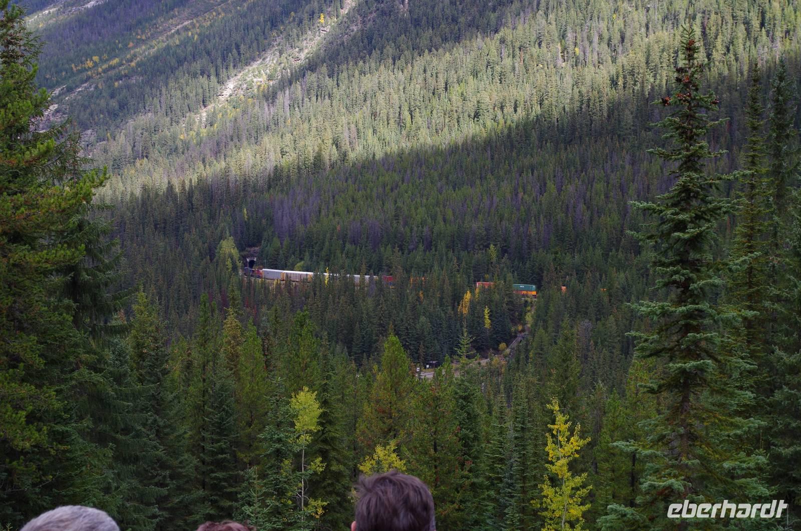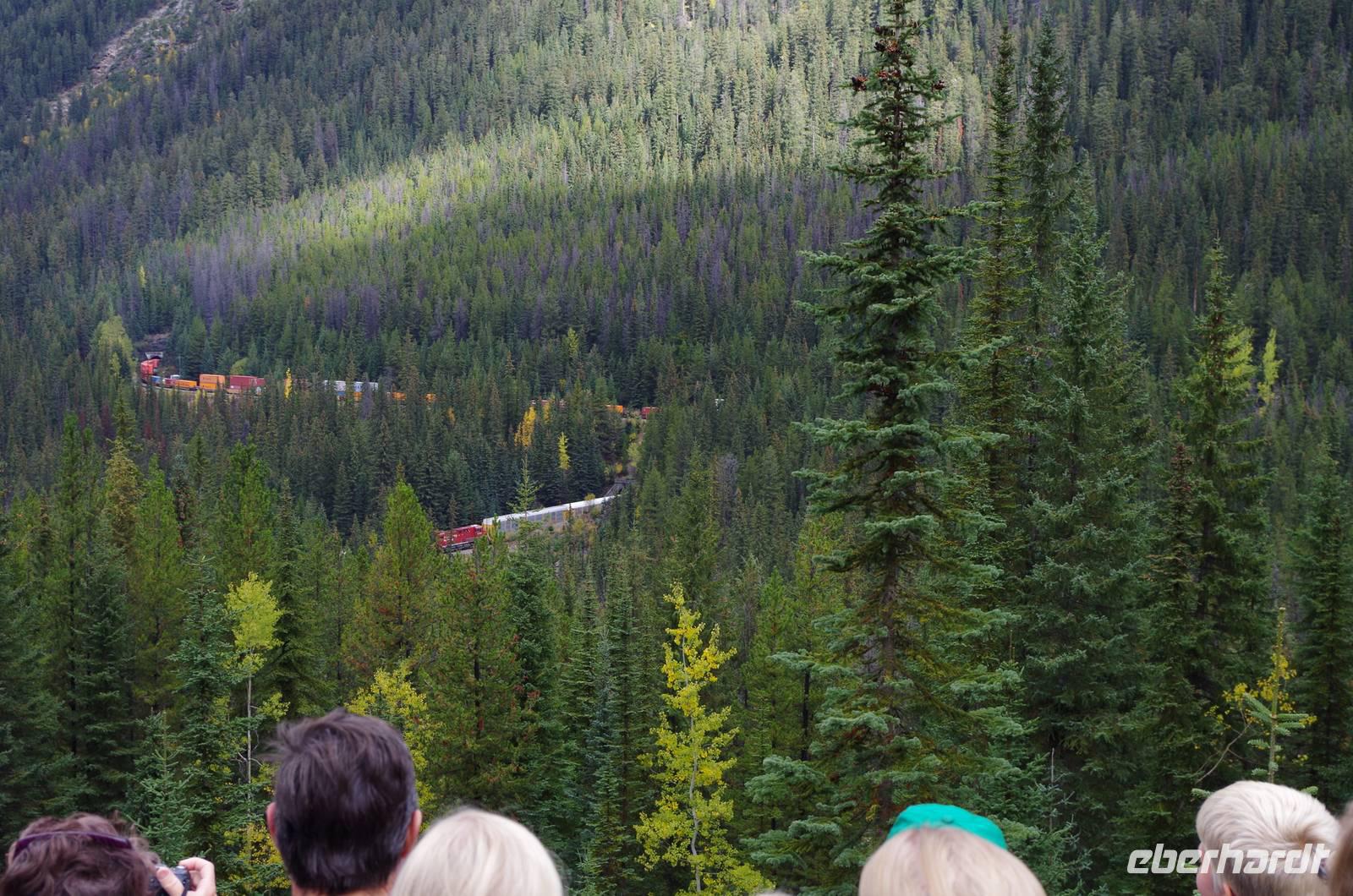 Unser Ausflug führte uns in den Banff Nationalpark. Wir unternahmen einen Spaziergang im Johnston Canyon zum unteren Wasserfall. Vorbei am Tempel Mountain erreichten wir über den Waschbeckensee und den Kicking Horse Pass1200m - den Spiraltunnel. Er wurde gebaut um die Steigungen zu minimieren. Wir hörten es donnert und wir hofften einen Zug zusehen. Wir hatten Glück. Ein einmaliges Schauspiel als der Zug aus einem Tunnel hinein fuhr und an einem anderen Tunnel wieder heraus. Alles sah aus wie auf einer Eisenbahnplatte. Weiter ging es in das Herz des Yoho Nationalpark in den kleinen Ort Field und an den Emerald Lake - Schmaragdsee. Die Bergkulisse und das Türkisblaue Wasser hatte uns begeistert. Ein besonderer Höhepunkt war der Besuch am Lake Louis - das meist fotographierte Motiv in Kanada. Nach einem Rundgang durch das Fairmont Chateau Lake Louise spazierten wir entlang des Sees. Viele Fotomotive erfreuten unser Gemüt. Besonders schön ist der Mount Victoria, dessen Gletscher weit bis an das Wasser reicht. Traumhafte Bergkulissen und klasklares Wasser - der Traum Kanadas und wir mittendrin.
