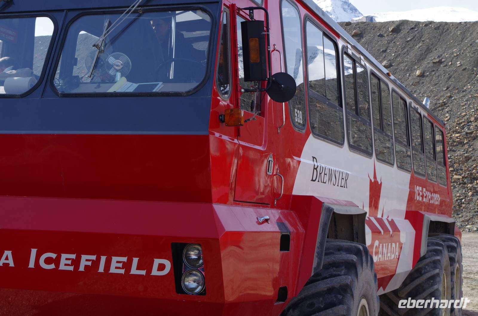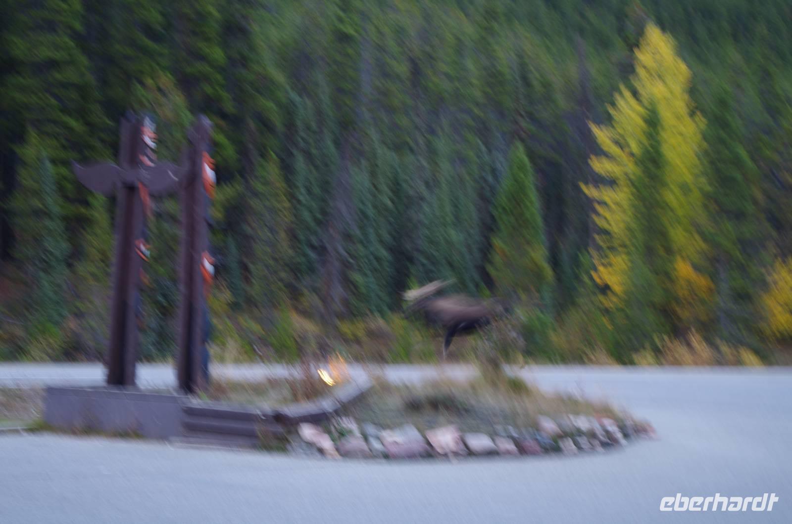 „Wenn Engel reisen", auch der heutige Tag versprach bestes Wetter. Unser erster Stopp war am Manowoka See.Wir besuchten den Bow Lacke und unternahmen einen kleinen Spaziergang. Vorbei am Wapitosee erreichten wir einen der schönsten Seen, den Payto Lake. Die Besonderheit ist sein türkisblaues Wasser und seine Form, die einem Hundekopf sehr ähnelt. Auf dem Icefield Parkway, eine der schönsten Straßen der Welt fuhren wir am Icifiel Parkwächter und weiteren Gletschern vorbei, die nach jeder Kurve erschienen. Wir erreichten das Columbia Icefield. Durch Sonnenschein lohnte sich die Auffahrt auf das Icefield . Mit einem normalen Bus ging es die Straße bergauf. Mit dem Snowmobil erreichten wir den Athabasca-Gletscher. Man muss sagen, es war eine abenteuerliche fahrt, denn das Snowmobil hatte eine Steigung von über 30 % zu überwinden. Wir lernten auf dieser Fahrt auch die chinesische und japanische Sprache genauer kennen. :-) Es war Zeit zum Herumlaufen und einige Fotos zu schießen. Vorsicht war geboten, denn das Eis war an manchen Stellen schon sehr weich. Es war ein tolles Erlebnis. Unser letztes Ziel war der Supawapta Wasserfall, der sich in unmittelbarer Nähe unserer Lodge befand. In der Lodge angekommen wurden wir herzlich begrüßt. Die Sonne schien und wir nutzten die Gelegenheit noch eine kleine Wanderung zu den Sunwapta Falls zu unternehmen. Das Highligt des Tages überraschte uns dann am Abend beim Abendessen - wir wurden von einem stattlichen Elch besucht. Das war ein unfassbares Erlebnis für alle.