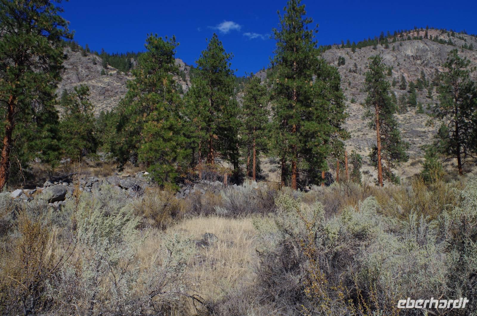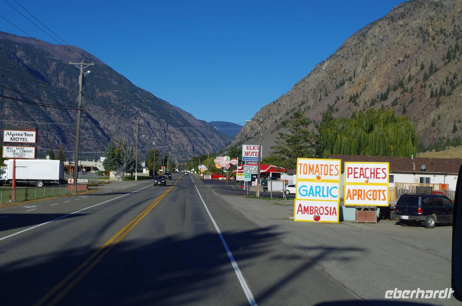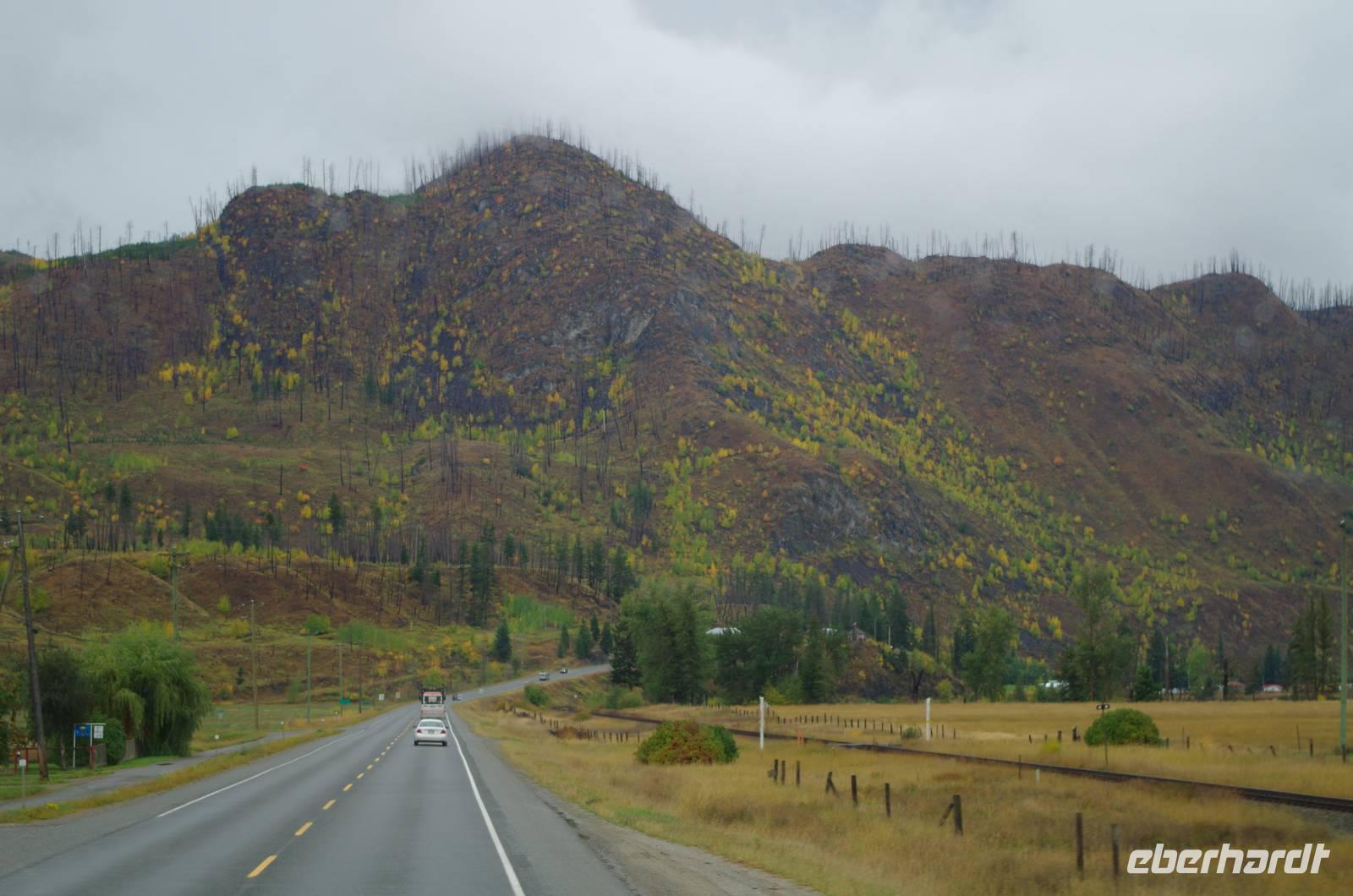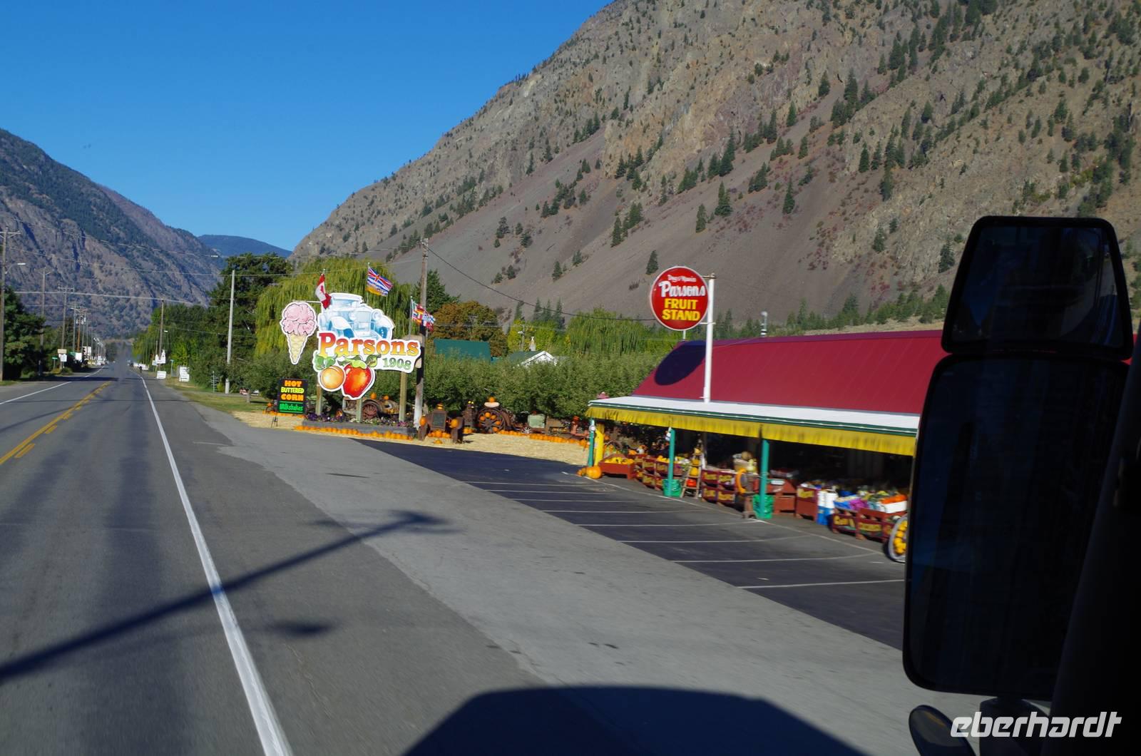 Das Frühstück wurde uns wieder in Tonys Grill gereicht. Auf dem Weg nach Kaamlops zeigte sich der erste blaue Himmel. Wir erreichten Clearwater und den Spahats Wasserfall. Im Information Center kauften wir uns noch eine Landkarte um unseren Reiseverlauf fest zu halten. Nun kamen wir langsam in das Ranchgebiet. Erste Rinderherden und Ginseng Felder waren zu sehen. Die Berge wurden niedriger und wir erreichten Barrier. Vor einigen Jahren war diese Stadt bekannt durch einen verheerenden Waldbrand. Die Stadt musste damals evakuiert werden. Überall waren verbrannte Berge zu sehen. In Kaamlops fuhren wir an einem Indianerreservat mit einem POW WOW Gelände vorbei. In der South Thomsen Range legten wir unsere Mittagspause ein und setzten anschließend unsere Fahrt nach Wilhelms fort. Wir näherten uns dem Okanakental. Bekannt durch den Obstanbau. Vor allem werden hier Äpfel, Birnen, Pflaumen und Pfirsiche angebaut. Verschiedene Obststände standen entlang der Straße. Nach kurzem Halt kauften auch wir einiges Obst ein. Unser nächstes Ziel war der Kalamalka See in Kelowna. Da das Wetter an diesem Tag mal nicht auf unserer Seite war, besuchte die Gruppe in Kelowna die riesige Shopping Mall. Am Abend ging es für uns ins Pub. Dort lernten wir bei Liyemusik das kanadische Nachtleben kennen.