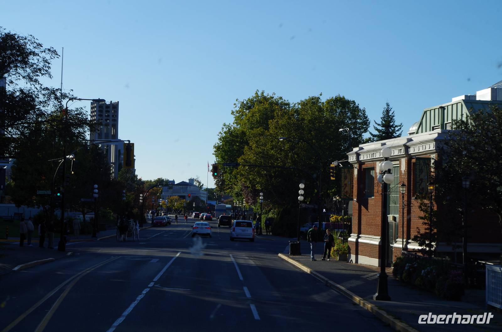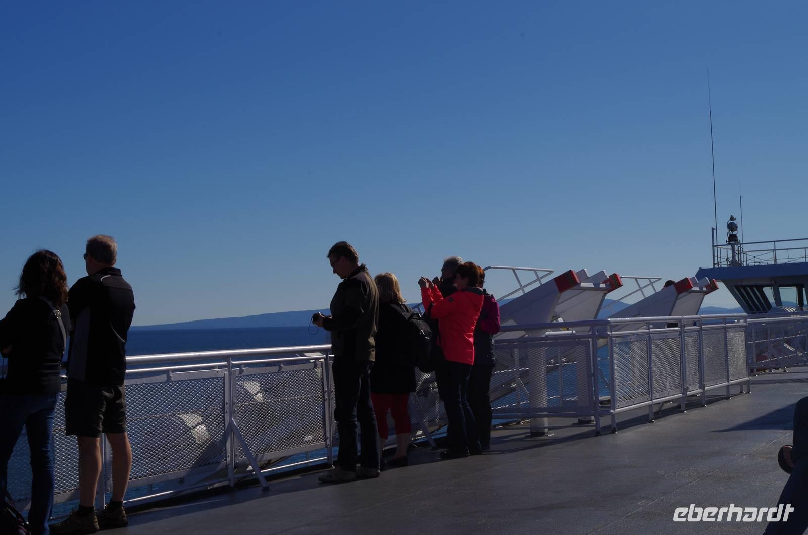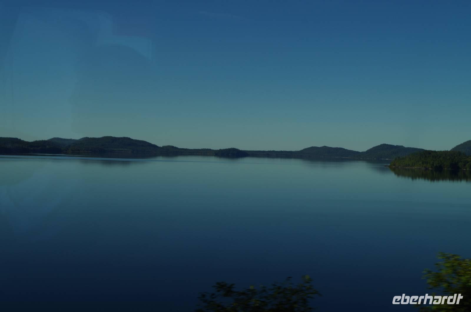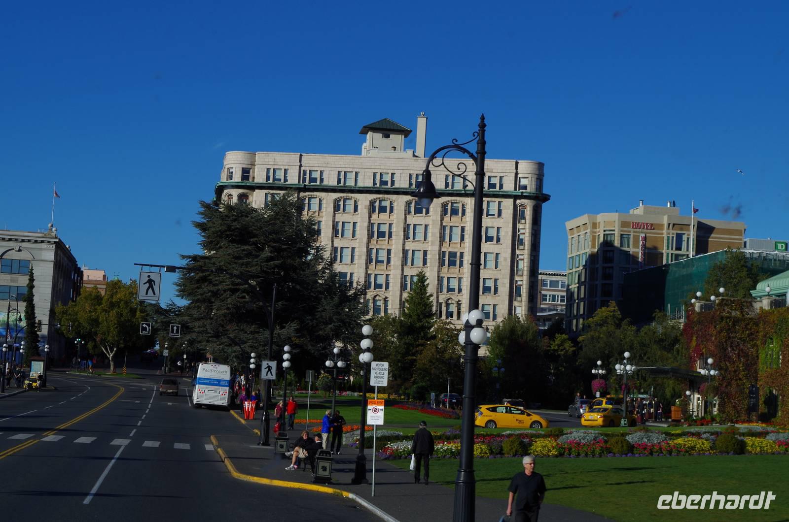 Heute stand eine lange Fahrt bevor. Bei schönem Wetter mit blauem Himmel und Sonnenschein fuhren wir 411km nach Tsawassen zur Fähre nach Vancouver Island. Wir erreichten Korumeus - die letzte Stadt des Obstanbaus. Auch hier gab es viele Obststände, wo wir nach herzenslust einkauften. Unsere weitere Reise führte uns hinein in die Kaskadenberge nach Hedley, die frühere Goldstadt. Auch jetzt kann man in den Flüssen noch Gold waschen. Weiter ging es nach Princeton. Diese Stadt besitzt eines der größten Sägewerke Kanadas. Auch der Roter Oker -rote Farbe - wird dort noch abgebaut. Auf einer sehr kurvenreichen Straße fuhren wir bis auf 1300 m Höhe. Durch den Manninge Park - benannt nach einem Premierminister - erreichten wir das Ski Gebiet. In diesem Naturbelassenen Park wurden zu den Winterspielen in Vancouver etliche Laster mit Schnee nach Vancouver gefahren. In der Manning Lodge legten wir eine Pause ein. Endlich konnten die begehrten Bärenglocken gekauft werden. Wir fuhren über den Allision Pass 1290 m weiter nach Hope. Am Fräserfluss befand sich eine schöne Parkanlage mit verschiedenen geschnitzten Figuren. Es wurde wieder etwas bergig. Die Kaskadenberge begleiteten uns wieder. Das Tal wird immer breiter und auch der Fraserfluss breitete sich immer mehr aus. Bald sehen wir rechts schon die Küstenberge. Wir erreichten den Fährhafen in Twarwansen und konnten sofort auf die Fähre nach Vancouver Island. Die Überfahrt war ein Traum-wir hatten einen schönen Blick auf die Golf Inseln. Ein Stück wurden wir sogar von Robben begleitet. Die Überfahrt dauerte fast 2 Stunden bis nach Schwarz Bay. Wir erreichten unser Hotel in Victoria und nutzten die Zeit bis zum Abendessen für die ersten Fotos. Das Restaurant befand sich direkt am Hafen. Doch vorher besichtigten wir noch das Empire Hotel und bestaunten das schön beleuchtete Parlament. Nach dem Abendessen machten wir einen kleinen Spaziergang durch das bezaubernde Städtchen Victoria.