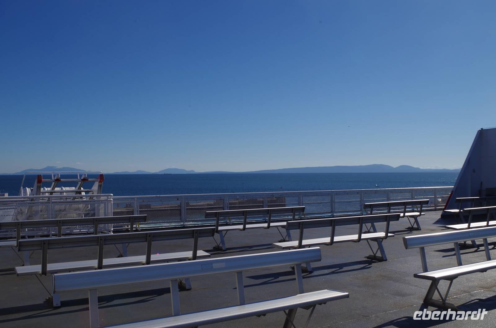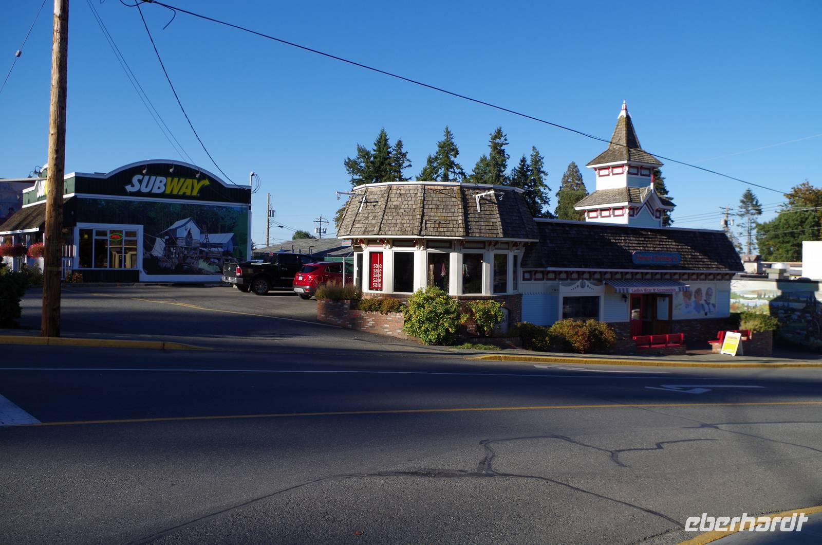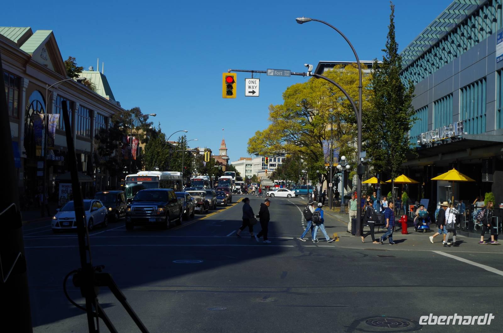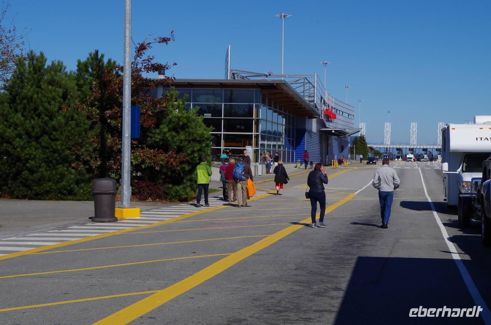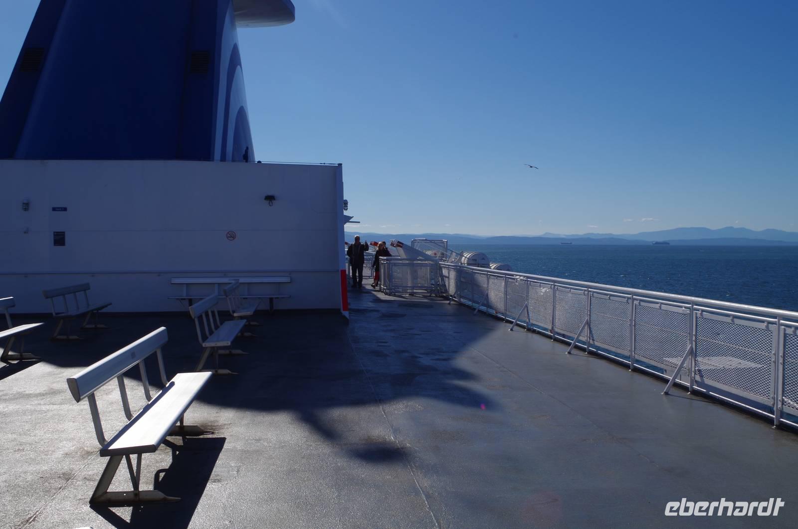 Heute stand eine lange Fahrt bevor. Bei schönem Wetter mit blauem Himmel und Sonnenschein fuhren wir 411km nach Tsawassen zur Fähre nach Vancouver Island. Wir erreichten Korumeus - die letzte Stadt des Obstanbaus. Auch hier gab es viele Obststände, wo wir nach herzenslust einkauften. Unsere weitere Reise führte uns hinein in die Kaskadenberge nach Hedley, die frühere Goldstadt. Auch jetzt kann man in den Flüssen noch Gold waschen. Weiter ging es nach Princeton. Diese Stadt besitzt eines der größten Sägewerke Kanadas. Auch der Roter Oker -rote Farbe - wird dort noch abgebaut. Auf einer sehr kurvenreichen Straße fuhren wir bis auf 1300 m Höhe. Durch den Manninge Park - benannt nach einem Premierminister - erreichten wir das Ski Gebiet. In diesem Naturbelassenen Park wurden zu den Winterspielen in Vancouver etliche Laster mit Schnee nach Vancouver gefahren. In der Manning Lodge legten wir eine Pause ein. Endlich konnten die begehrten Bärenglocken gekauft werden. Wir fuhren über den Allision Pass 1290 m weiter nach Hope. Am Fräserfluss befand sich eine schöne Parkanlage mit verschiedenen geschnitzten Figuren. Es wurde wieder etwas bergig. Die Kaskadenberge begleiteten uns wieder. Das Tal wird immer breiter und auch der Fraserfluss breitete sich immer mehr aus. Bald sehen wir rechts schon die Küstenberge. Wir erreichten den Fährhafen in Twarwansen und konnten sofort auf die Fähre nach Vancouver Island. Die Überfahrt war ein Traum-wir hatten einen schönen Blick auf die Golf Inseln. Ein Stück wurden wir sogar von Robben begleitet. Die Überfahrt dauerte fast 2 Stunden bis nach Schwarz Bay. Wir erreichten unser Hotel in Victoria und nutzten die Zeit bis zum Abendessen für die ersten Fotos. Das Restaurant befand sich direkt am Hafen. Doch vorher besichtigten wir noch das Empire Hotel und bestaunten das schön beleuchtete Parlament. Nach dem Abendessen machten wir einen kleinen Spaziergang durch das bezaubernde Städtchen Victoria.