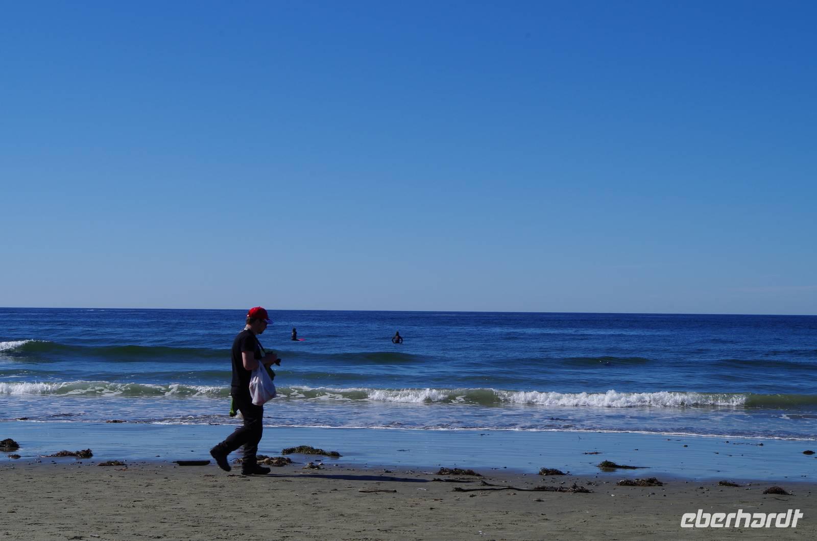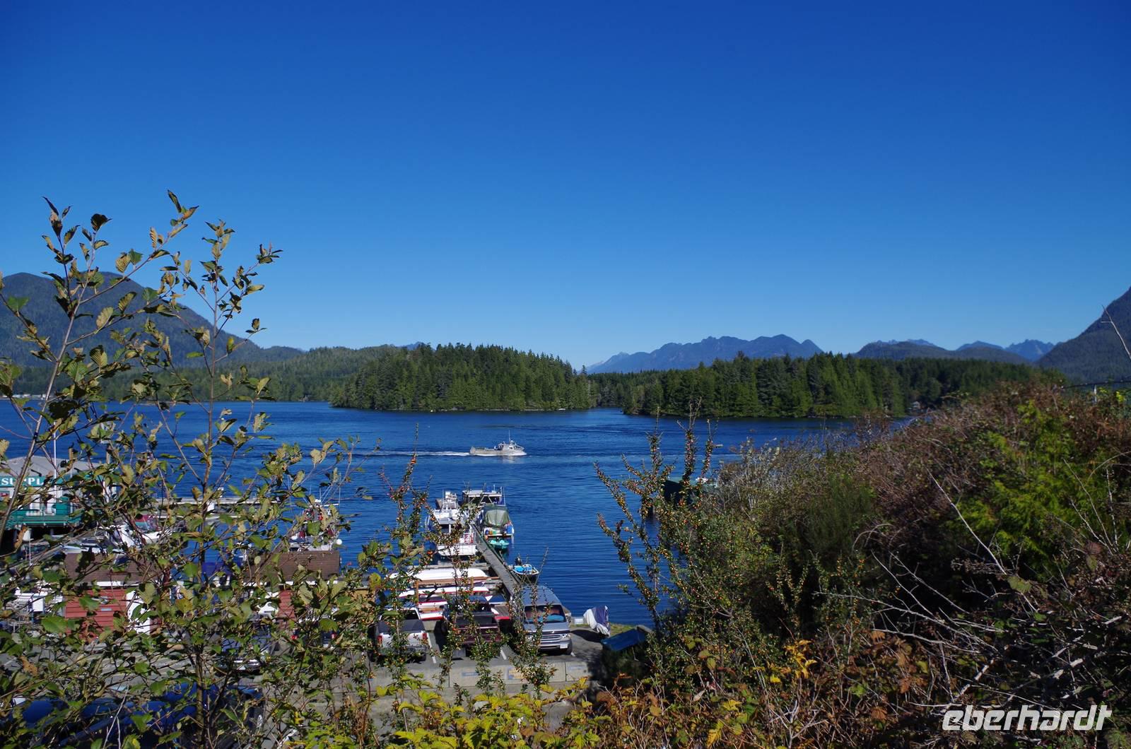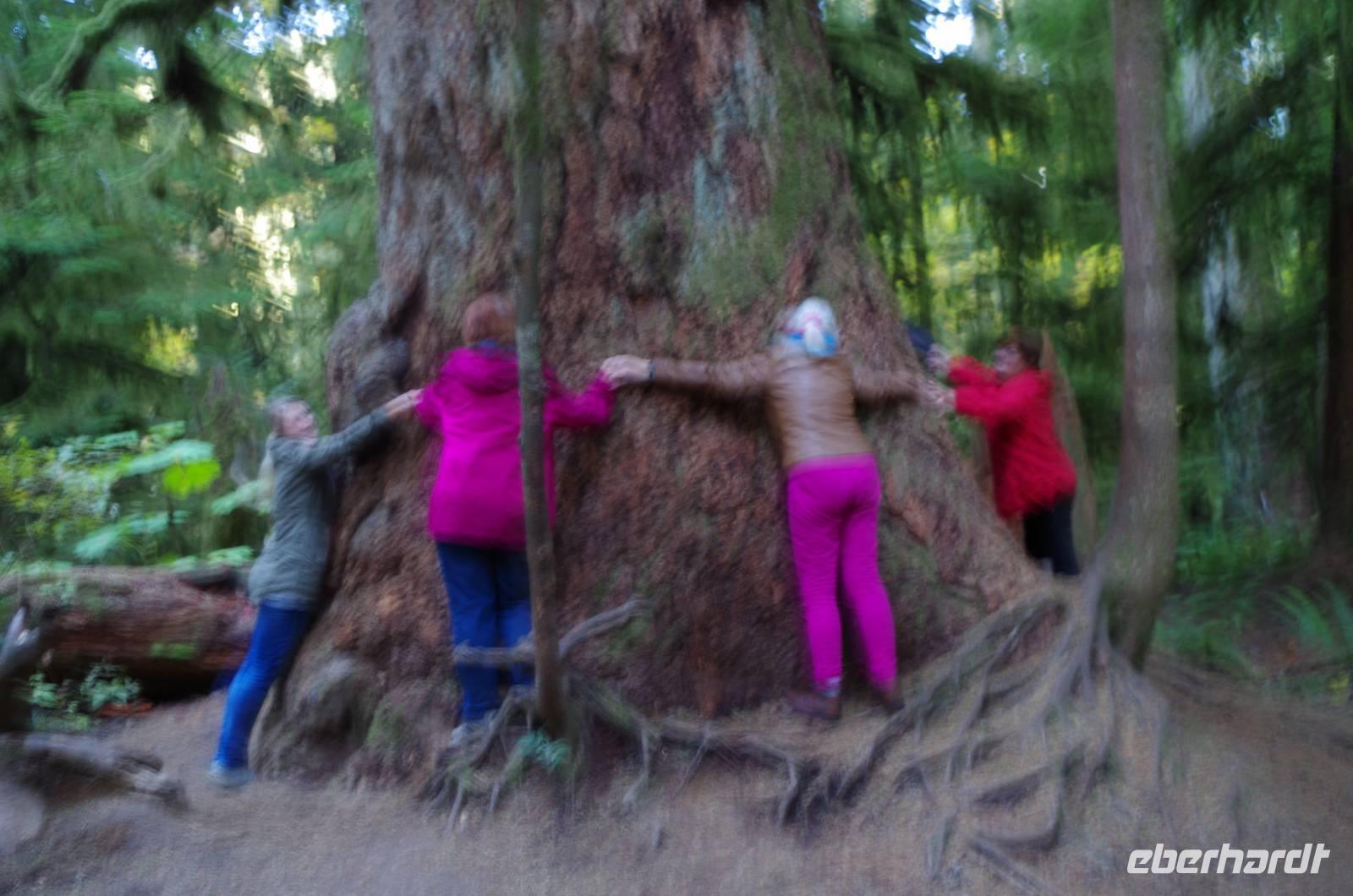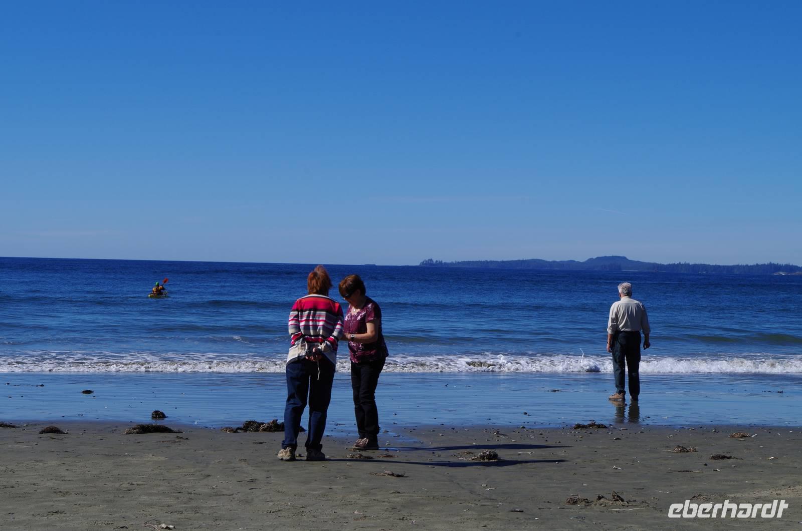 Es erwartete uns ein schönes Wetter mit Sonnenschein. Wir fuhren nach Cooms. In einem urigen Laden mit Ziegen auf dem Dach kauften wir uns etwas zum Mittagessen ein. Vorbei am Cameron Lake und durch den Mac Millen Provinz Park - wo es noch viel Forstwirtschaft gibt, erreichten wir Alberni Valley. Wie setzten unsere Reise durch Wälder und den Vancouver Ilands Mountains fort. Anschließend fuhren wir zum Kennedy Lake und erreichten den Pacifik Rim Nationalpark wo wir im Informations Centrum einen Stopp einlegten. Auf dem Weg nach Tofino sahen wir überall Warnschilder, wir befanden uns im Tsunamigebiet. Nach unserem Aufenthalt in Tofino fuhren wir an den Pazifik. Am Strand stießen wir mit einem Glas Prosecco auf diesen schönen Moment am Strand an. Wir spazierten am Strand entlang und ließen uns die frische Brise um die Nase wehen. Einige Muscheln wurden gesammelt oder es wurde einfach nur gefaulenzt. Ein Höhepunkt bestand noch bevor der Besuch im Cathedral Grove. Der 300 ha große Park ist durch seine über 800 Jahre alte Douglasien bekannt. Auch die größte Tanne mit einem Umfang von 9 m konnten wir bestaunen. Ein sehr schönes Erlebnis in dem naturbelassenen Regenwald zu wandeln.