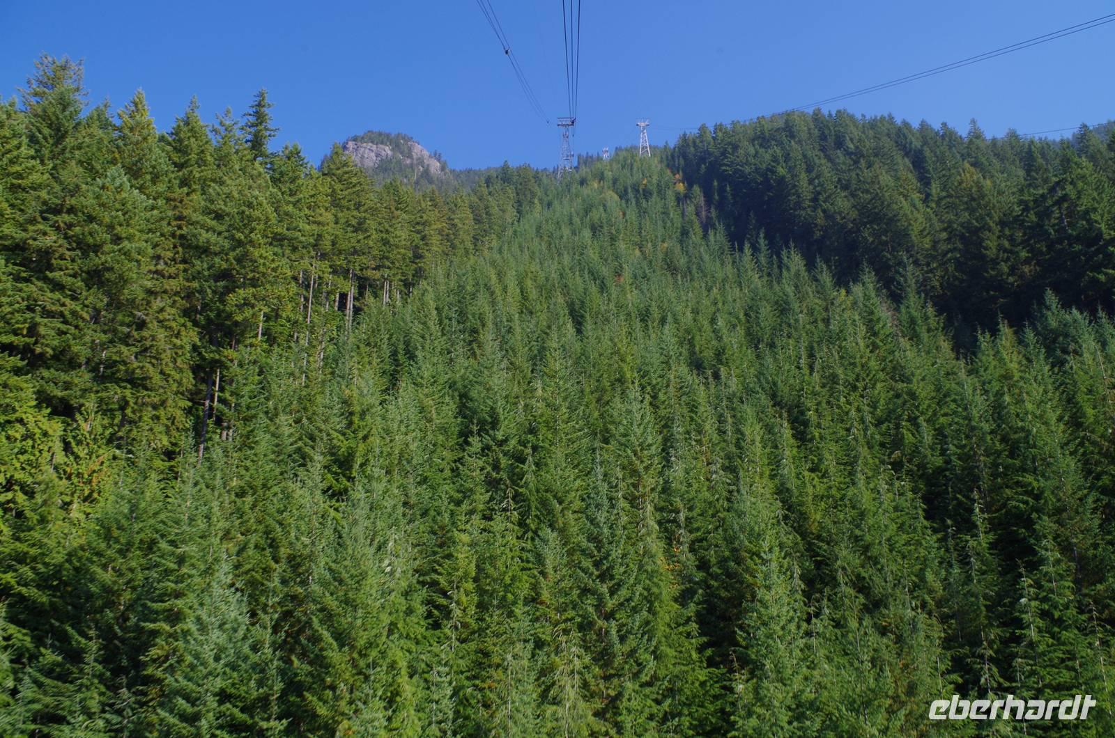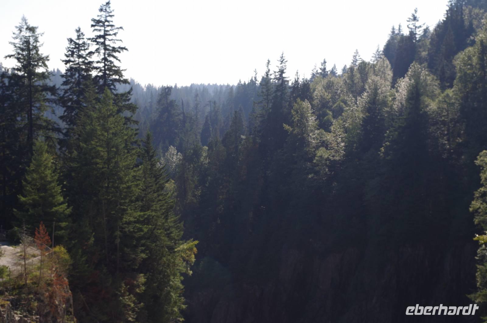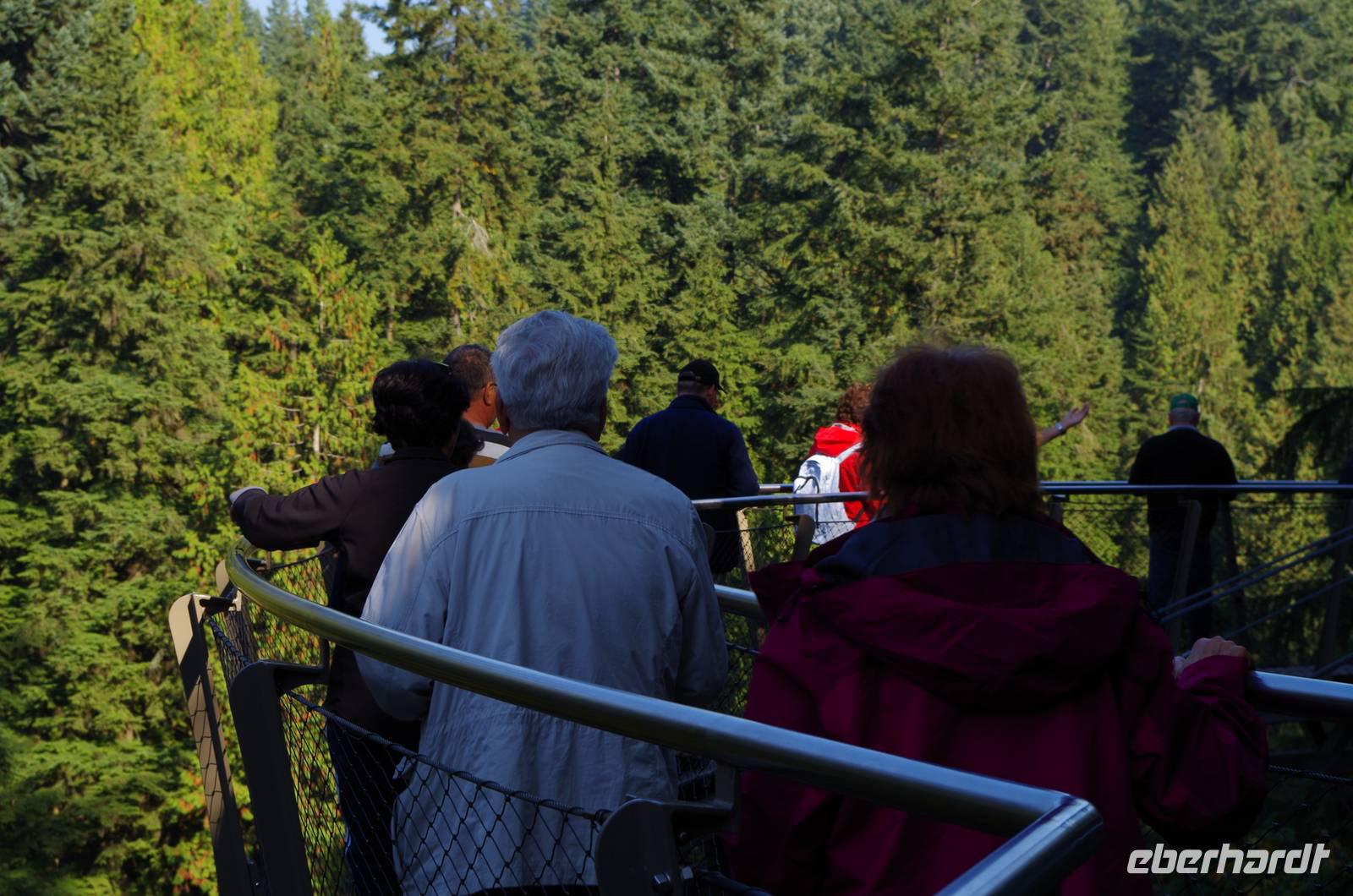 Der heutige Ausflug führte uns in den Norden von Vancouver. Doch erst fuhren wir in den Stenlay Park. An den Totempfählen der Westküsten Indianer legten wir einen Stopp ein und bestaunten die Skyline von Vancouver. Im Anschluss daran besuchten wir den Capilano Suspension Bridge Park. Als erstes überquerten wir mutig die Capilano Suspension Bridge, die längste und höchste Fußgängerhängebrücke der Welt! Es schaukelte schon etwas. Auf dem Baumlehrpfad konnten wir auf sieben Hängebrücken entlang wandeln. Auch den neuen Cliffwalk liefen wir entlang. Anschließend fuhren wir mit Nordamerikas größter Luftseilbahn auf den Hausberg von Vancouver, den Grouse Mountain. Wir genossen bei einem Picknick den Blick über Vancouver. Auch wenn wir schon Schwarzbeeren gesehen haben, fehlte noch der Besuch der Grizzly Bären. Einer der Bären hatte sich im Wald schlafen gelegt. Anschließend besuchten wir die Capilano Salmon Hatchery, eine Lachszuchtanstalt, wo der Lebenskreis der Lachse demonstriert wird. Über eine Lachstreppe überwinden die Lachse die Stromschnellen und springen Stromaufwärts. Ein ereignisreicher Tag in Vancouver ging zu Ende.