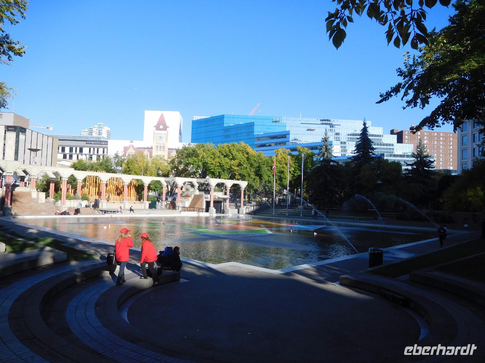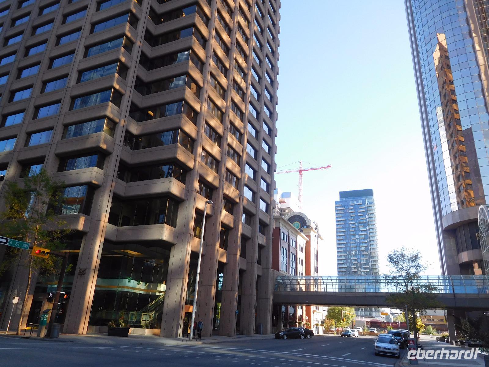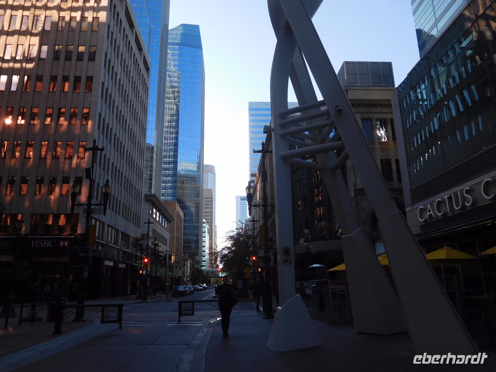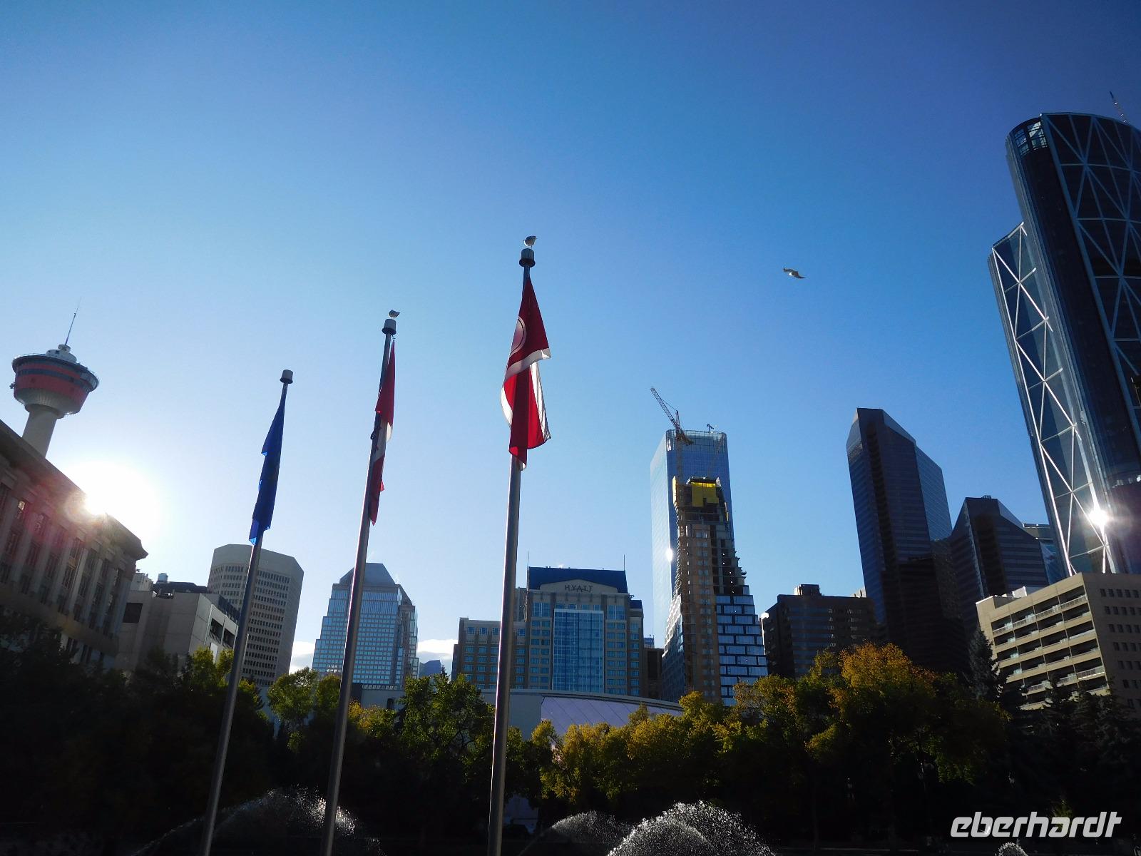 Marion, unsere Reiseleiterin für die nächsten Tage, empfing uns herzlich und fuhr mit uns zum zentral gelegenen Hotel. Wer wollte, den lud sie zu einem kurzen Stadtspaziergang entlang der Stephen Avenue bis zum Olympic Plaza - und zurück - ein. Der strahlend blaue Himmel und die vielen Eindrücke sorgten dafür, dass wir die aufkommende Müdigkeit leicht bekämpfen konnten.