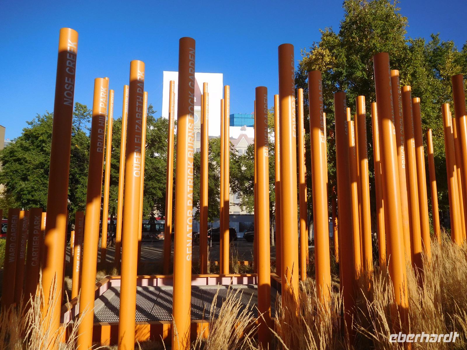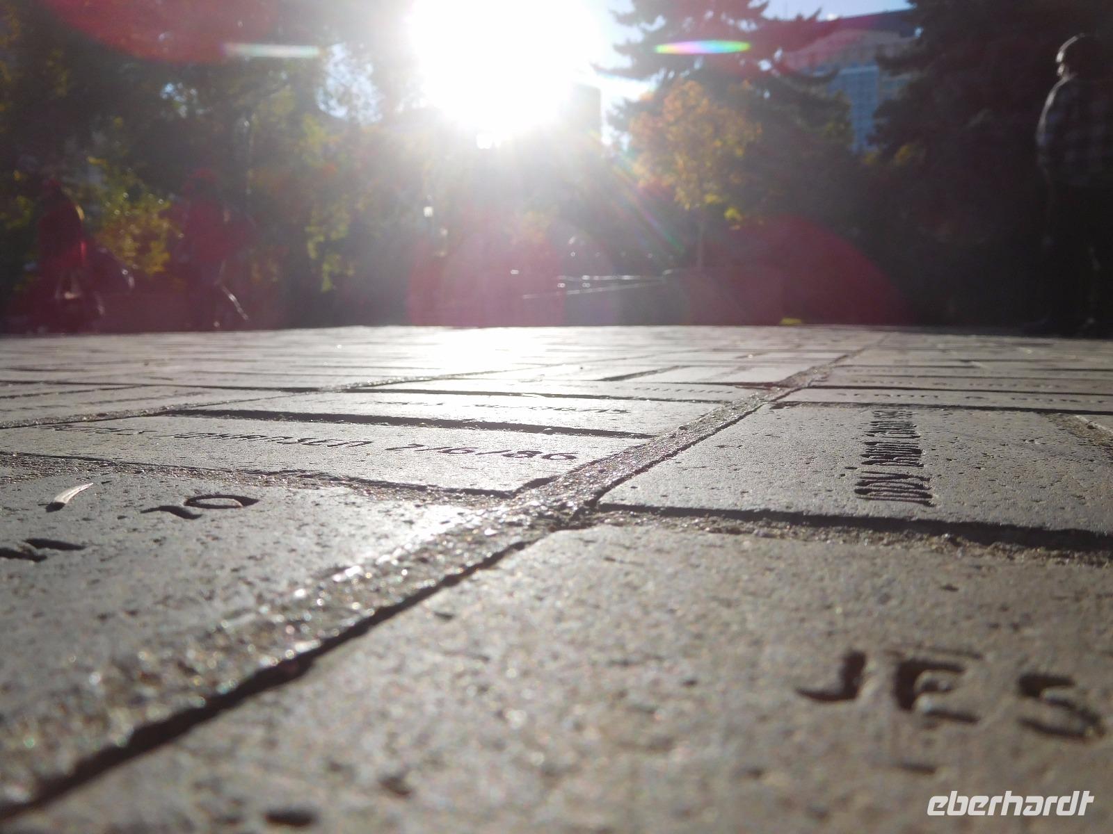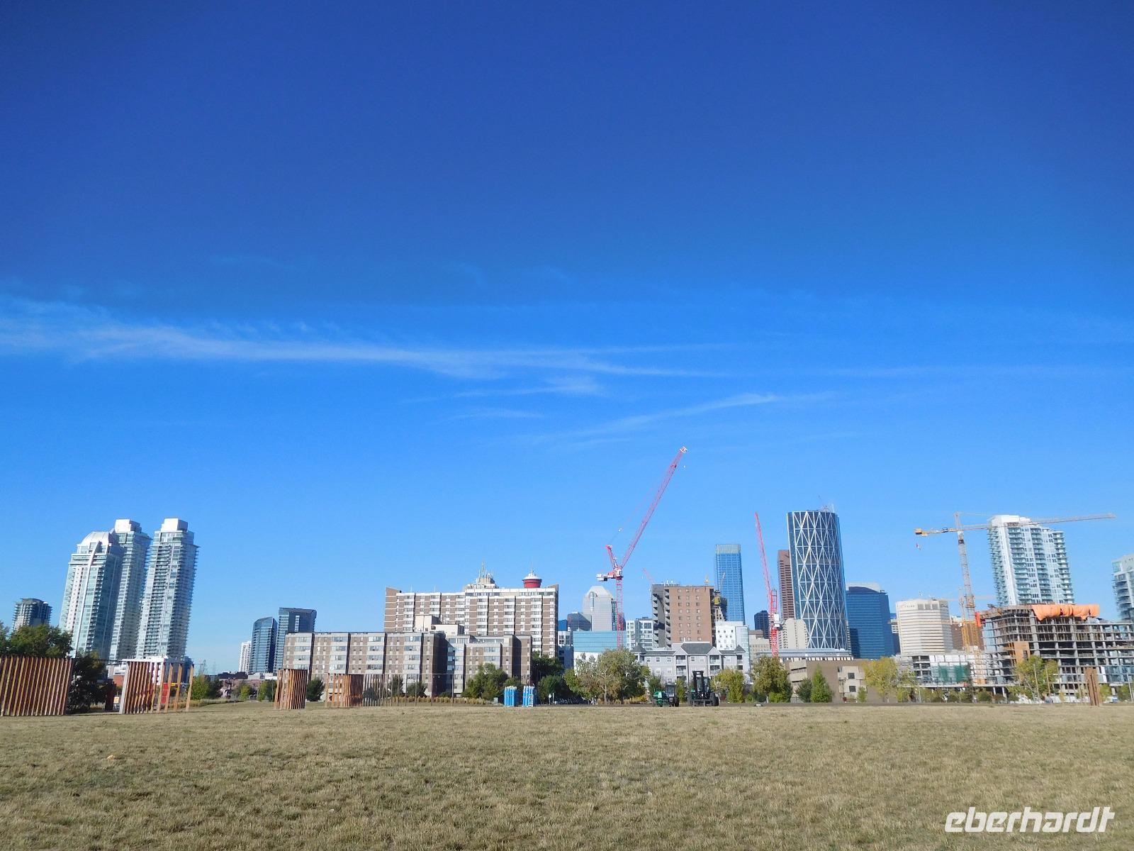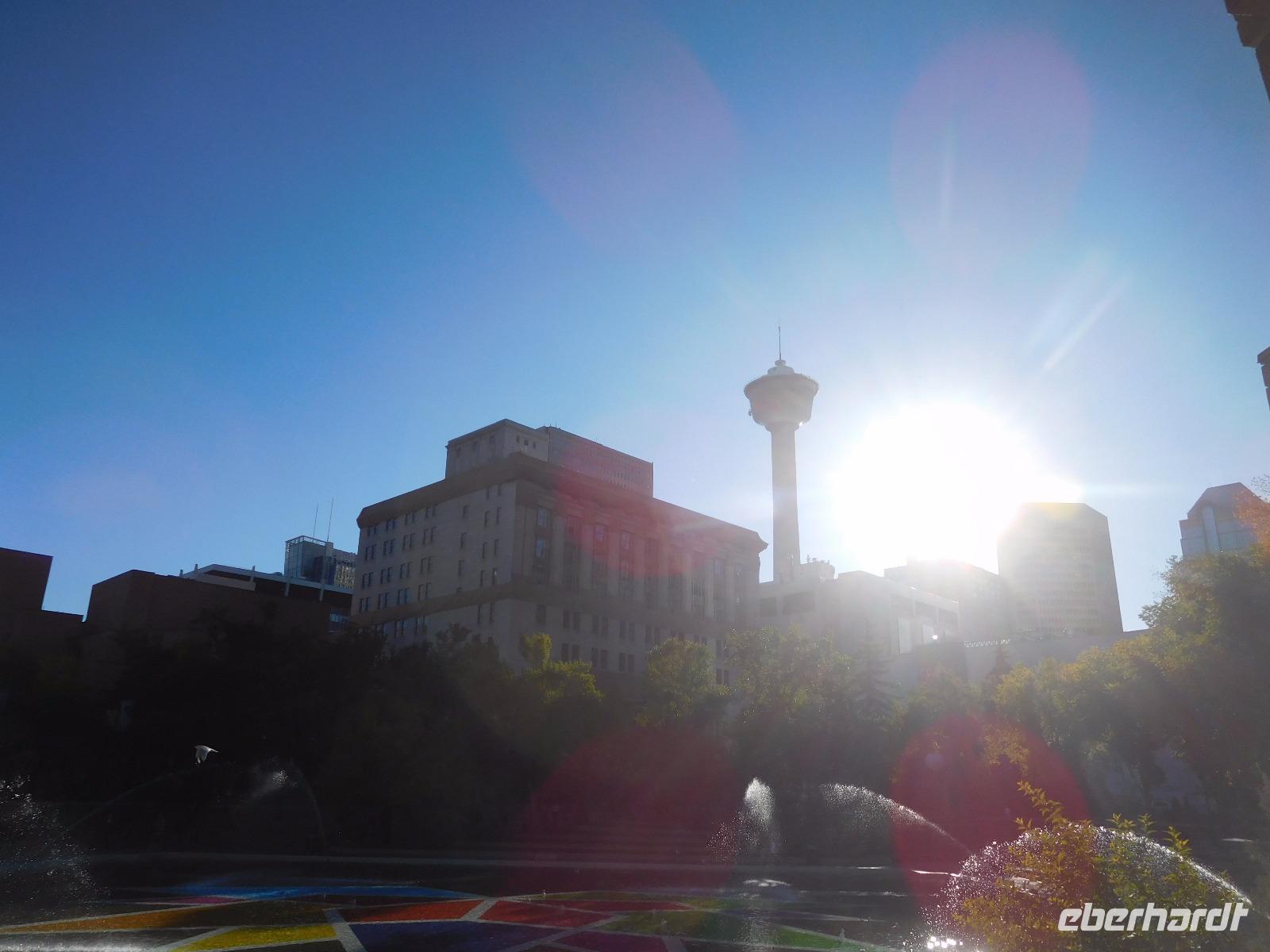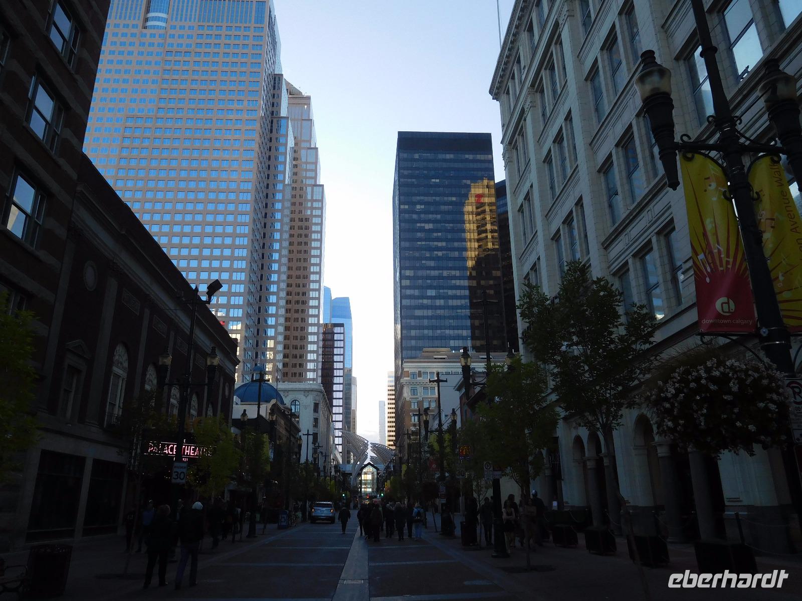 Marion, unsere Reiseleiterin für die nächsten Tage, empfing uns herzlich und fuhr mit uns zum zentral gelegenen Hotel. Wer wollte, den lud sie zu einem kurzen Stadtspaziergang entlang der Stephen Avenue bis zum Olympic Plaza - und zurück - ein. Der strahlend blaue Himmel und die vielen Eindrücke sorgten dafür, dass wir die aufkommende Müdigkeit leicht bekämpfen konnten.