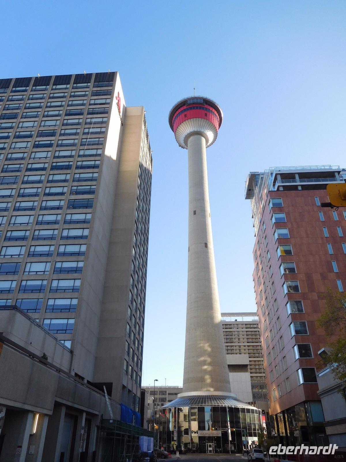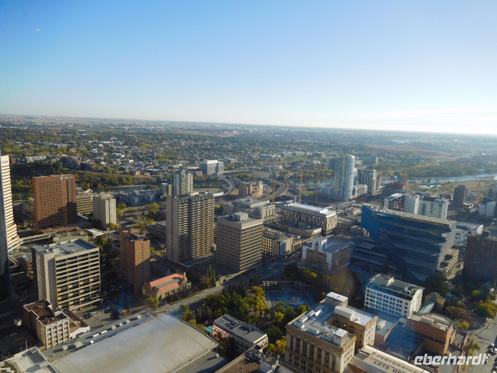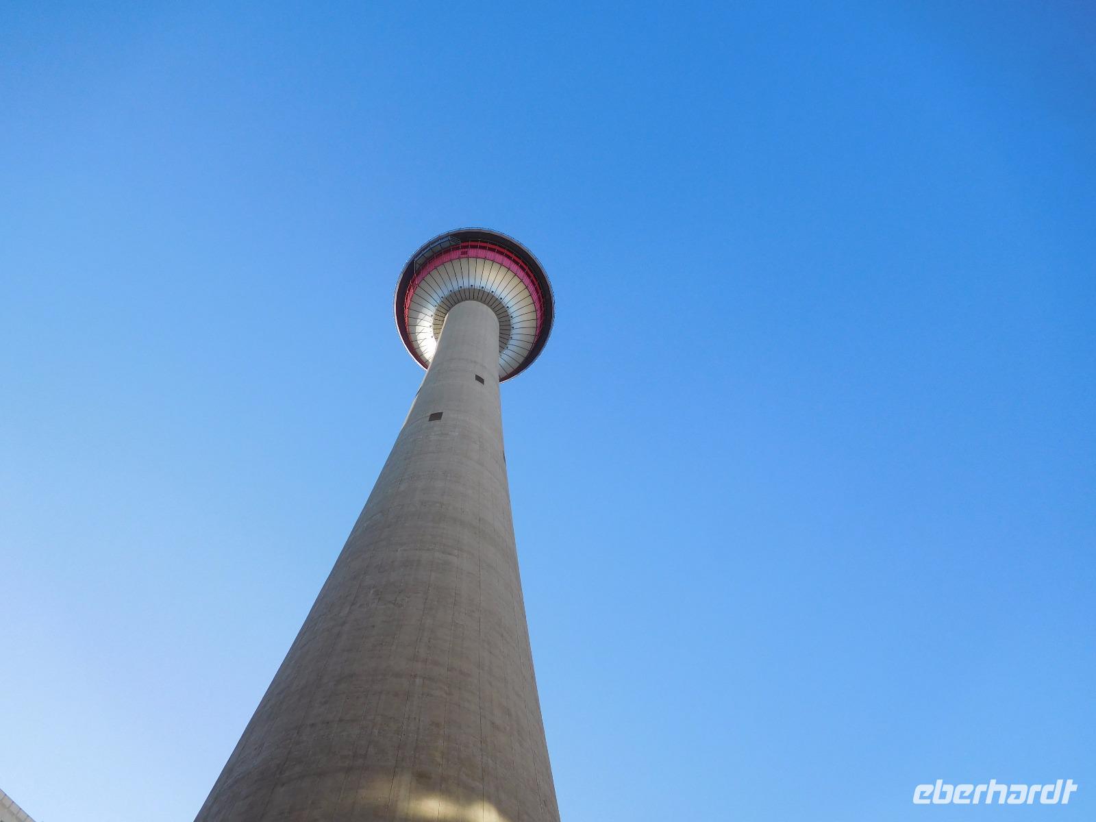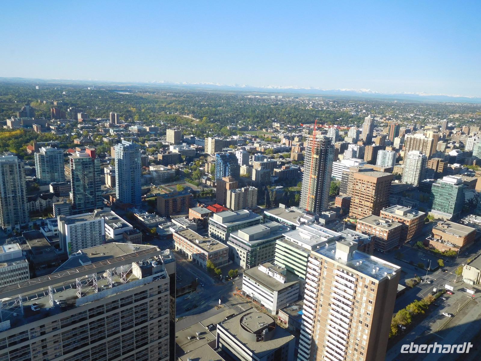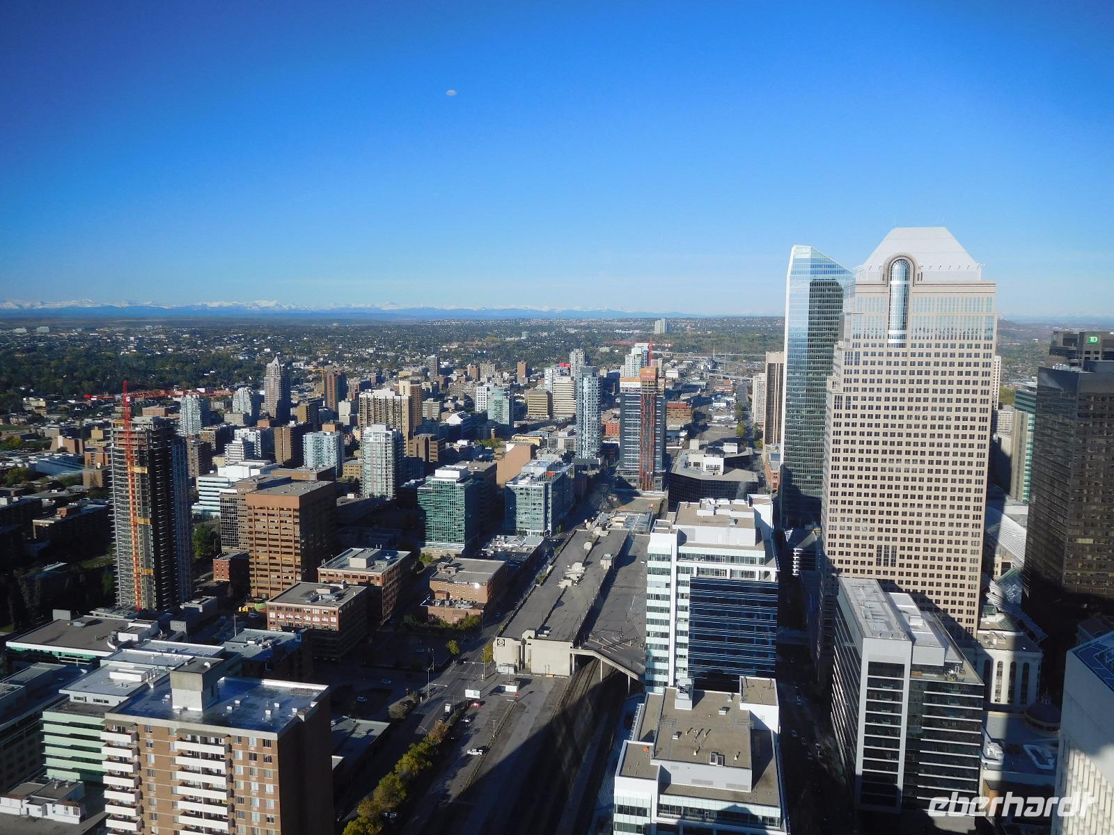 Für die meisten war dank Jet Lags die Nacht nur kurz, aber die Sonne über Calgary weckte die Lebensgeister. Als erste überhaupt waren wir beim Calgary Tower, auf dem 1988 zu den Olympischen Winterspielen die bis dato höchste Olympische Fackel gebrannt hatte, und fuhren hinauf. Hier eröffnete sich ein fantastische Blick über die umliegende Stadt und weit darüber hinaus - am Horizont lockten uns schon die schneebedeckten Gipfel der Rocky Mountains!