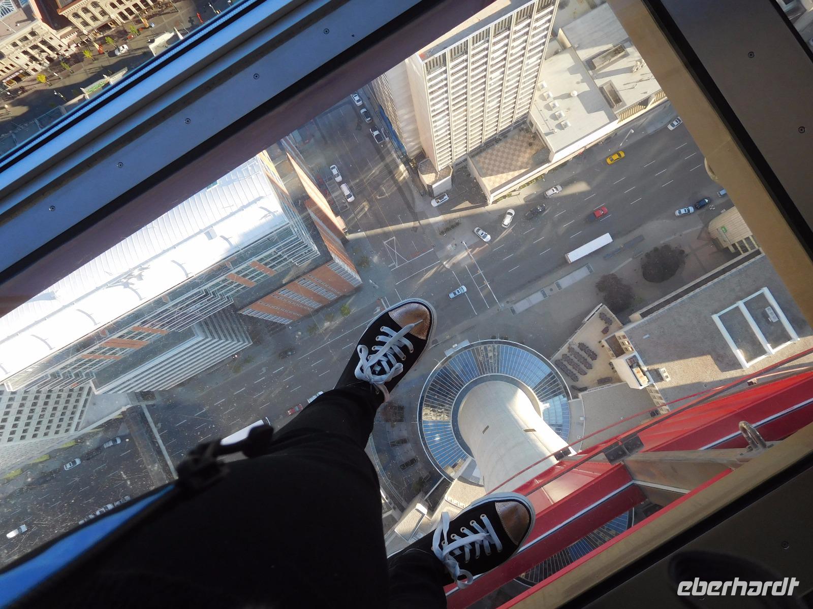 Nur eine kleine Herausforderung war der gläserne Boden auf der Aussichtsplattform. Nach kürzestem Zögern hatten wir alle ein Foto von uns über der Stadt schwebend.