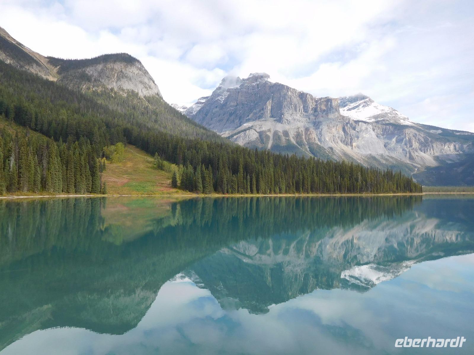 Die Farbe des smaragdgrünen Emerald Lake konnten wir noch so akzeptieren. Wunderschön spiegelten sich hier die umliegenden Berggipfel im klaren Wasser und verbreiteten eine magische Idylle, in der wir gern verweilen wollten.