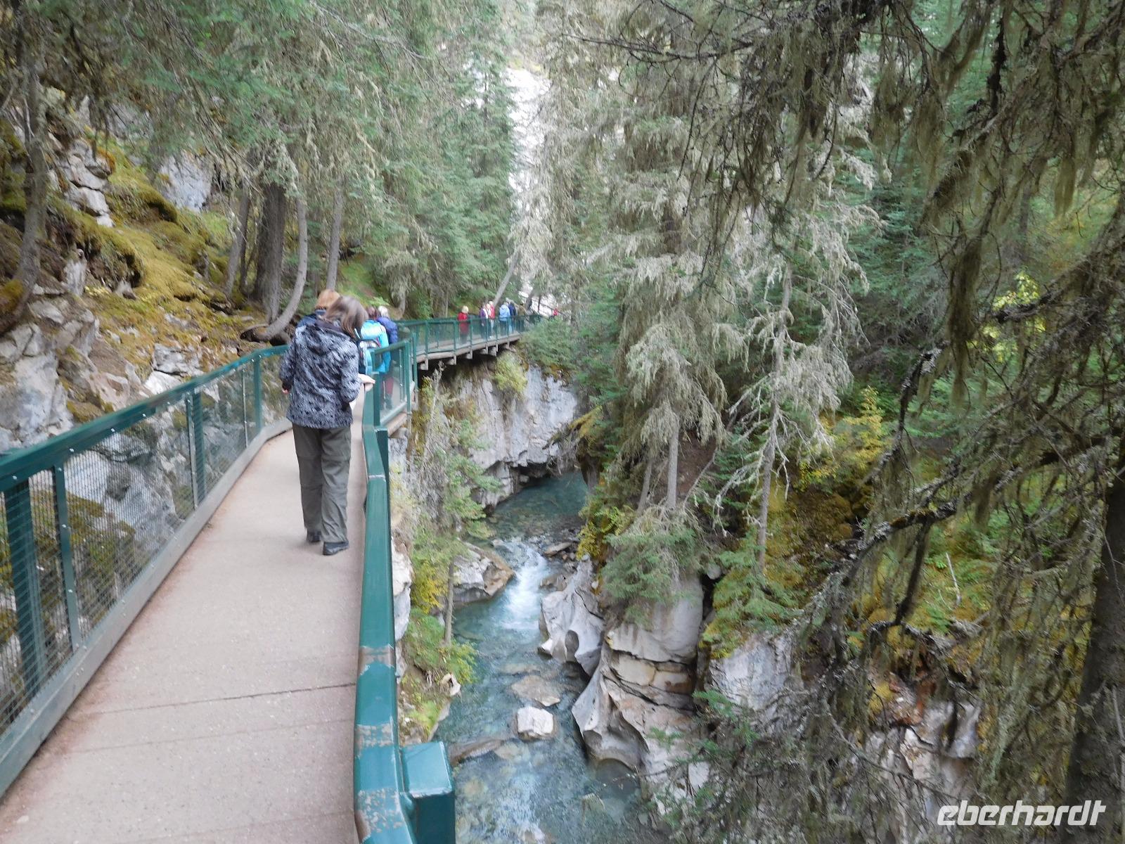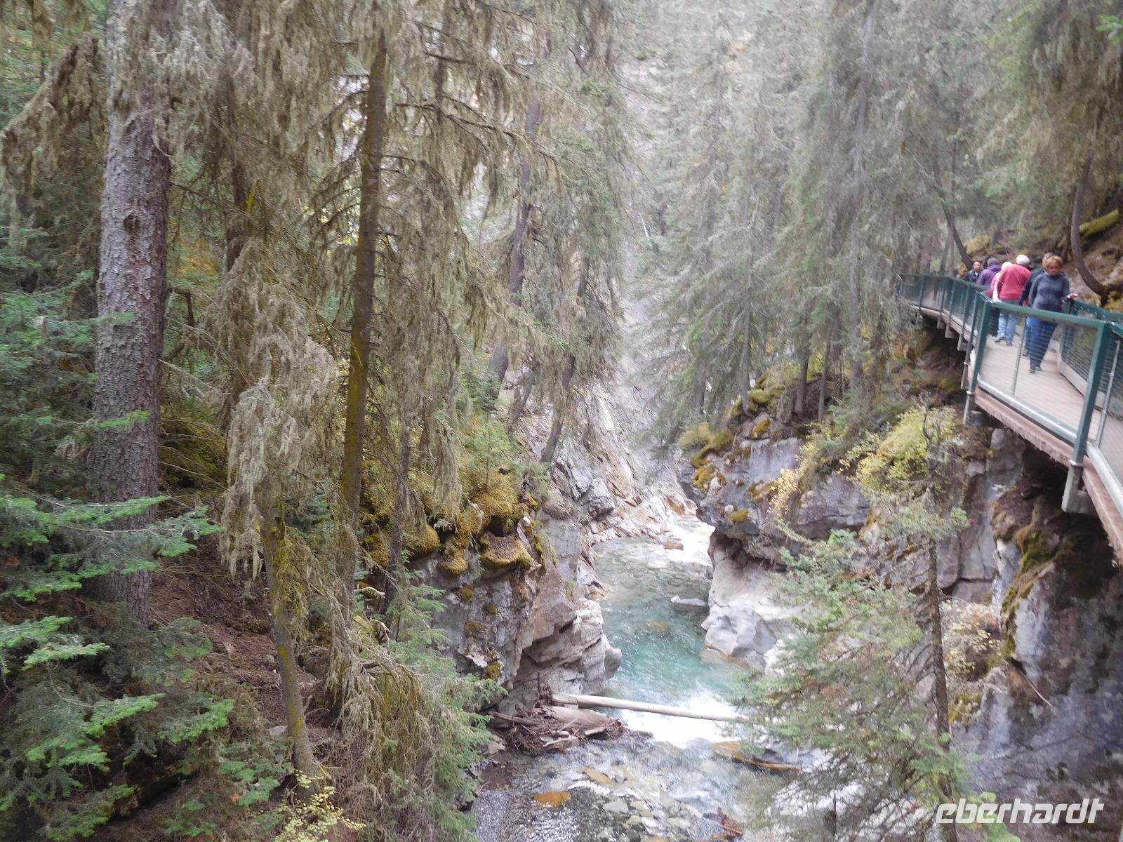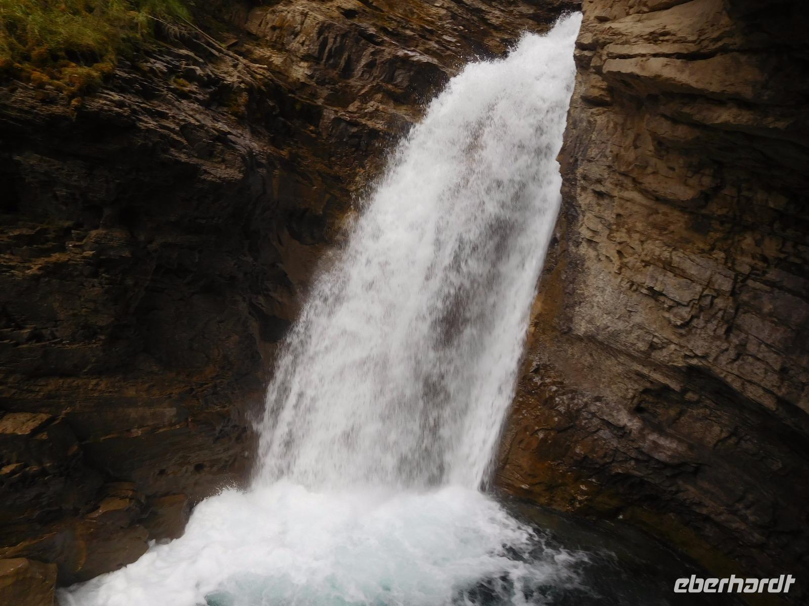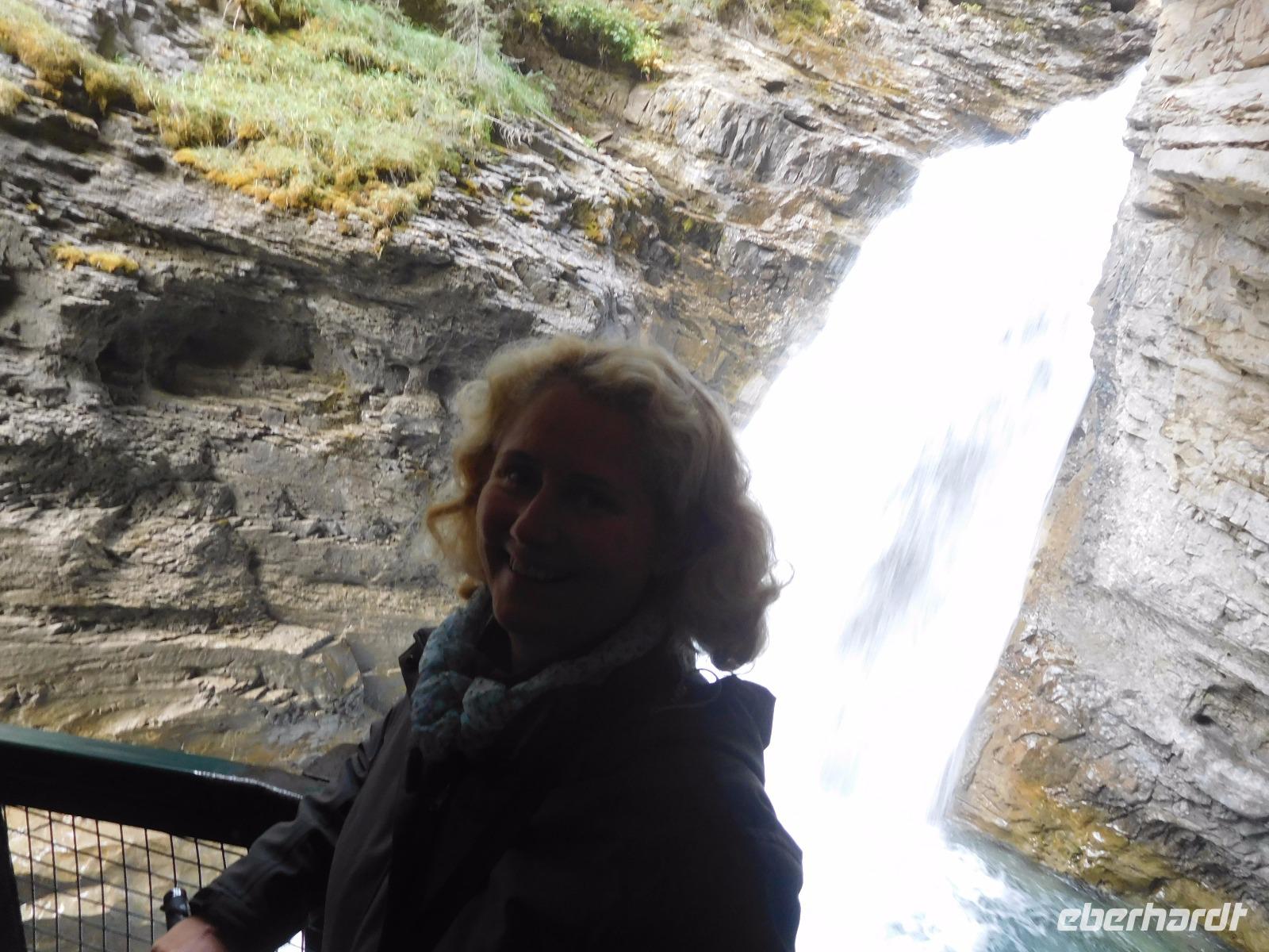 Eisige Erlebnisse standen heute auf dem Programm - bevor wir aber unsere Reise entlang der schönsten Gletscher der kanadischen Rocky Mountains antraten, spazierten wir den Johnston Canyon zum Wasserfall hinunter. Auch hier war die Wasserfarbe unglaublich intensiv smaragdgrün. Durch einen kleinen Tunnel hindurch konnten wir dem Wasser ganz nah kommen.