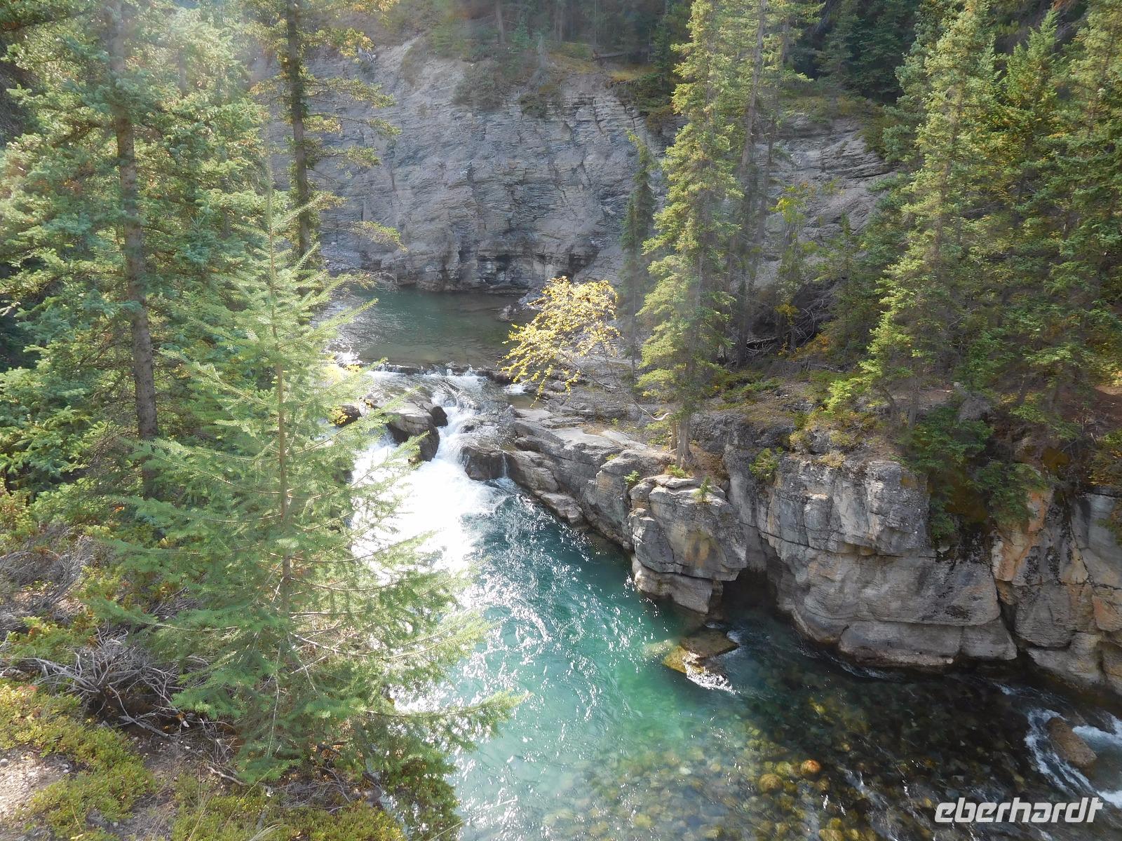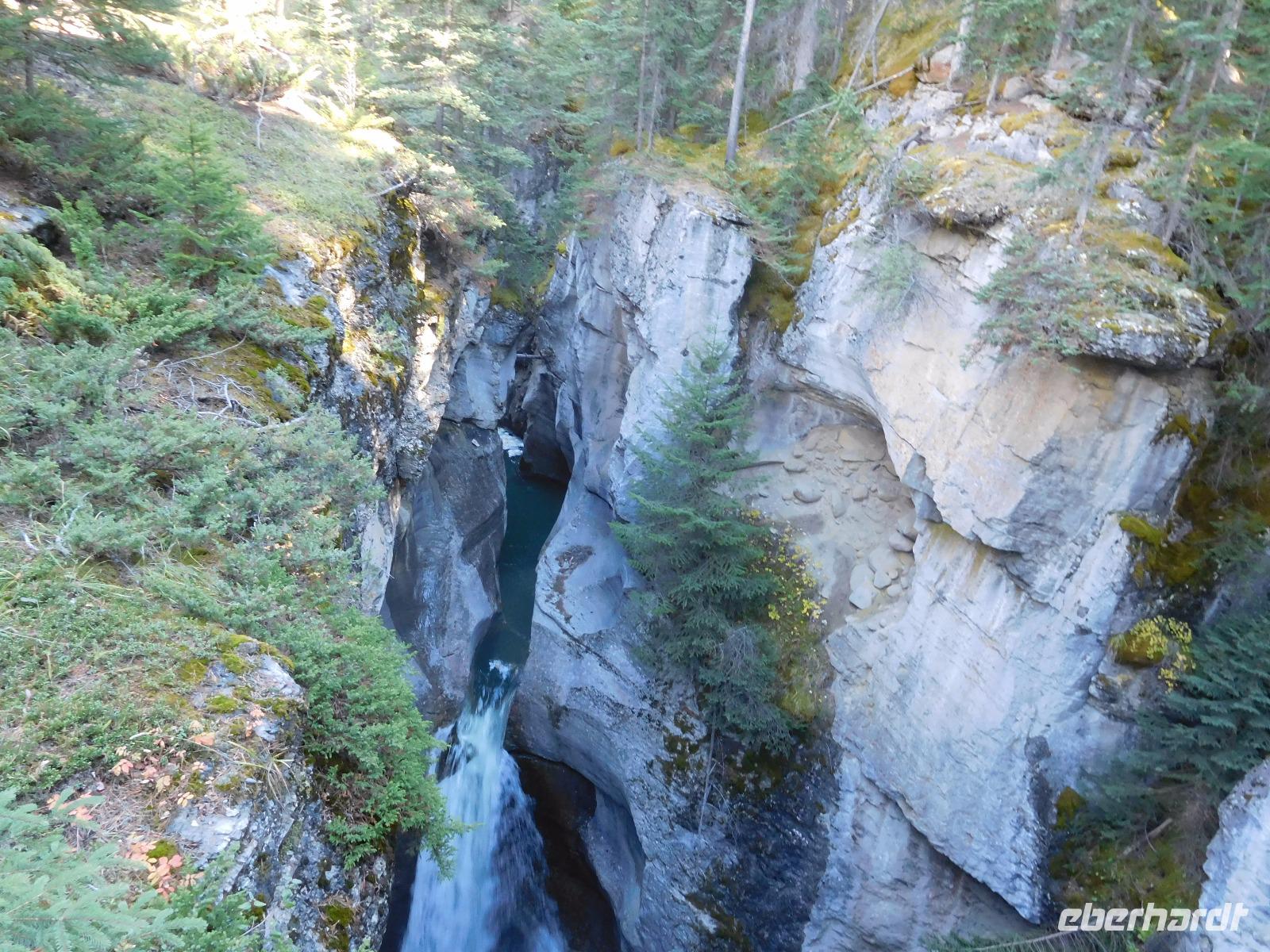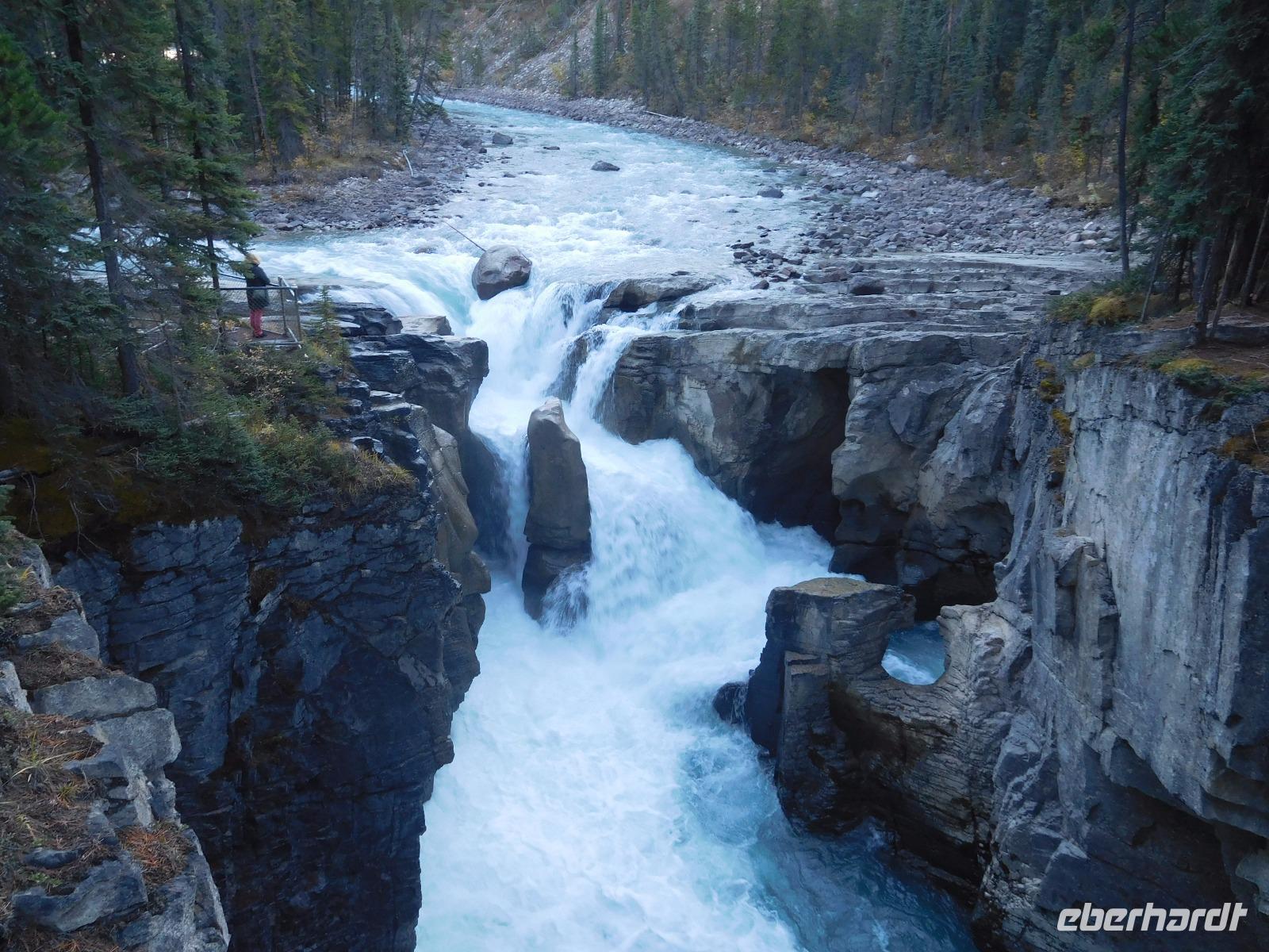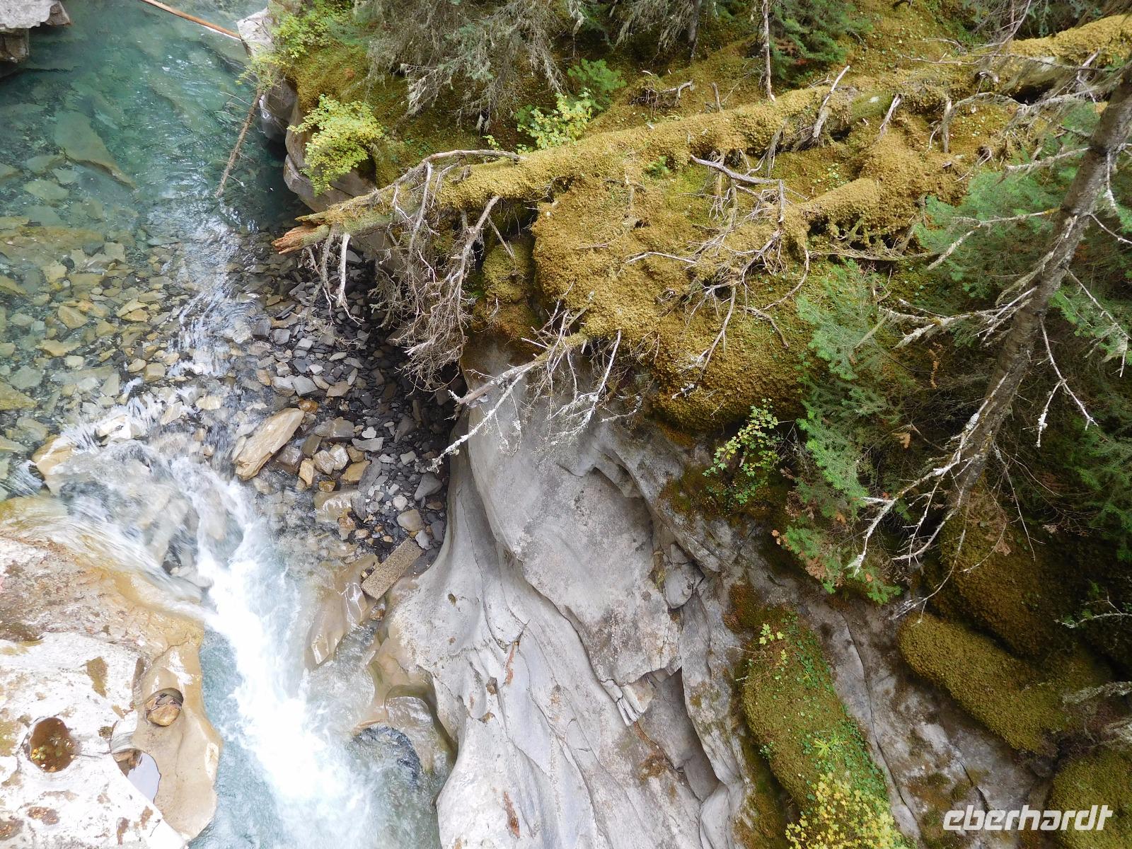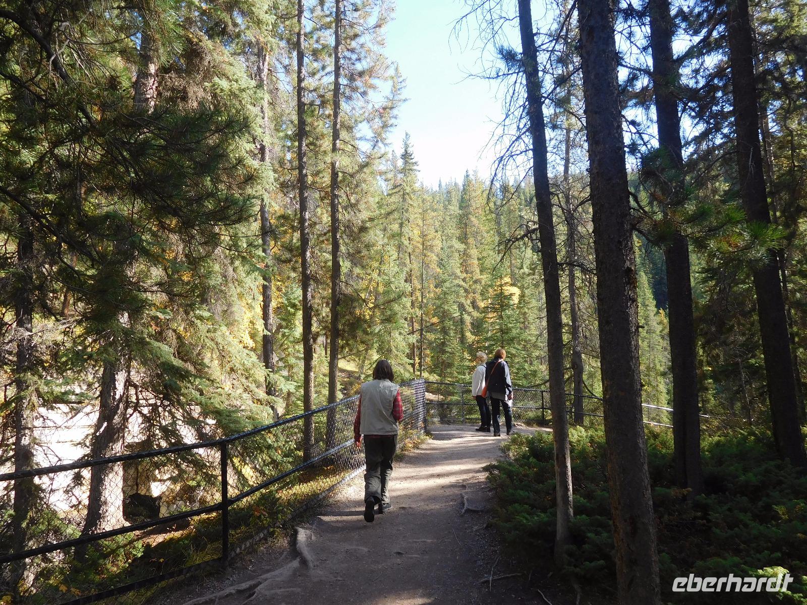 Eisige Erlebnisse standen heute auf dem Programm - bevor wir aber unsere Reise entlang der schönsten Gletscher der kanadischen Rocky Mountains antraten, spazierten wir den Johnston Canyon zum Wasserfall hinunter. Auch hier war die Wasserfarbe unglaublich intensiv smaragdgrün. Durch einen kleinen Tunnel hindurch konnten wir dem Wasser ganz nah kommen.