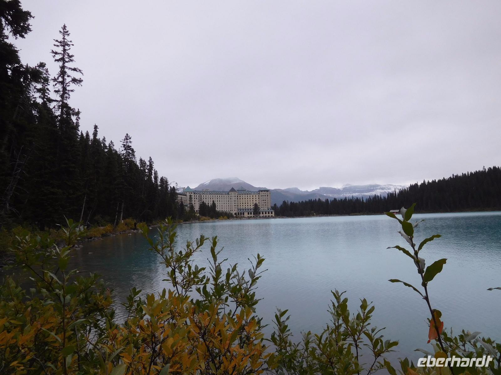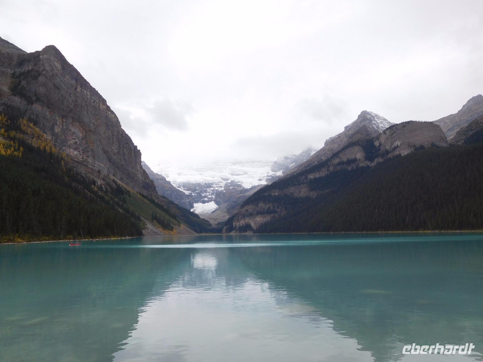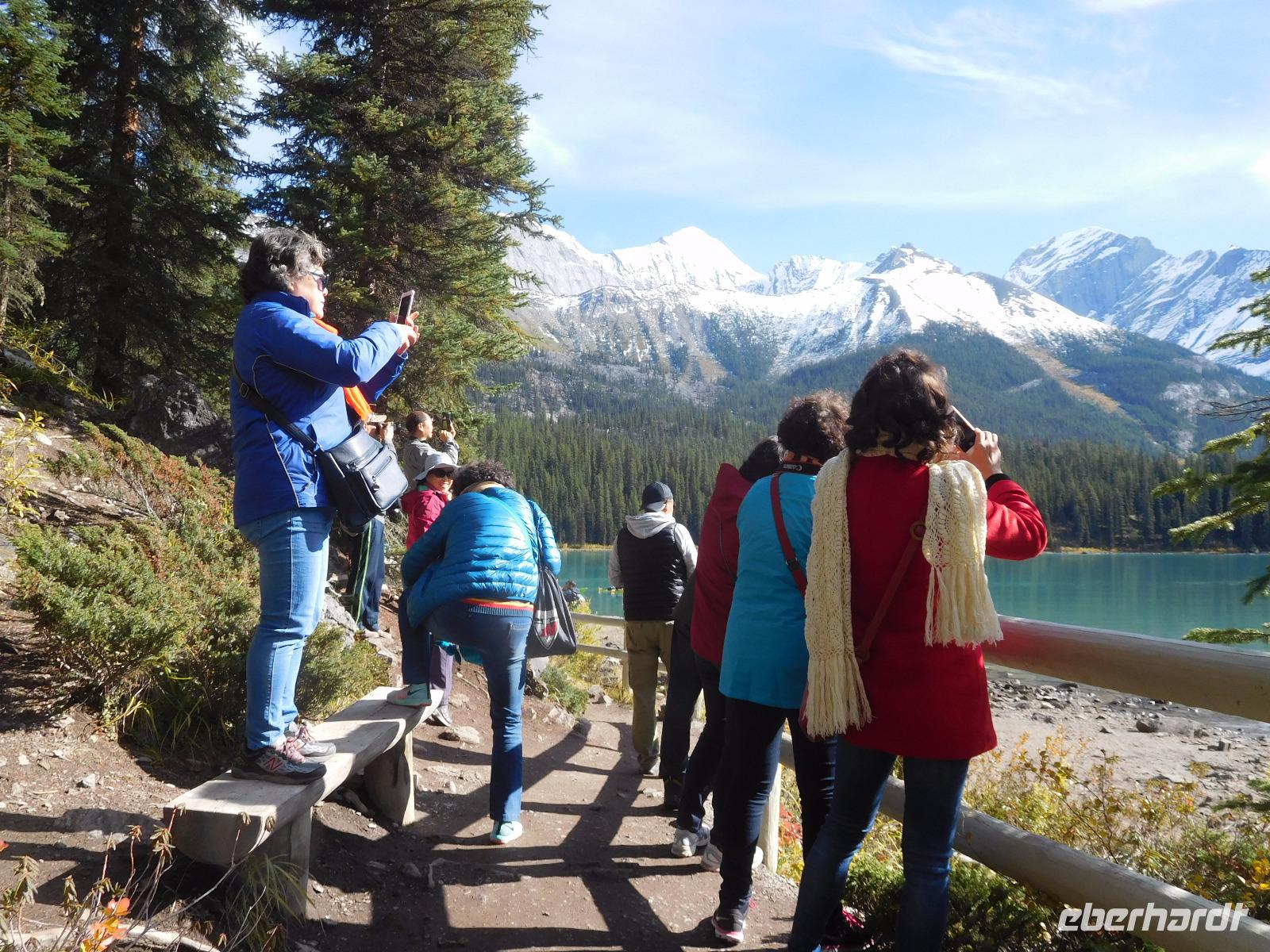 Auf dem Weg zum nächsten Naturwunder kam uns ein ungewolltes Abenteuer dazwischen: Kurz war die Weiterfahrt in unserem Bus nicht möglich. Der Schreck hielt aber länger an als die Pause, sodass wir uns schon wieder auf das unglaubliche Spektakel konzentrieren konnten. Der tiefblaue Lake Louise, an dessen Ende ein Gletscher kühle Würde ausstrahlte. Dem gegenüber trutzte das Fairmont Chateau Lake Louise, das die gesamte Szene dominierte und, wenn es nach uns ginge, gern hätte etwas kleiner gebaut werden können.