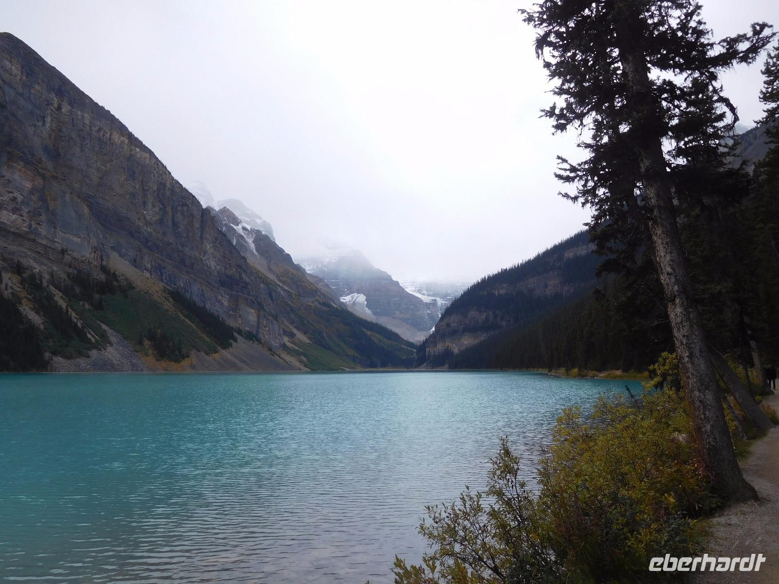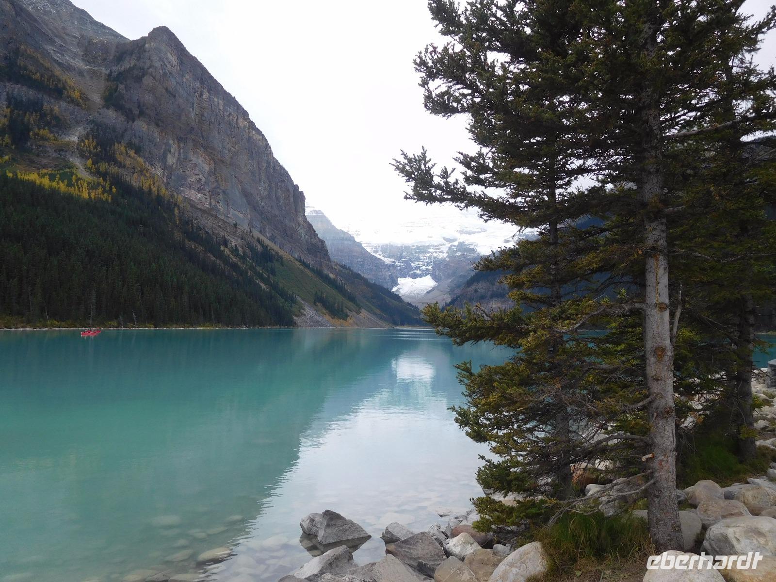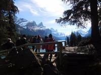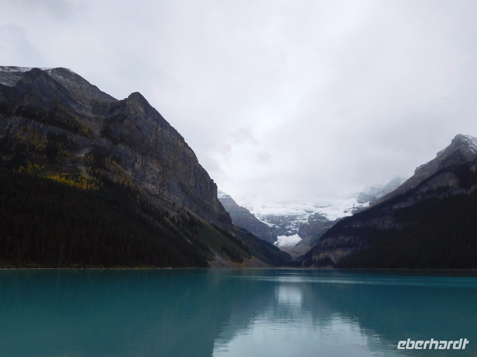 Auf dem Weg zum nächsten Naturwunder kam uns ein ungewolltes Abenteuer dazwischen: Kurz war die Weiterfahrt in unserem Bus nicht möglich. Der Schreck hielt aber länger an als die Pause, sodass wir uns schon wieder auf das unglaubliche Spektakel konzentrieren konnten. Der tiefblaue Lake Louise, an dessen Ende ein Gletscher kühle Würde ausstrahlte. Dem gegenüber trutzte das Fairmont Chateau Lake Louise, das die gesamte Szene dominierte und, wenn es nach uns ginge, gern hätte etwas kleiner gebaut werden können.