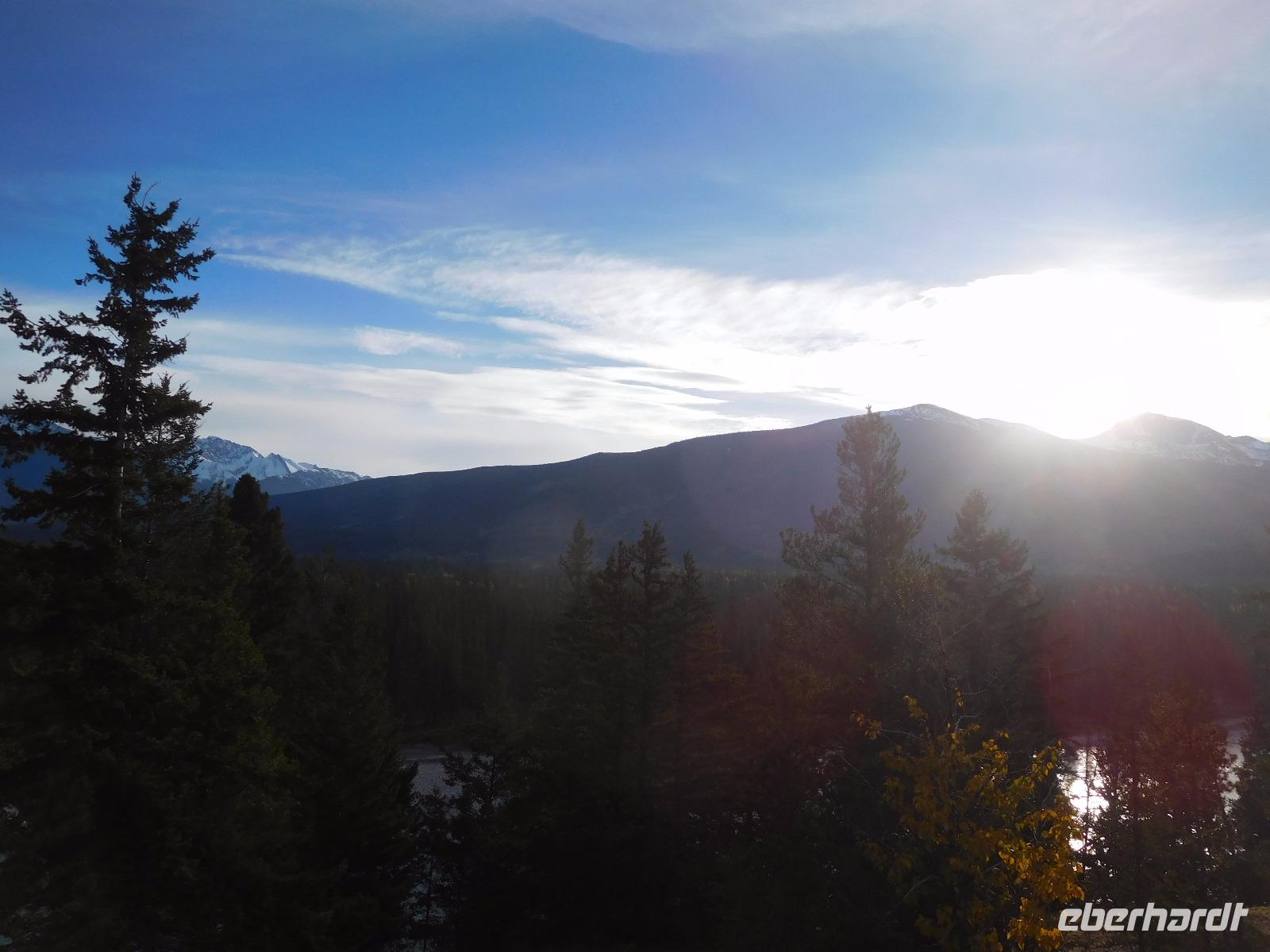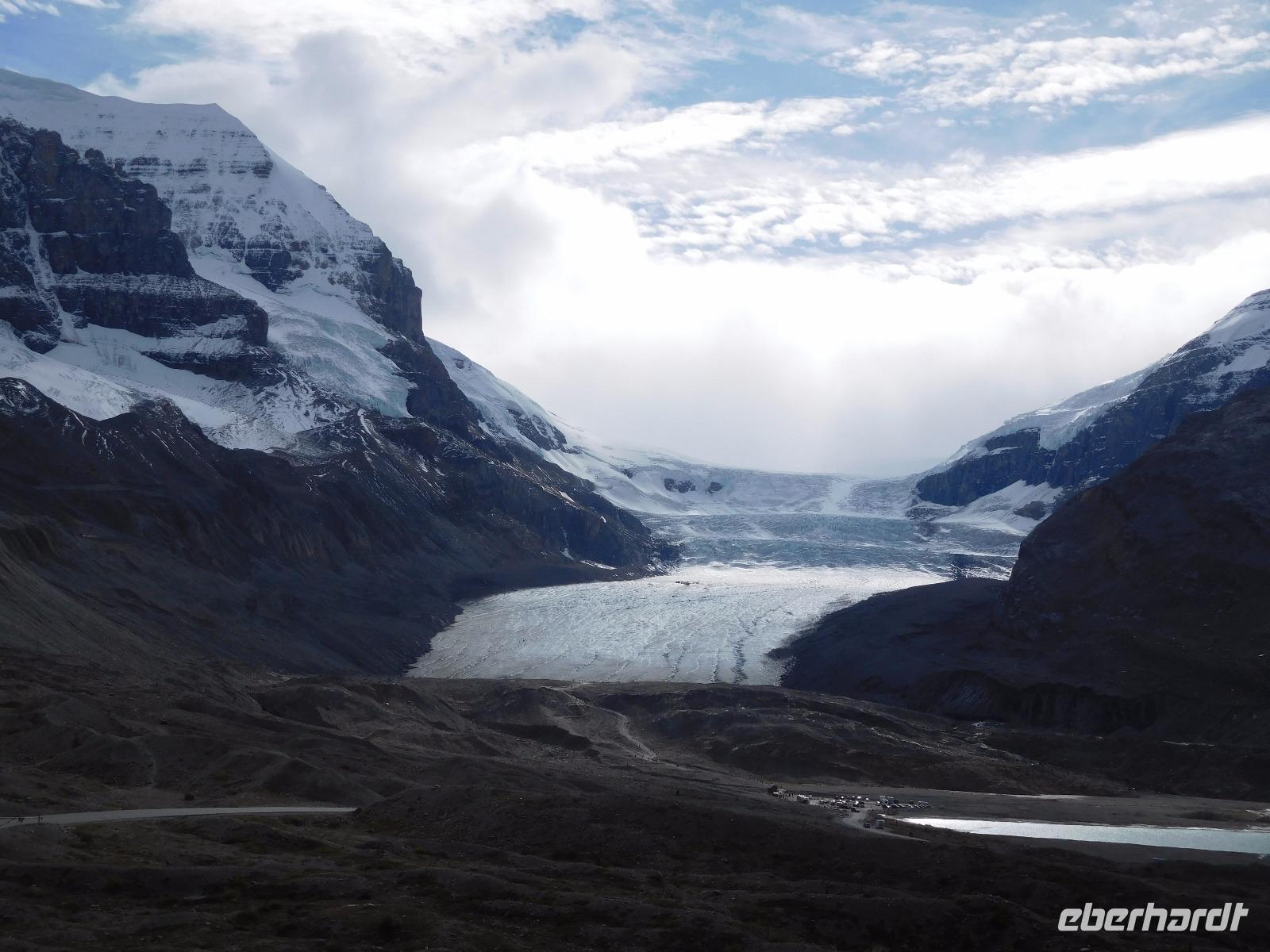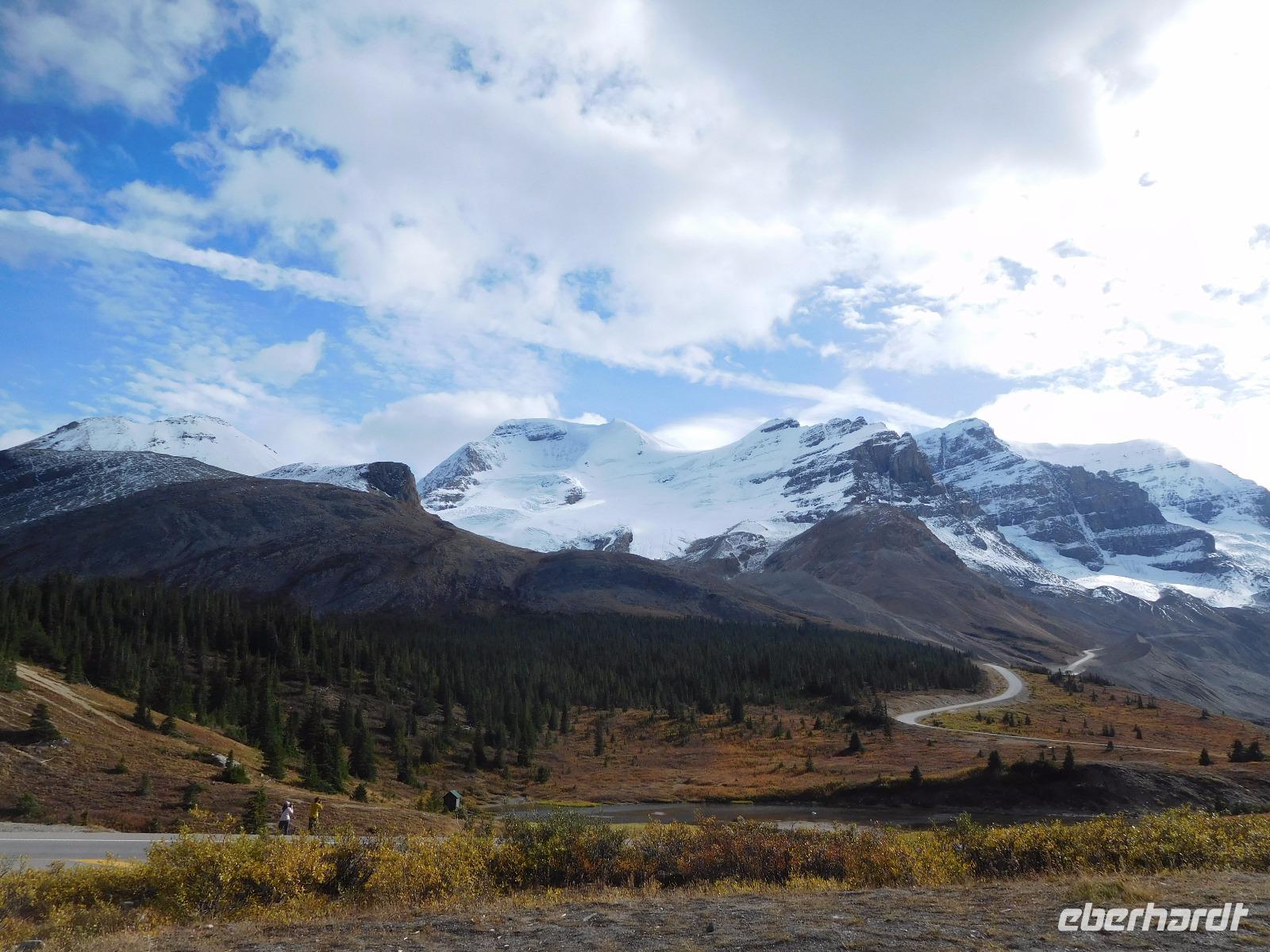 Weiter fuhren wir durch strahlendsten Sonnenschein den Icefield Parkway entlang, um beim nächsten Stopp das Columbia Icefield aus Entfernung zu bestaunen. Die gleißende Sonne machte es uns fast unmöglich, die Gletscherzunge zwischen den Gipfeln auszumachen.