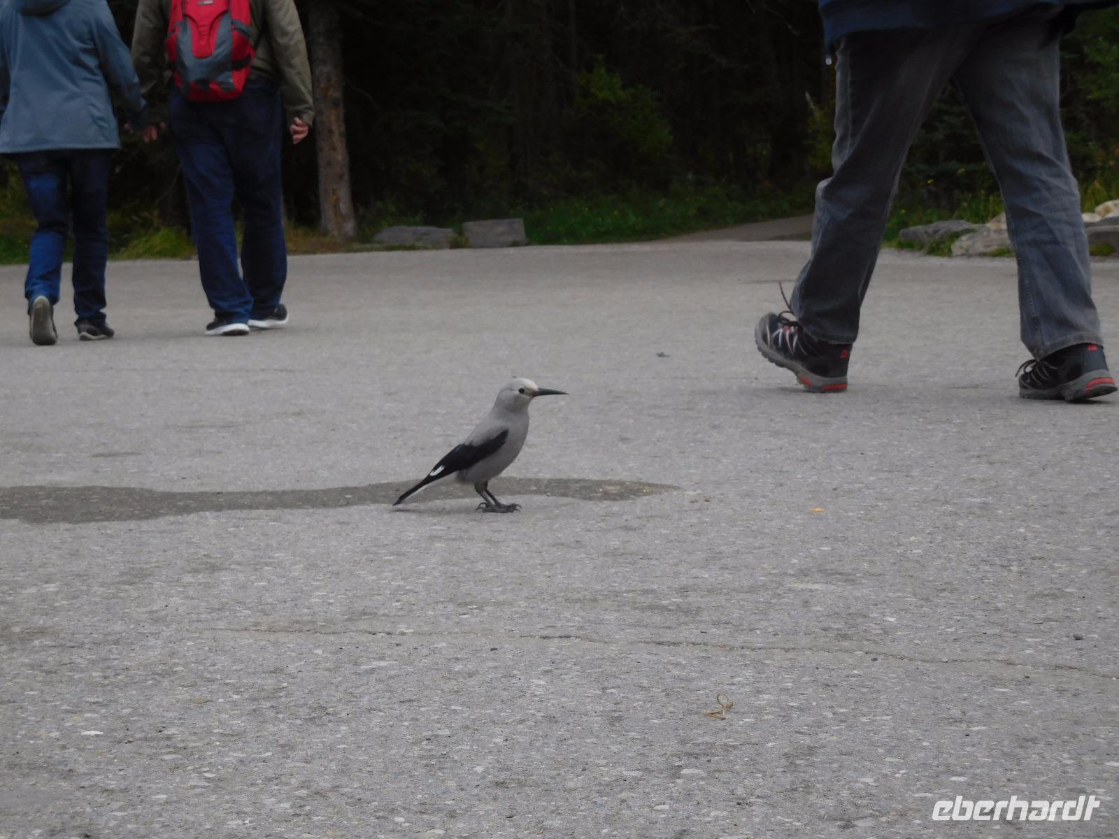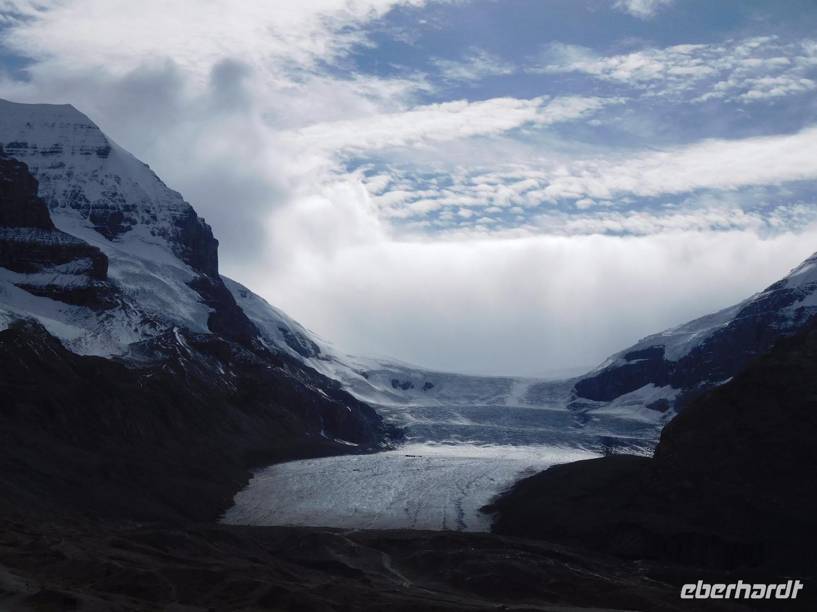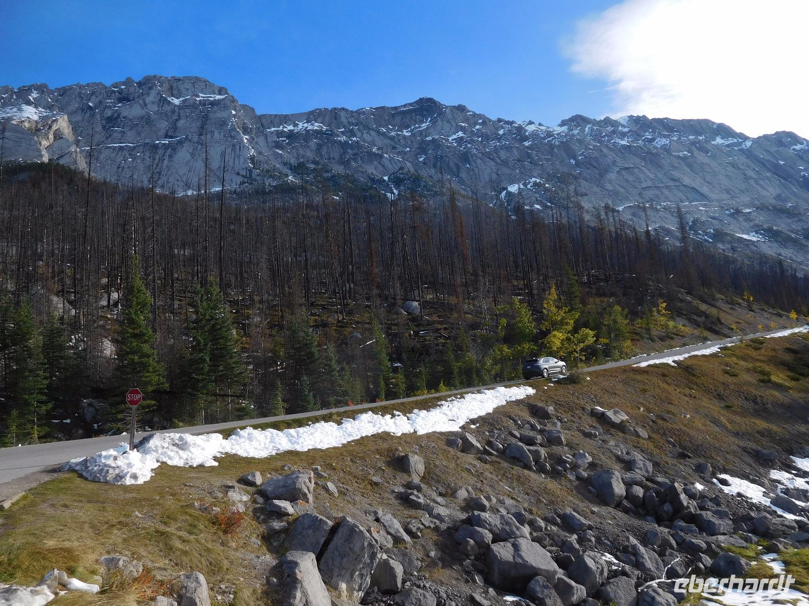 Weiter fuhren wir durch strahlendsten Sonnenschein den Icefield Parkway entlang, um beim nächsten Stopp das Columbia Icefield aus Entfernung zu bestaunen. Die gleißende Sonne machte es uns fast unmöglich, die Gletscherzunge zwischen den Gipfeln auszumachen.