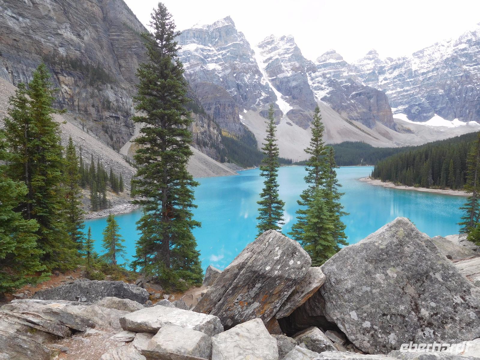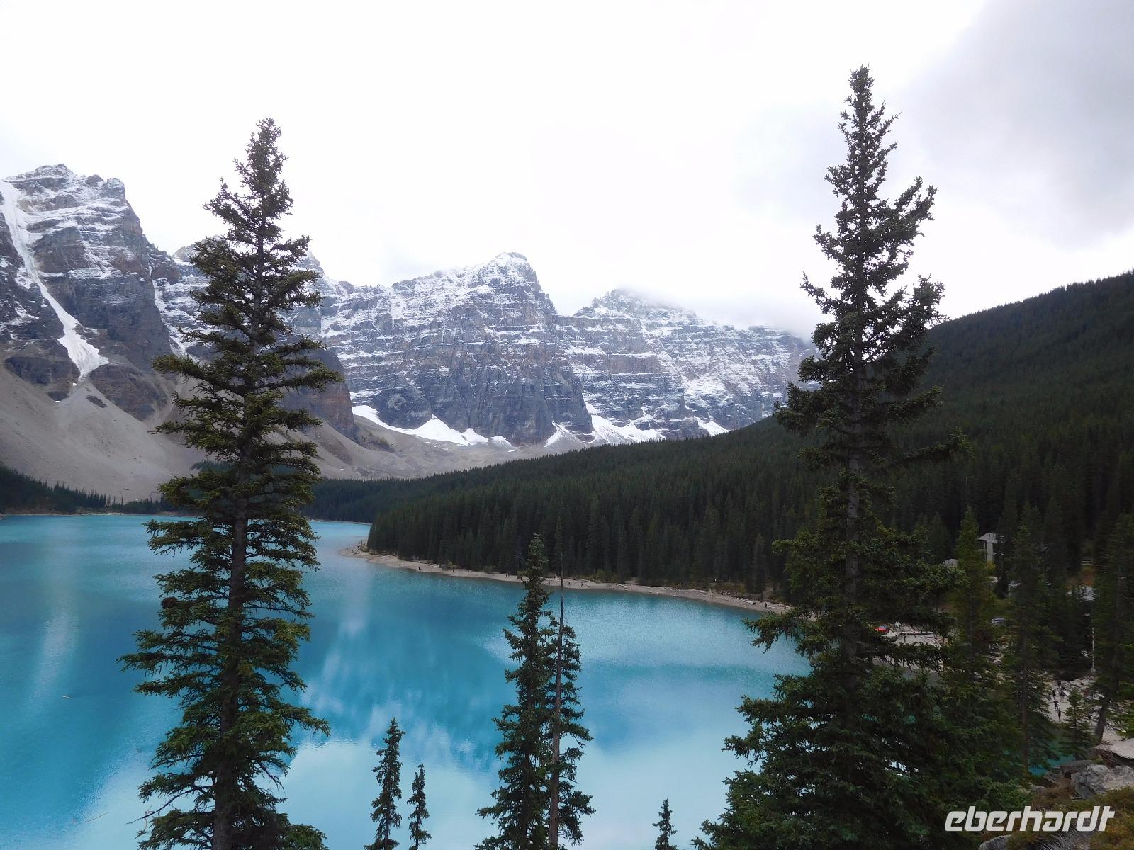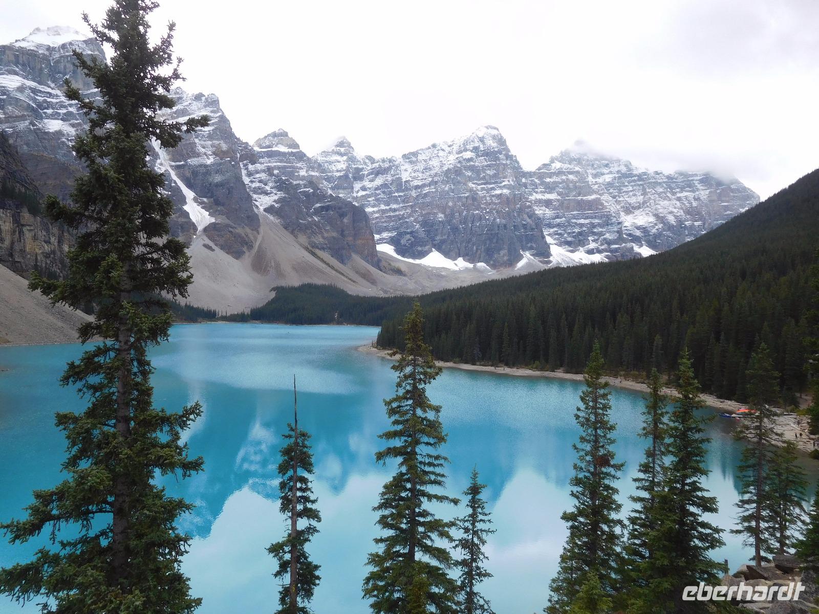 So weit war alles beeindruckend und wunderschön gewesen. Am folgenden See aber wussten wir: Das glaubt uns kein Mensch. Solches schlumpfblaues Wasser sieht man entweder auf Kinderzeichnungen oder übertrieben kitschigen Postkarten.... oder eben beim Lake Moraine. So etwas hatten wir noch nicht gesehen! Weil man diesen Eindruck ohnehin nicht mehr steigern kann - dachten wir naiver Weise - war es nun Zeit für einen Museumsbesuch oder einen Stadtbummel durch Banff. Ein Unglück kommt selten allein - und so wurde heute abend ich die erste Kranke auf der Reise.