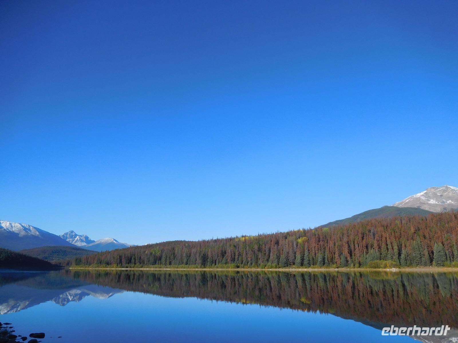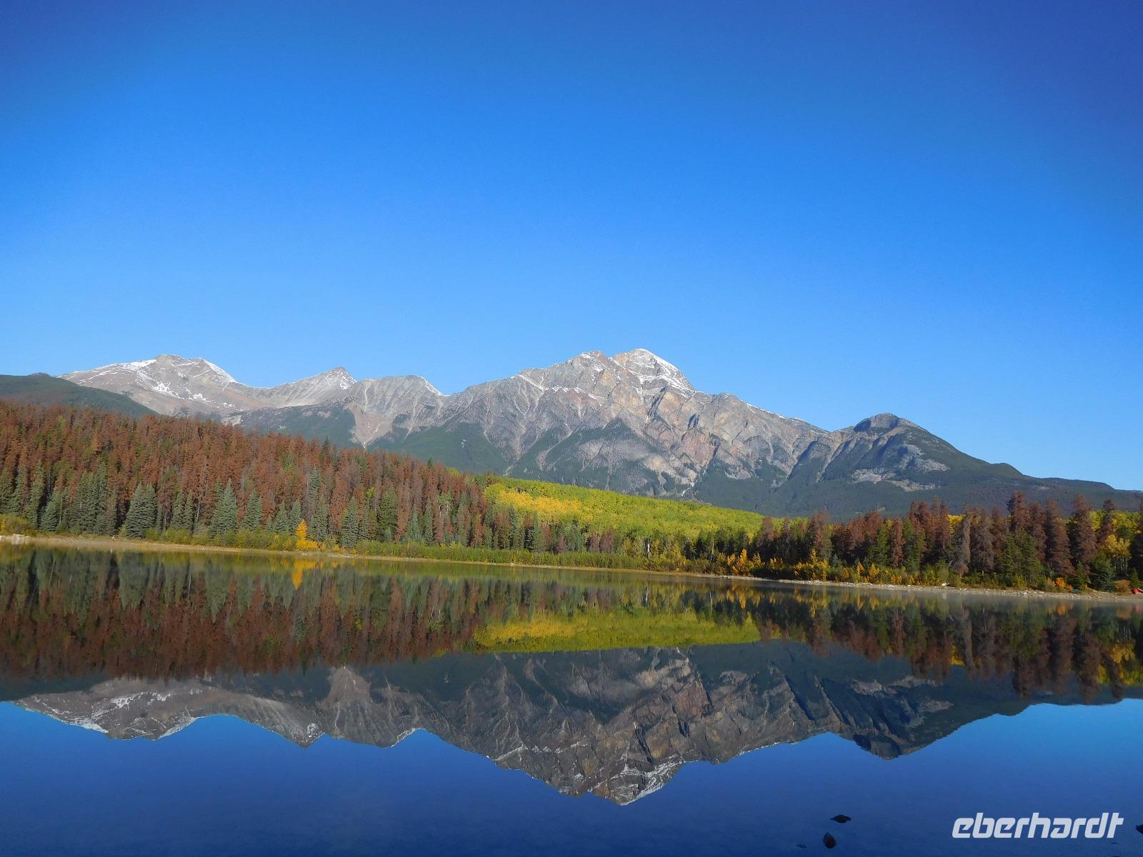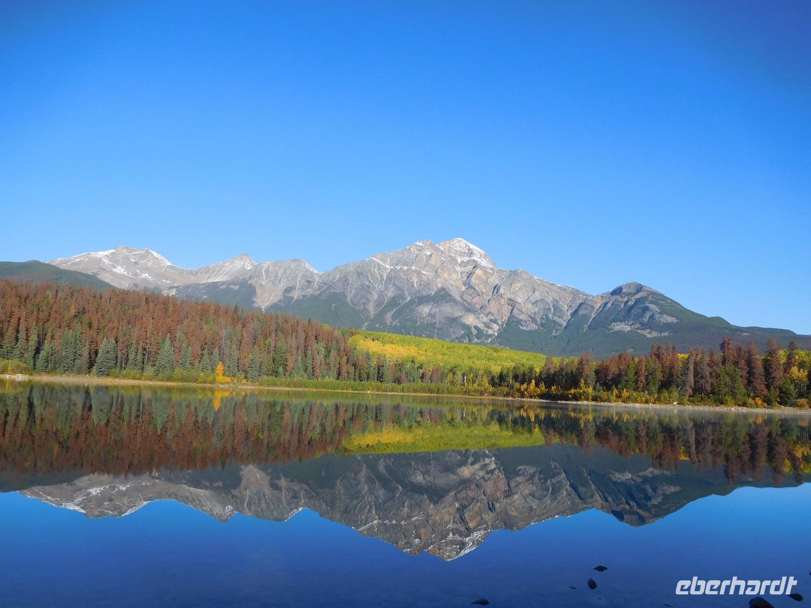 Die Sonne lockte uns heute wieder, die goldene Westkanadische Landschaft zu erkunden. Wie sollte das besser gehen als bei einer Wanderung durch die wunderschöne Landschaft? Doch eins nach dem anderen: Von den Postkarten kannten wir die Seen, die die umliegenden Berggipfel und Baumwipfel perfekt spiegelten. Marion kannte einen ganz besonders schönen, den Patricia Lake, der sich am heutigen Herbsttag perfekt in Szene setzte.