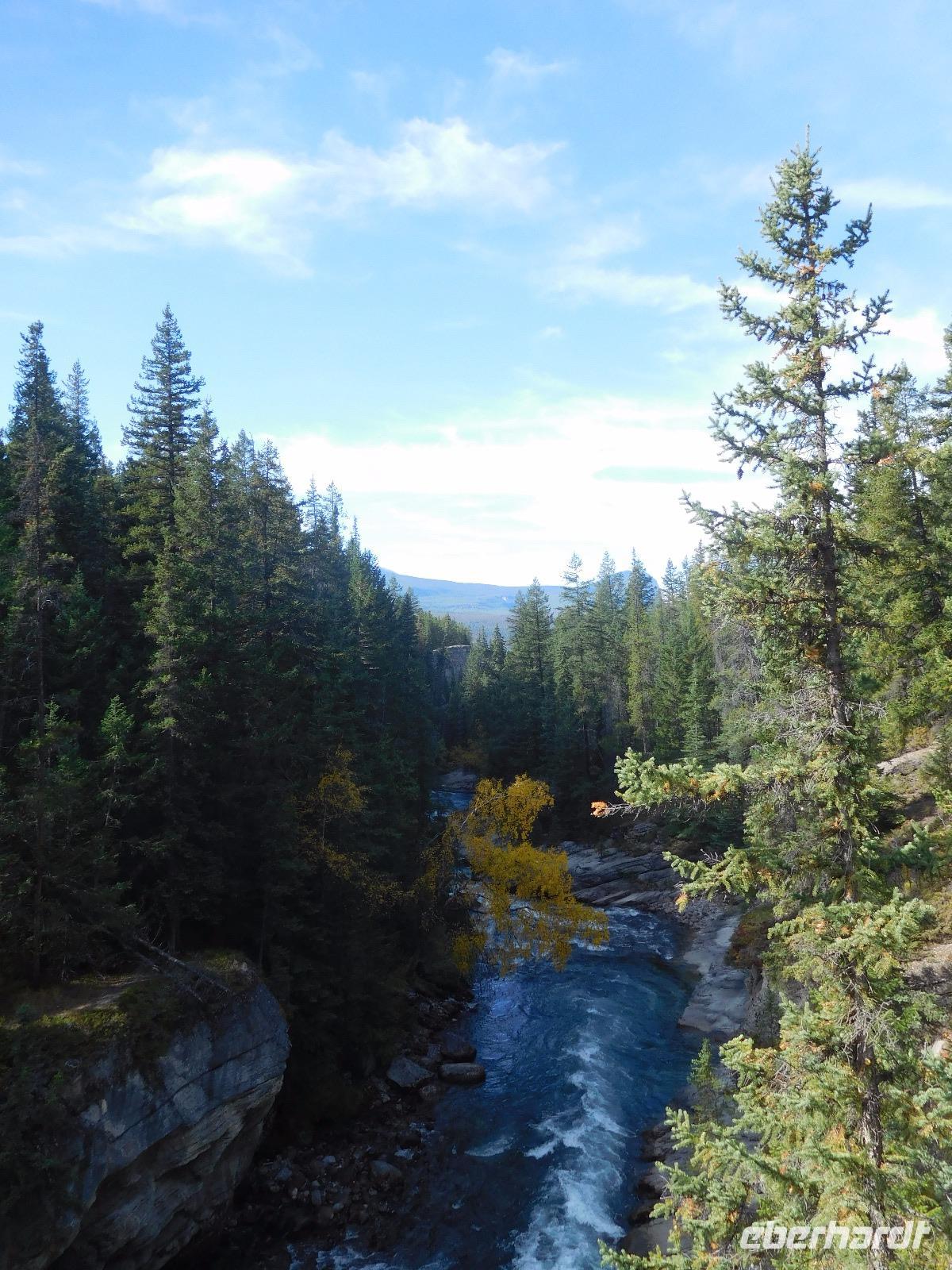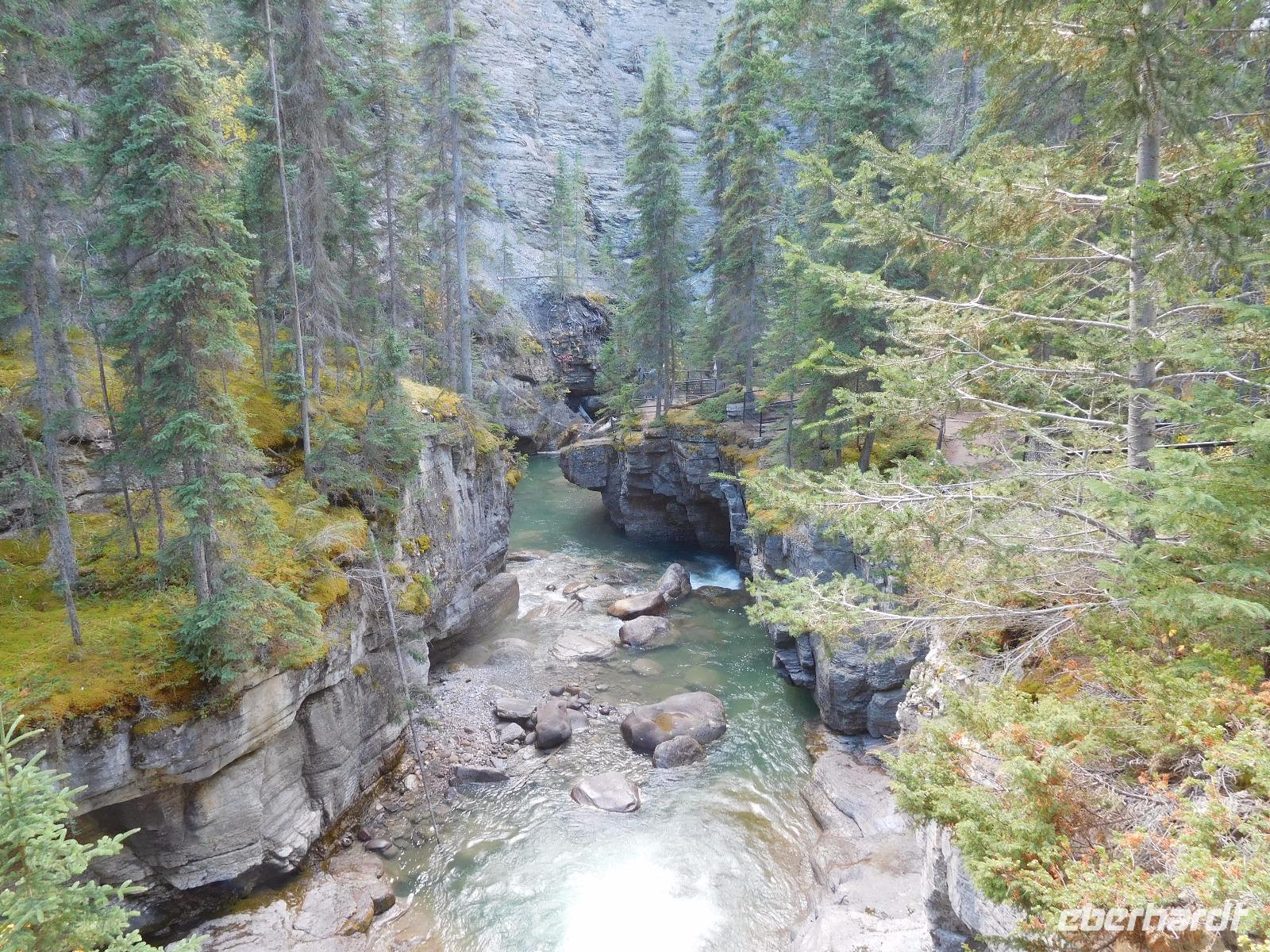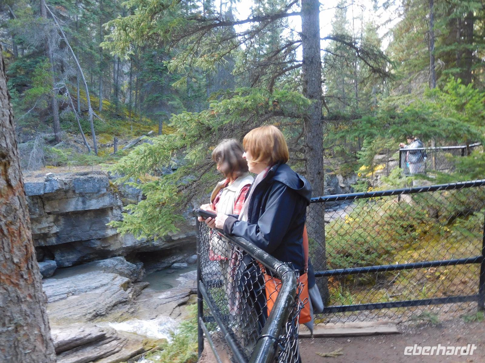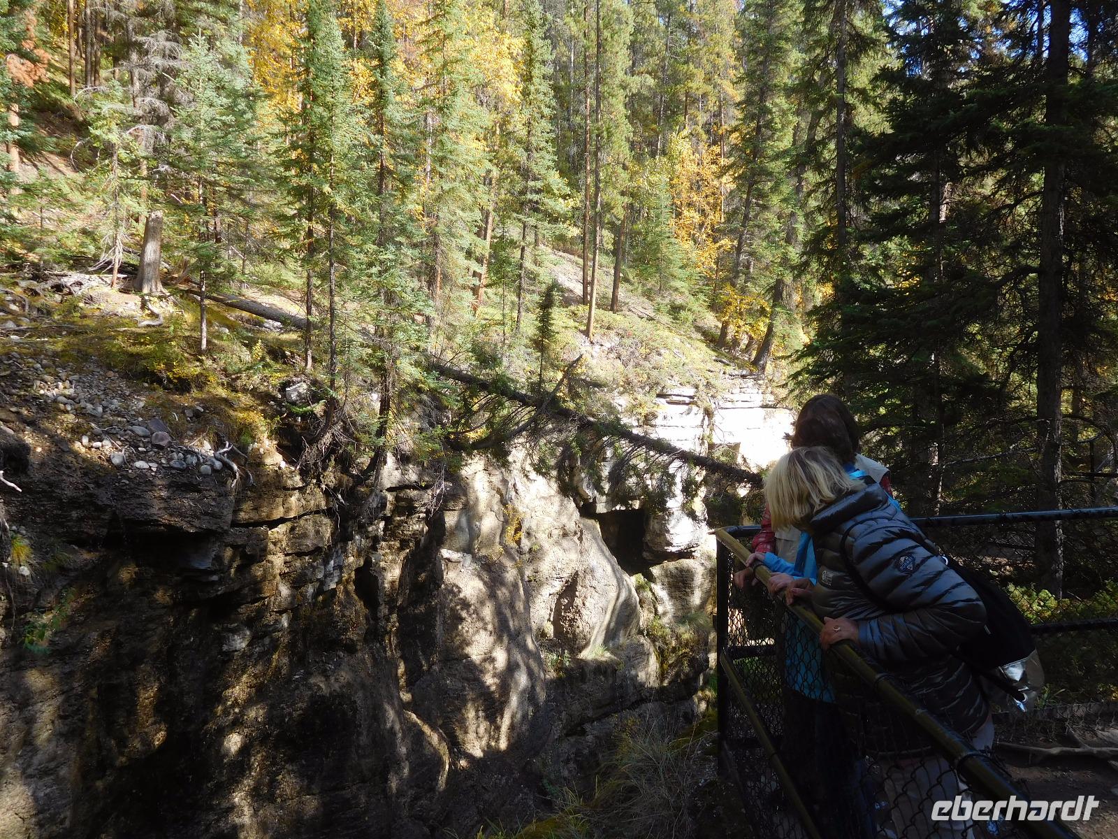 Den Zauber des Ortes im Herzen verabschiedeten wir uns von Fahrer Bob und begrüßten Abi mit dem neuen Bus. Dieser fuhr uns direkt zum nächsten Naturgenuss: zum Maligne Canyon. Hier spazierten wir entlang fantastisch anzuschauender Flusswindungen hinunter bis zur sogenannten "Fünften Brücke" (denn zugegebenermaßen hatte keine von uns gezählt, wir glaubten einfach den Schildern). Die strahlende Sonne war unser Begleiter und wärmte Gemüter und ließ die Bäume besonders golden für uns erstrahlen. Obwohl wir uns hier bestens aufgehoben fühlten, war es wiederum Zeit für unsere Lodges geworden.