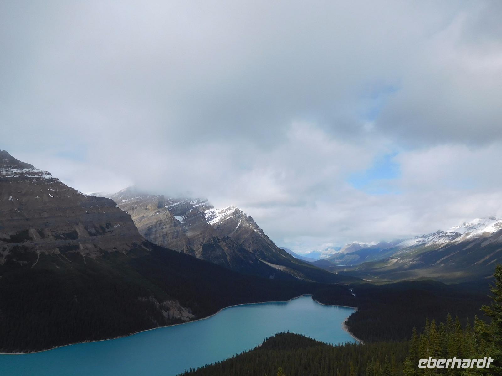 Somit konnten wir uns wieder auf diese fantastische Natur konzentrieren, die noch lange nicht alle Karten gespielt hatte. Wenn wir dachten, wir hatten schon alles gesehen, trumpfte der Peyto Lake noch einmal richtig auf. In der Form eines Huskys lag er ganz ruhig unten im Tal - und konnte so gar nicht sein. Das quietschende Hellblau des Wassers strahlte uns richtig vom See aus dem Tal an. Der lag ganz unaufgewühlt zwischen endlosen Wäldern und ließ uns sprachlos auf einem Aussichtspunkt stehen, während die Farbrezeptoren unserer Augen durchdrehten.