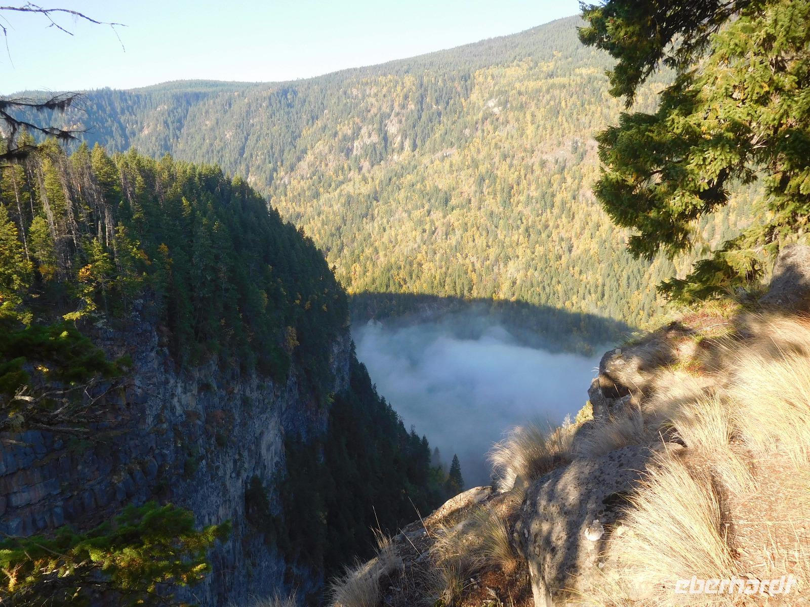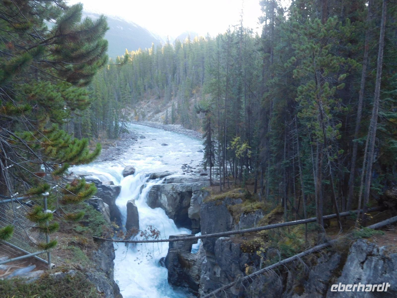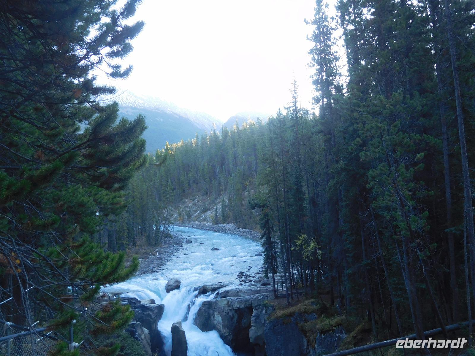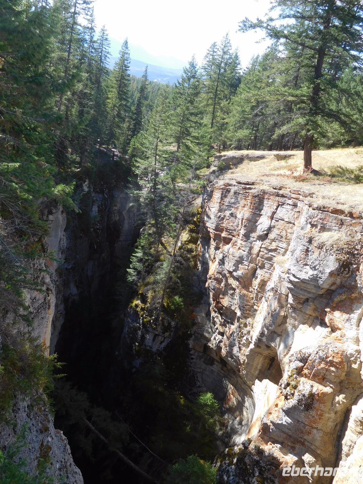 Viel Fahrt stand uns auch heute bevor, wollten wir doch heute weiter in den Kanadischen Westen gelangen. Zuvor statteten wir den Spahat Falls bei Clearwater einen Besuch ab. Es war faszinierend, wie der nadeldünne Wasserfall sich wie ein Messer durch das Gestein tief in den Abgrund schnitt. Gegenüber wogte noch der Morgennebel durch das bewaldete Tal und verbreitete eine mystische Stimmung.