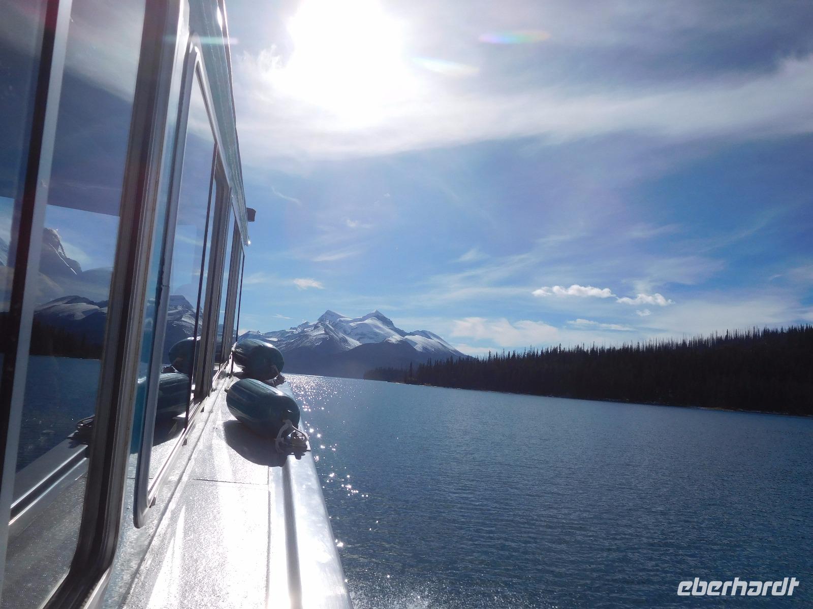 Mit dem Boot fuhren wir durch strahlenden Sonnenschein an schneegepuderten Gipfeln vorbei - letzte Woche soll es hier 40 Zentimeter Neuschnee gegeben haben, wurde uns bei bestem T-Shirt-Wetter erzählt. 14 Kilometer später waren wir da, bei der berühmten Halbinsel Spirit Island, die wohl nur alle 8 Jahre tatsächlich eine Insel ist, wenn die Gletscher besonders stark schmelzen.