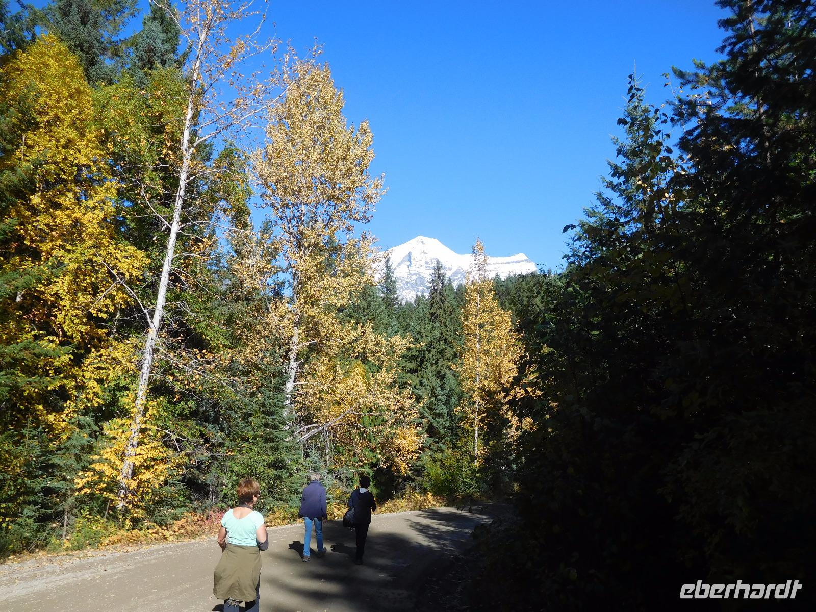Entlang des türkisen Fraser Rivers liefen wir dann, mal durch dichten Wald, mal durch sonnige Plätze, bis zum Fuße des Mount Robson. So war zumindest der Plan und entlang des Flusses war das auch kein Problem - nur beim letzten Stückchen war es nicht ganz klar, ob wir links- oder rechtsherum gehen mussten. Der höchste Berg der Rocky Mountains, der Mount Robson, strahlte uns mit seinem weißen Gipfel aus der Ferne an und lieferte ein spektakuläres Fotomotiv. Dann stellten wir fest, dass der Weg doch in die andere Richtung führten und so trafen wir mit Reiseleiterin Marion doch wieder glücklich zusammen.