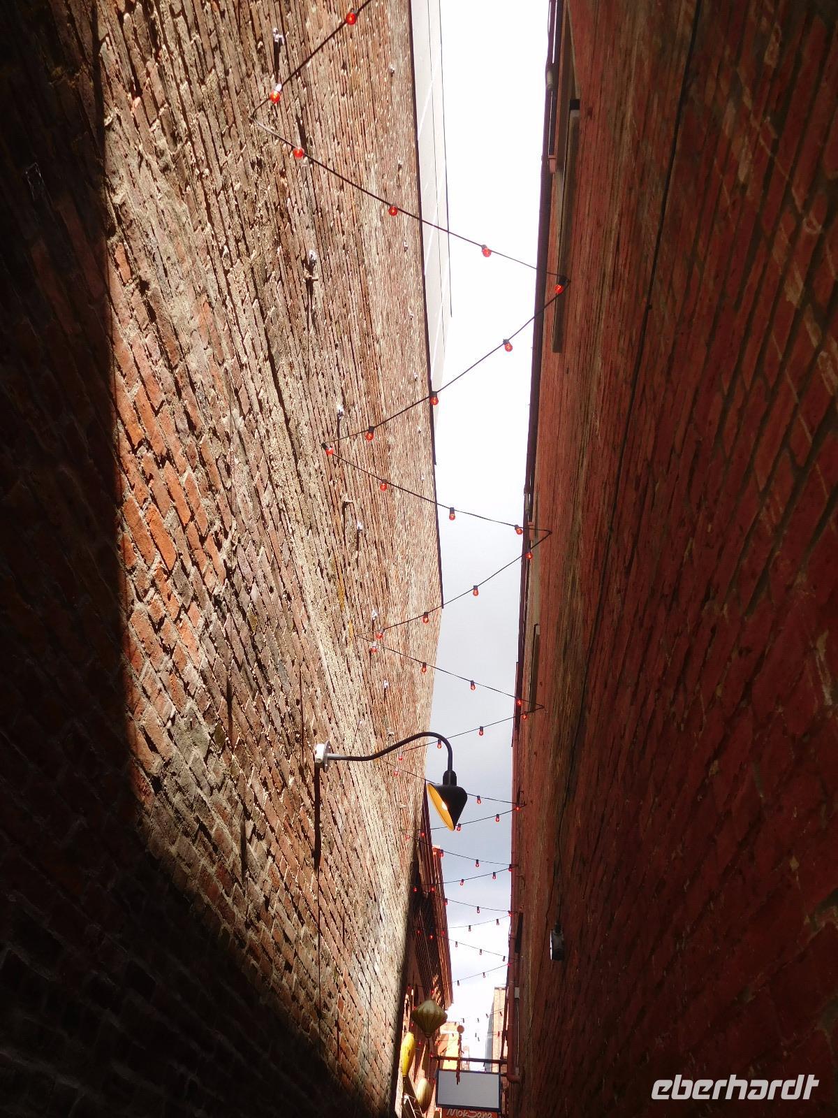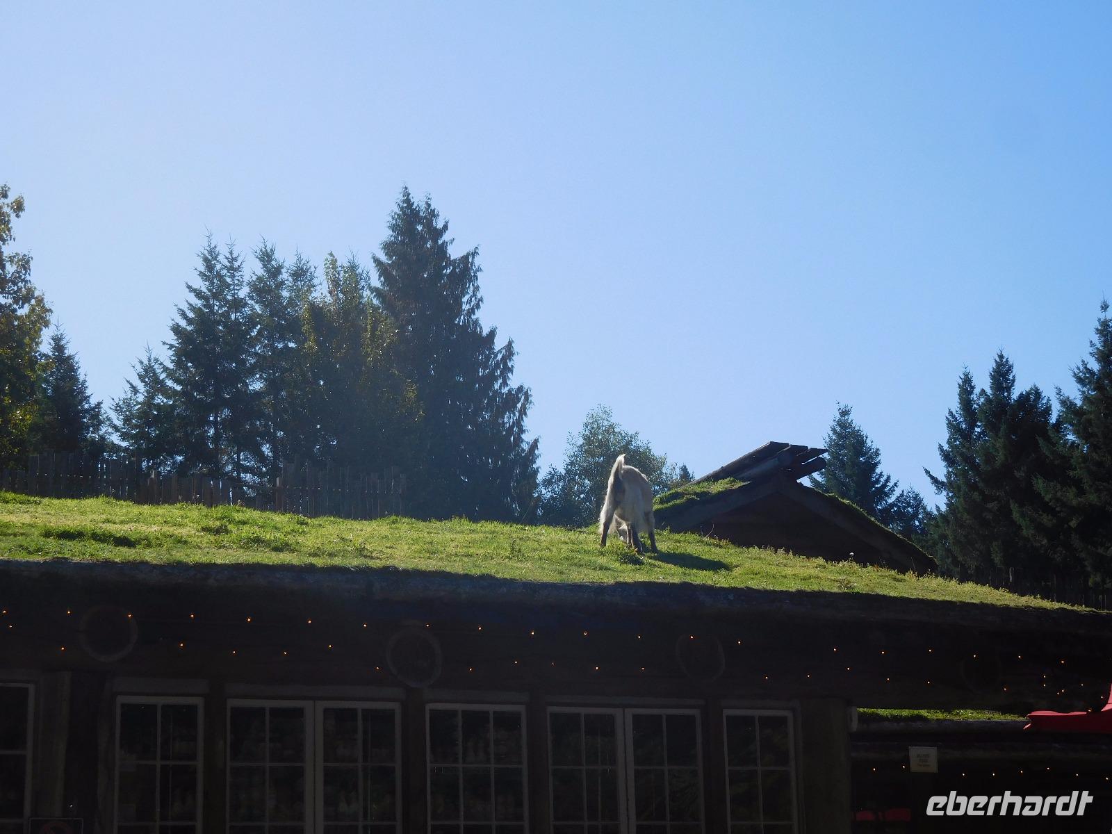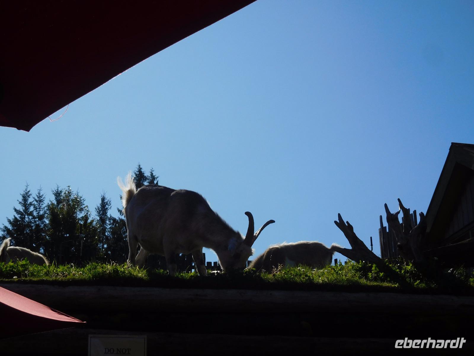 Hoch hinauf starrten wir auch während unserer Mittagspause, denn auf dem Dach eines Restaurants wohnten tatsächlich drei Ziegen. Das Schild „bitte nicht füttern" galt glücklicherweise nicht uns.
