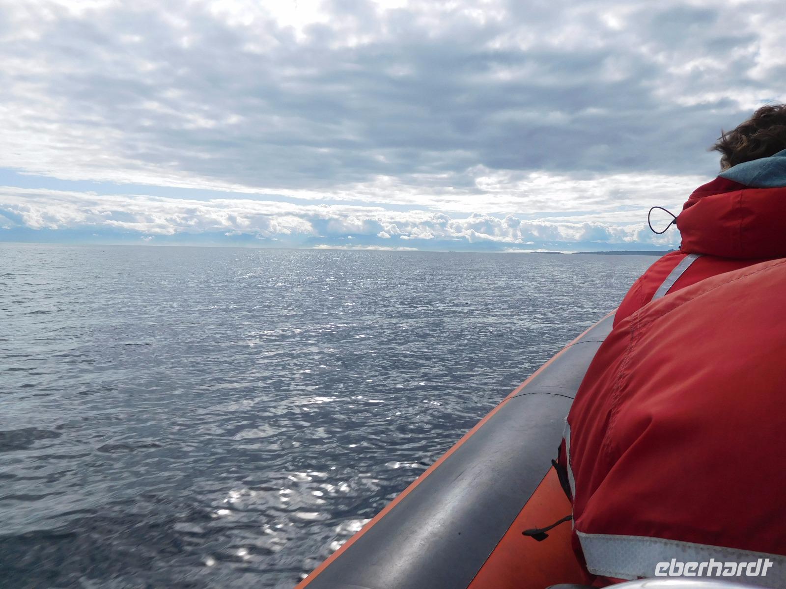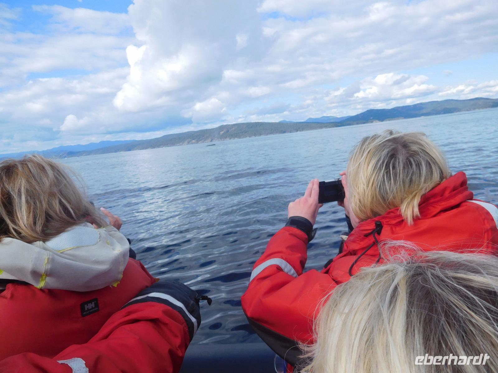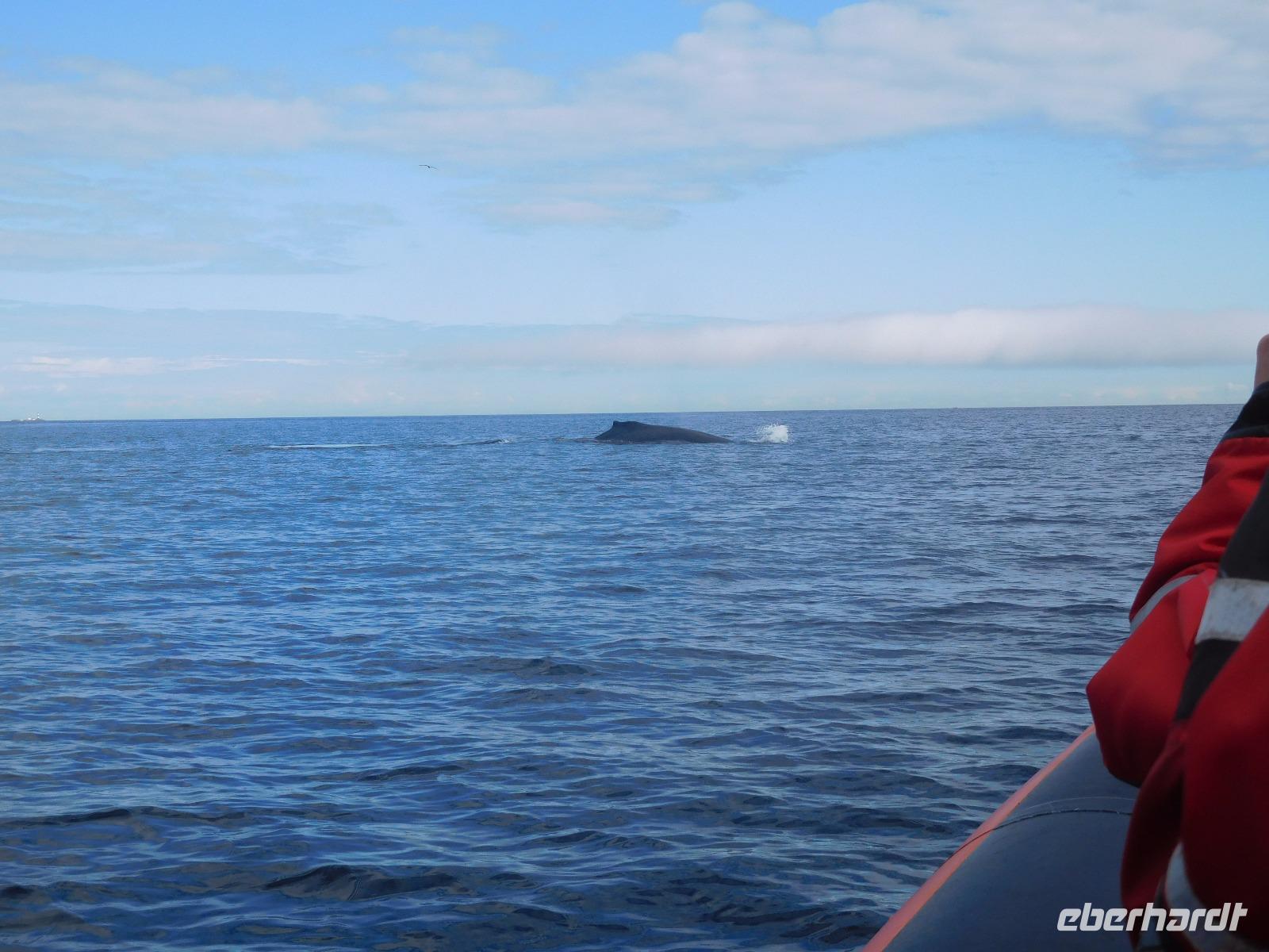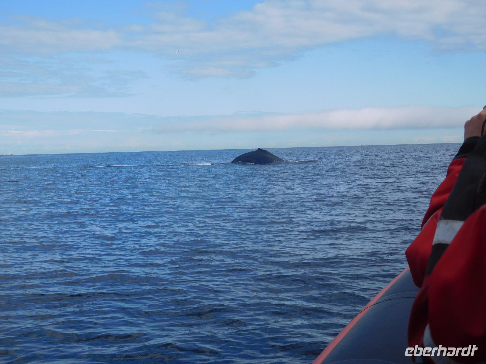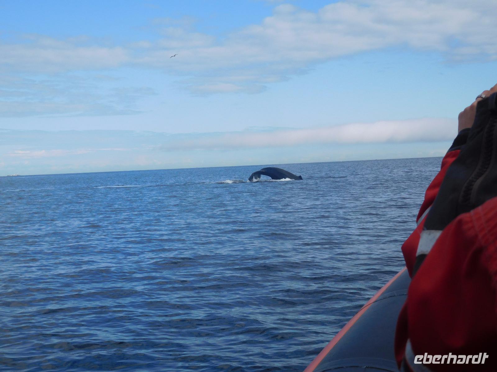 Nichts geringeres als Wale wollten wir sehen und warteten gespannt, dass wir auf die Boote gelassen wurden. Die Mehrzahl würde auf einem normalen Boot starten und eine kleine Gruppe auf einem größeren Schlauchboot, einem Zodiac. Kaum losgefahren, machten wir Fontänen am Horizont aus - konnten wir wirklich so ein Glück haben und tatsächlich die gewaltigen Meeresbewohner sehen? Und da tauchte auch schon ein Rücken aus dem Wasser auf. Wieder.. und wieder.. bis der Buckelwal seine Flosse beim Abtauchen präsentierte. Damit war es der besonderen Erlebnisse nicht genug - wieder und wieder sahen wir (denselben? andere?) Buckelwale! Während die Boots-Gruppe einen Wal direkt auf sich zuschwimmen sah, beobachtete die Zodiac-Gruppe zwei Wale gleichzeitig. Die Otter und Seelöwen, zu denen wir dann noch fuhren, rundeten das tierische Erlebnis ab.