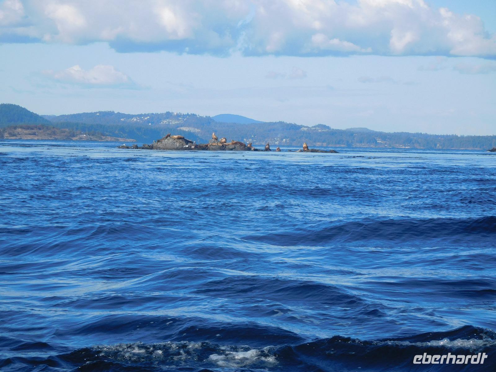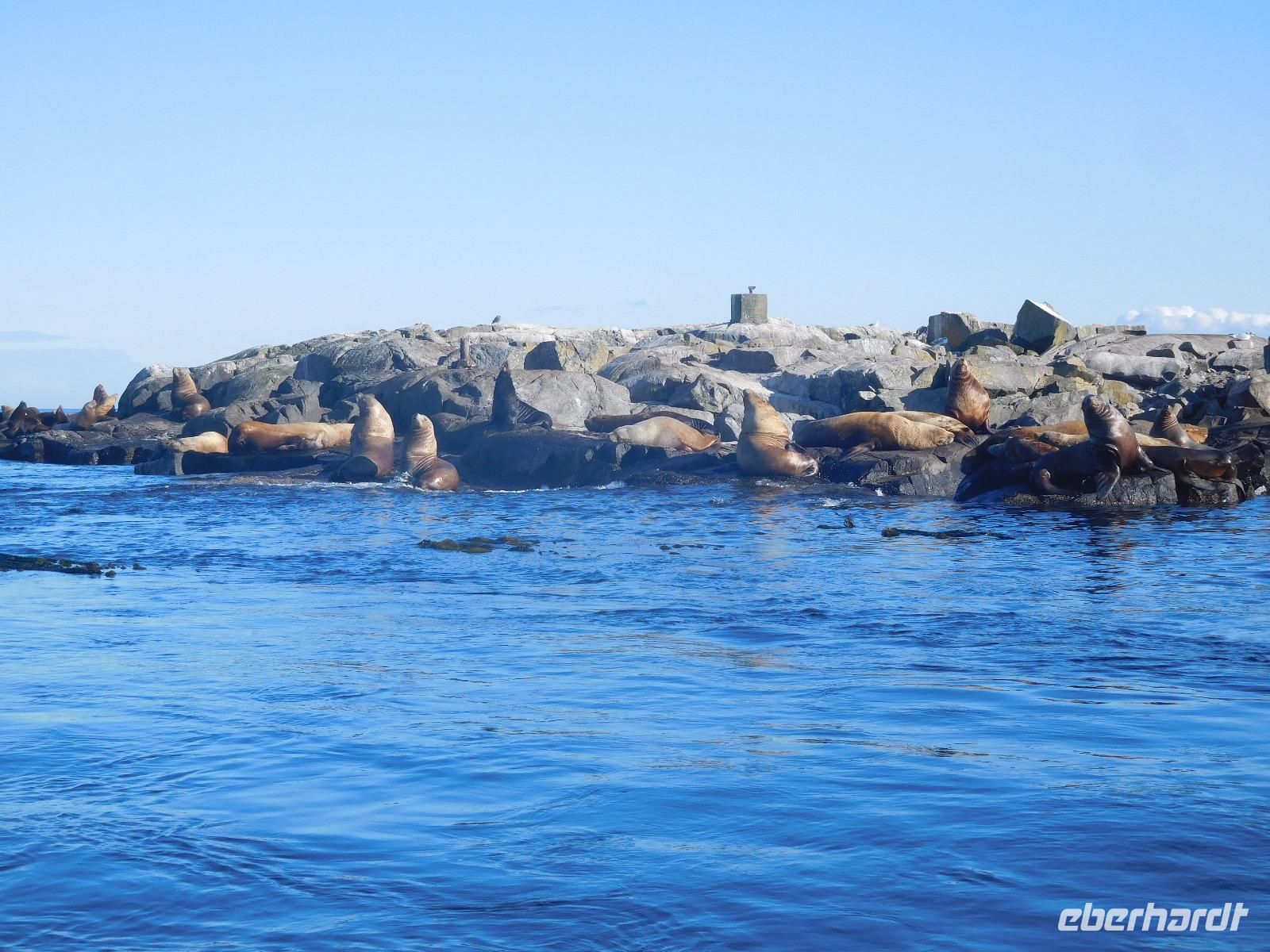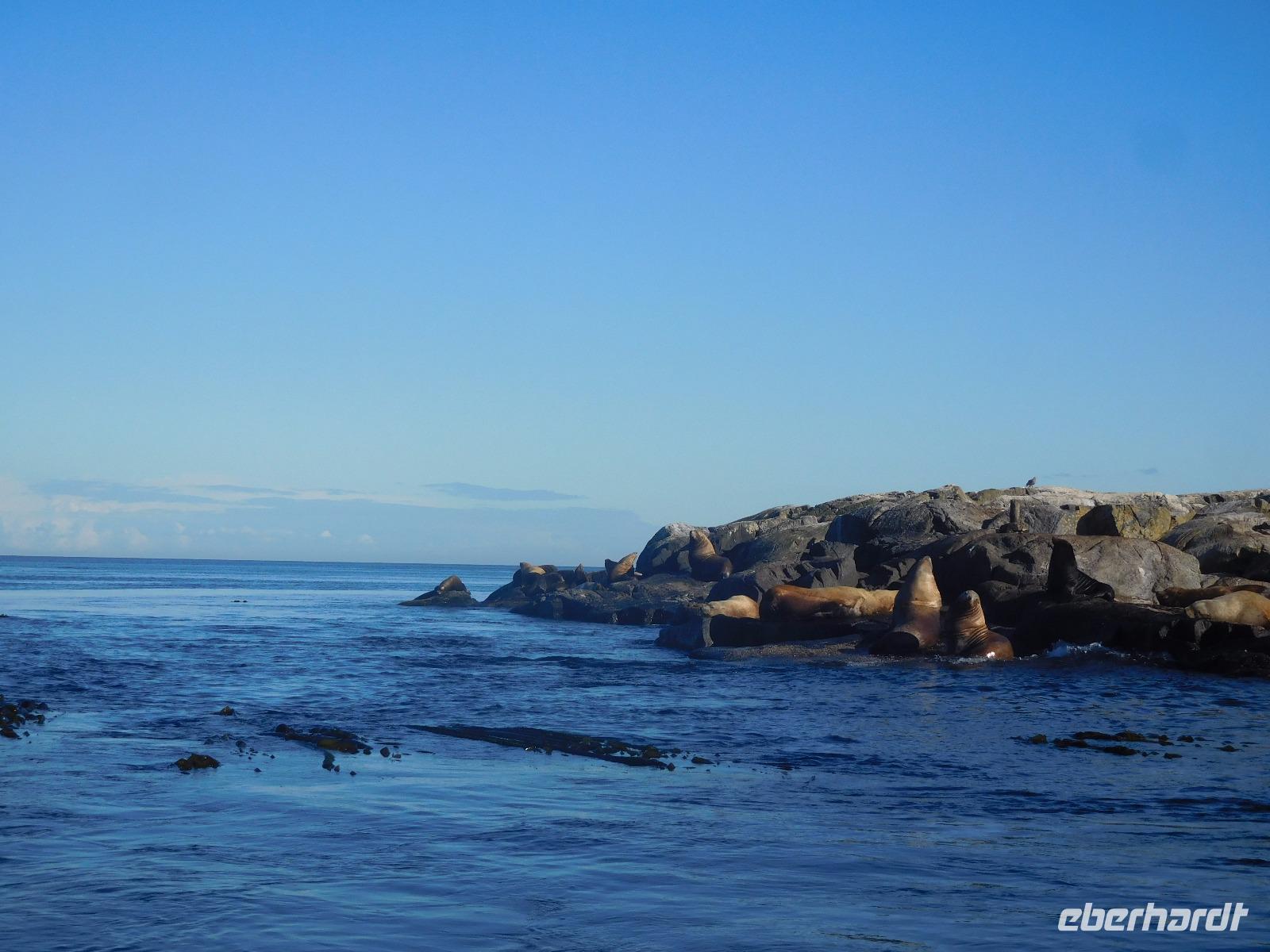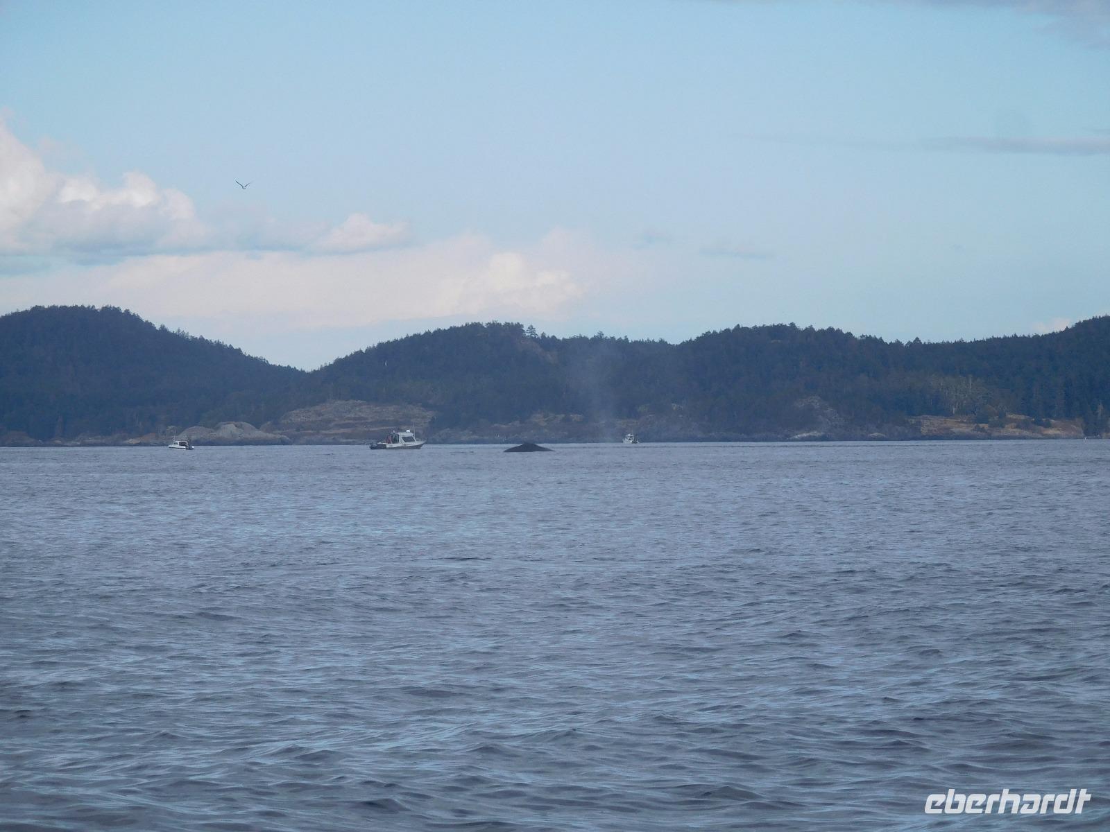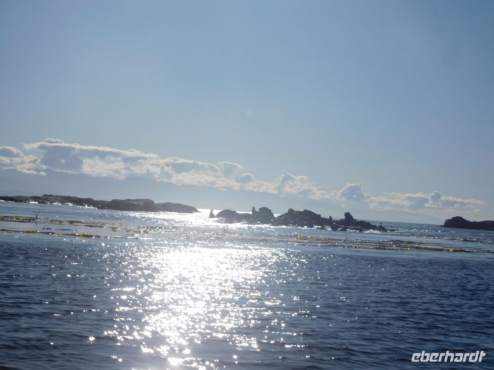 Nichts geringeres als Wale wollten wir sehen und warteten gespannt, dass wir auf die Boote gelassen wurden. Die Mehrzahl würde auf einem normalen Boot starten und eine kleine Gruppe auf einem größeren Schlauchboot, einem Zodiac. Kaum losgefahren, machten wir Fontänen am Horizont aus - konnten wir wirklich so ein Glück haben und tatsächlich die gewaltigen Meeresbewohner sehen? Und da tauchte auch schon ein Rücken aus dem Wasser auf. Wieder.. und wieder.. bis der Buckelwal seine Flosse beim Abtauchen präsentierte. Damit war es der besonderen Erlebnisse nicht genug - wieder und wieder sahen wir (denselben? andere?) Buckelwale! Während die Boots-Gruppe einen Wal direkt auf sich zuschwimmen sah, beobachtete die Zodiac-Gruppe zwei Wale gleichzeitig. Die Otter und Seelöwen, zu denen wir dann noch fuhren, rundeten das tierische Erlebnis ab.