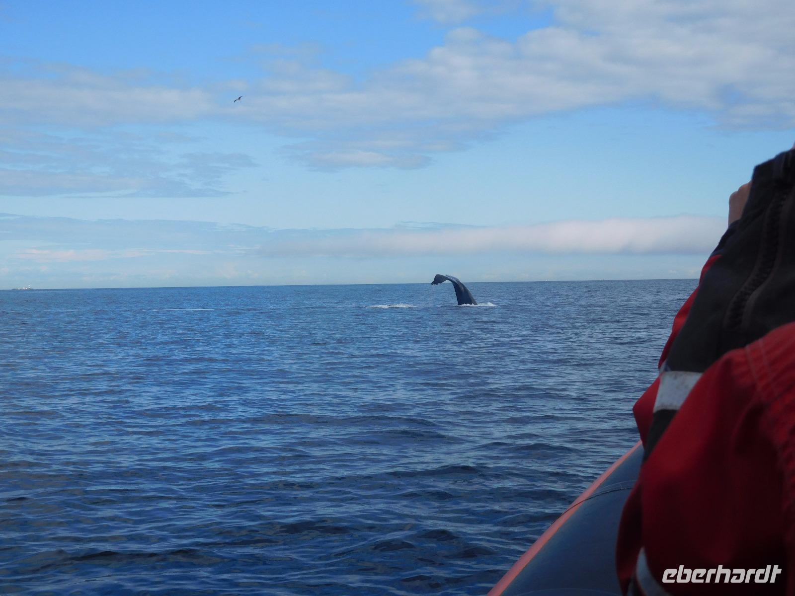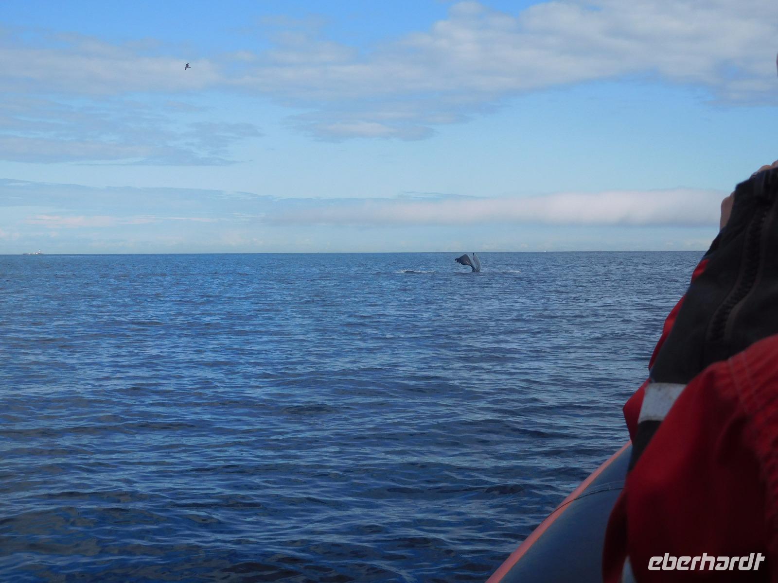Tatsächlich planschte den gesamten Nachmittag ein fröhlicher Buckelwal von links nach rechts und rechts nach links, präsentierte seine Schwanzflosse und sprang auch der Schnauze voran aus dem Wasser, immer von einem Schwarm Vögel begleitet. So wussten wir immer, wo sich gerade unser riesiger Begleiter befand.