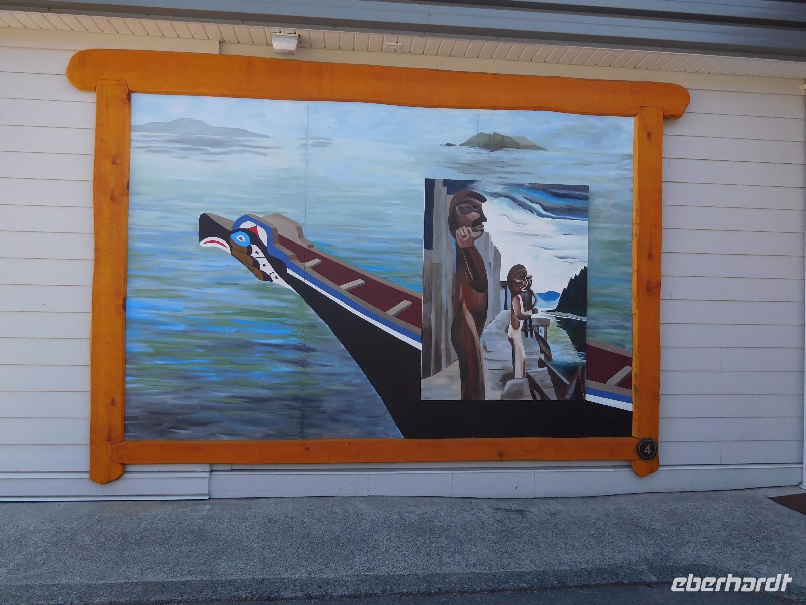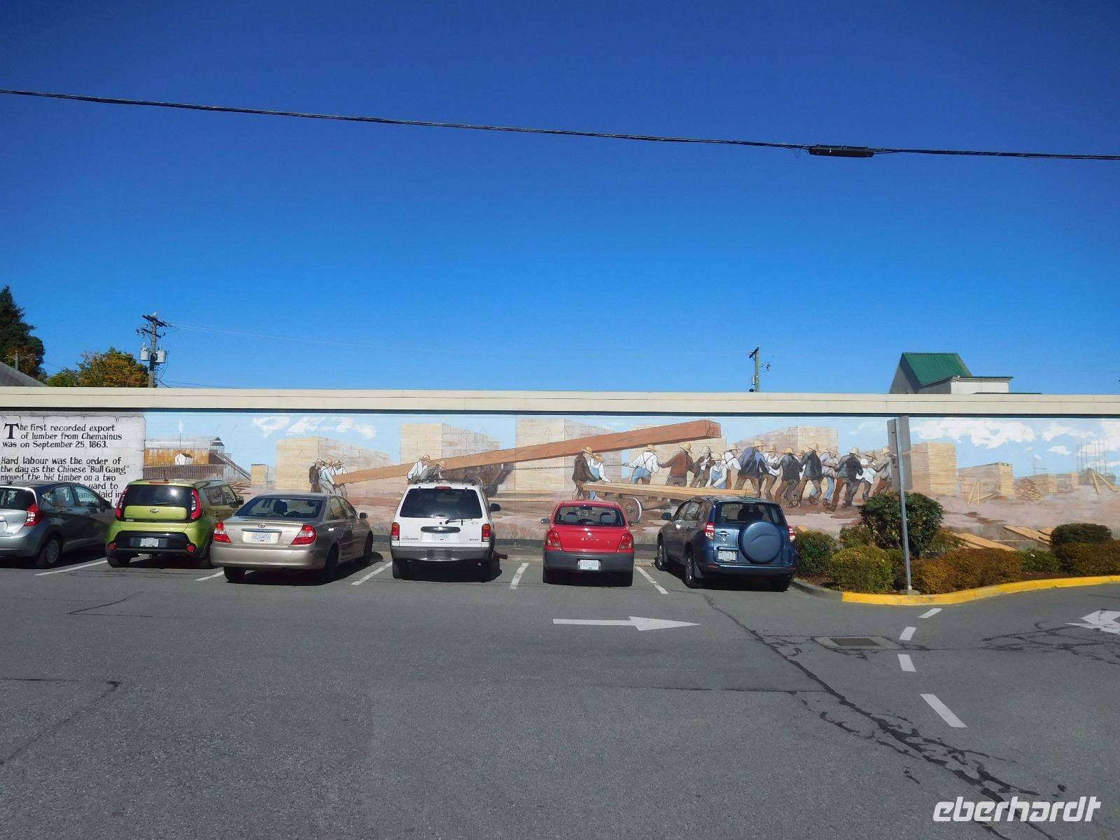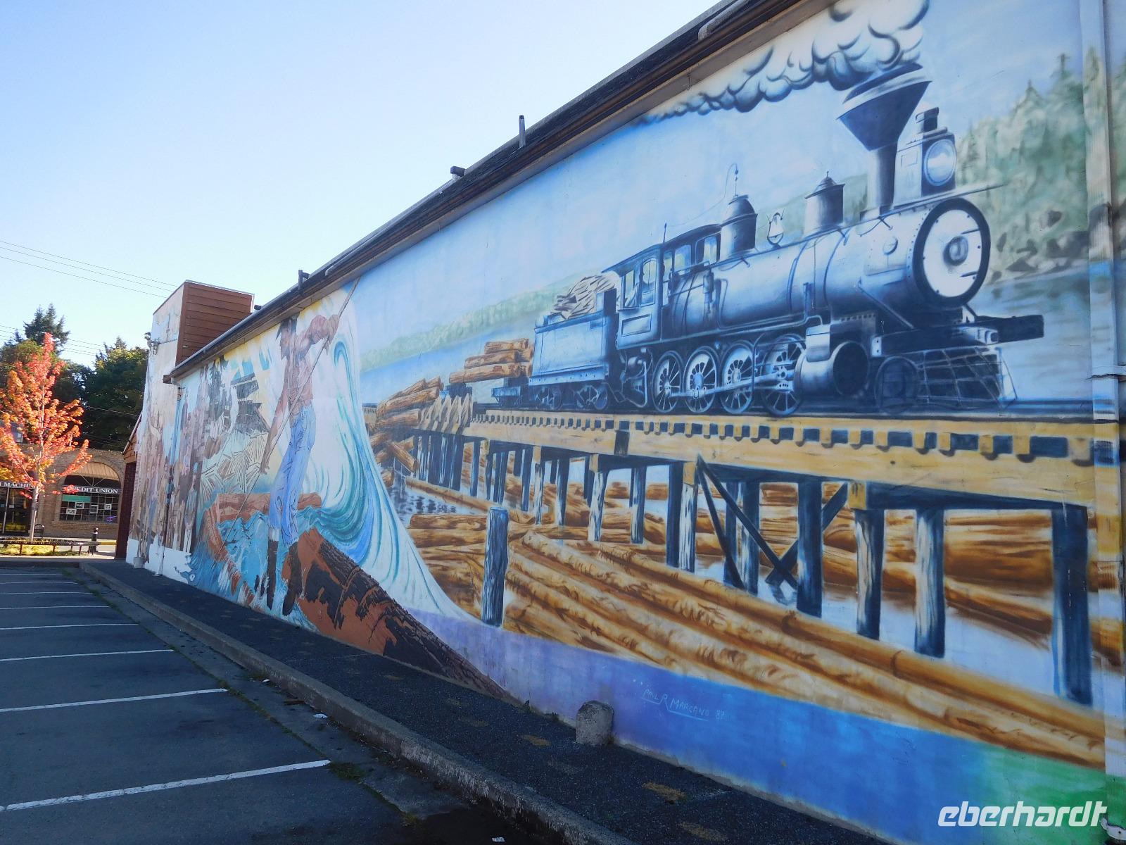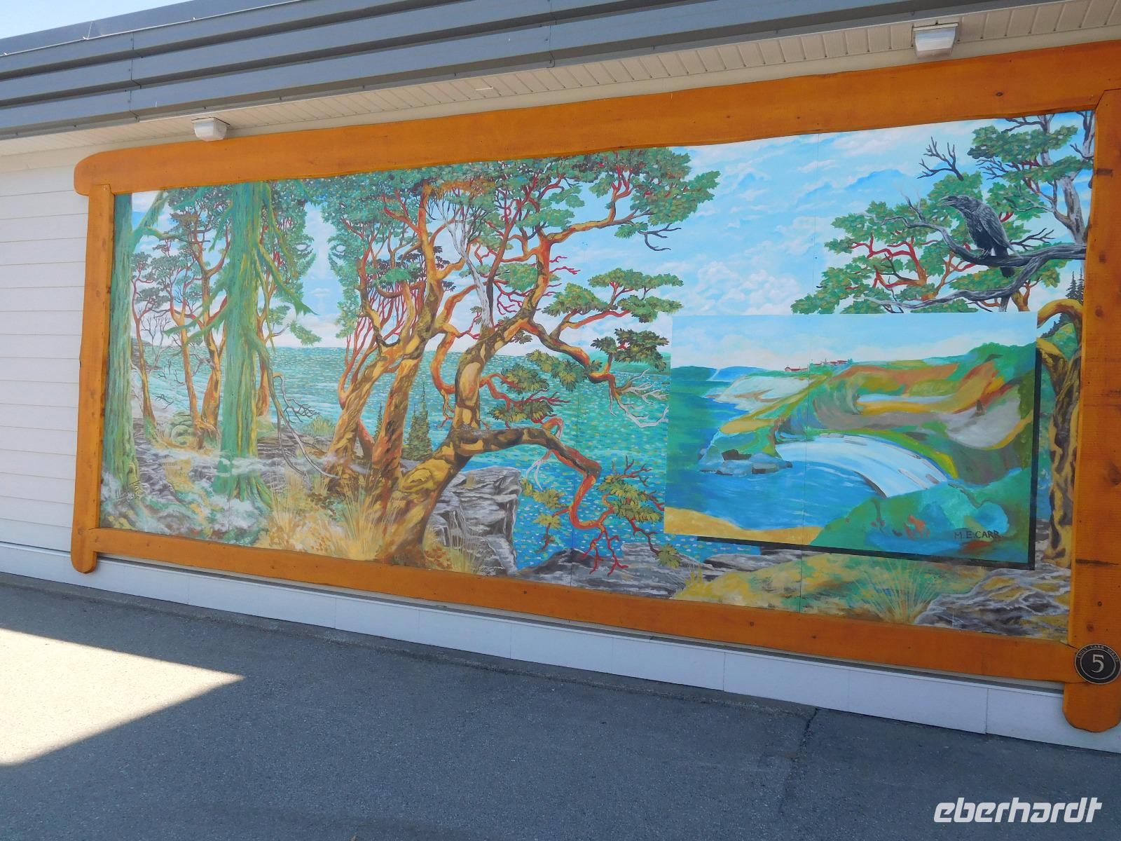 Kunstvoll präsentierte sich auch das besucherfreudige Städtchen Chemainus, an dessen Hauswänden sich Landschaften und Handwerker, Geschichten und Porträts tummelten. Da musste man schon aufpassen, wohin man trat, wenn man durch die Galerie gewordene Stadt flanierte.