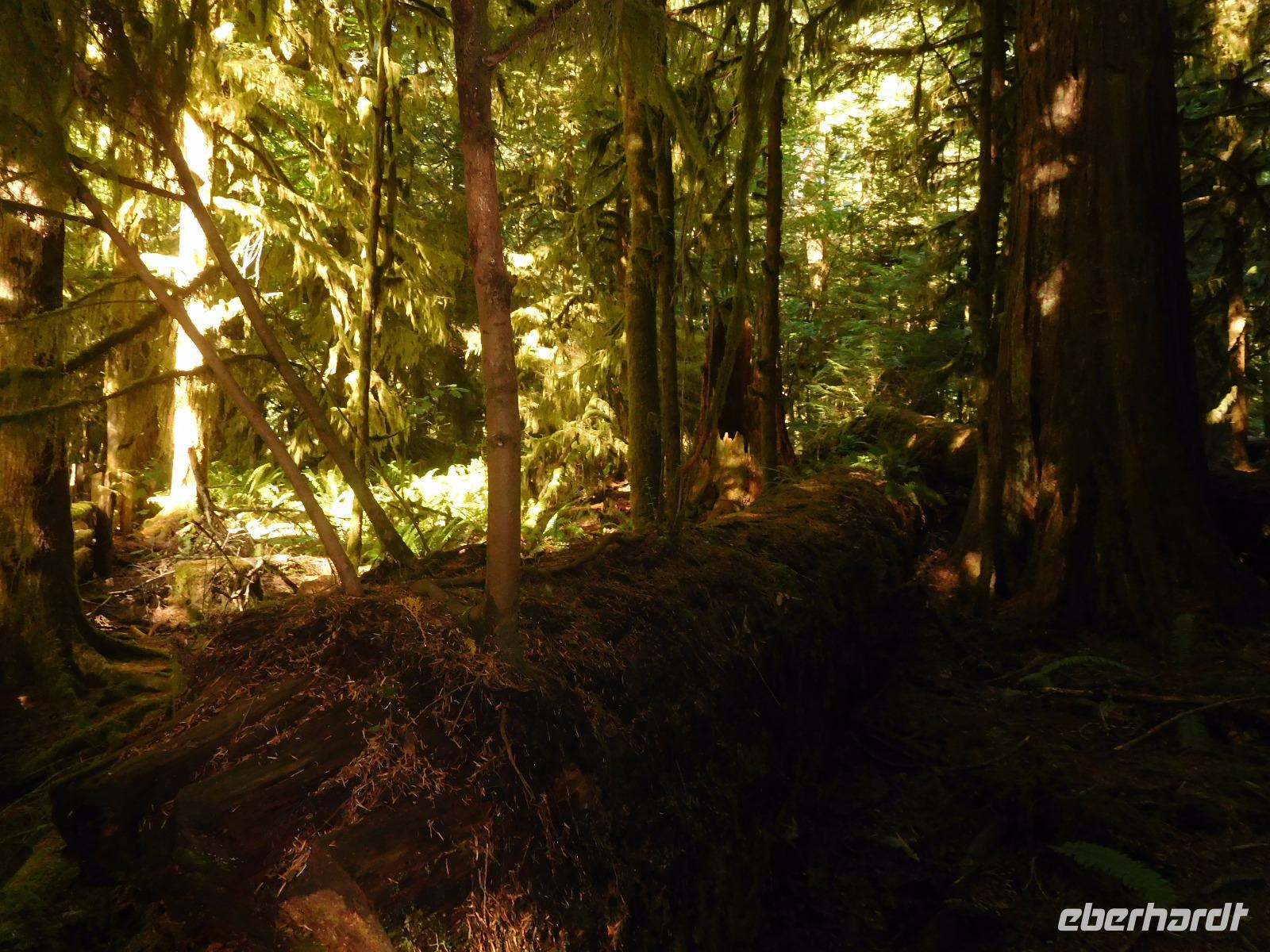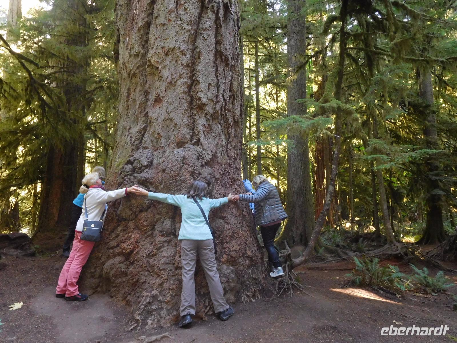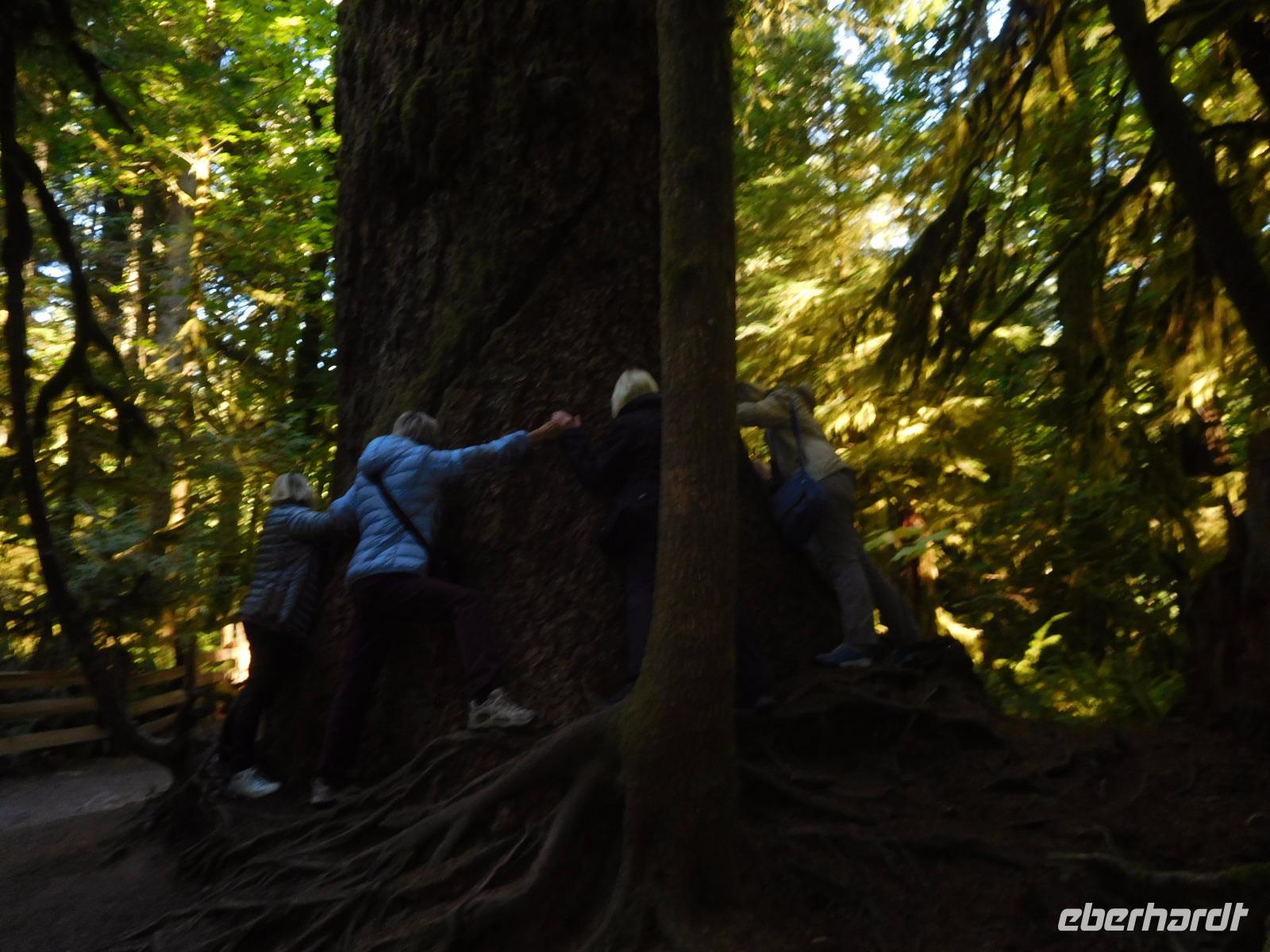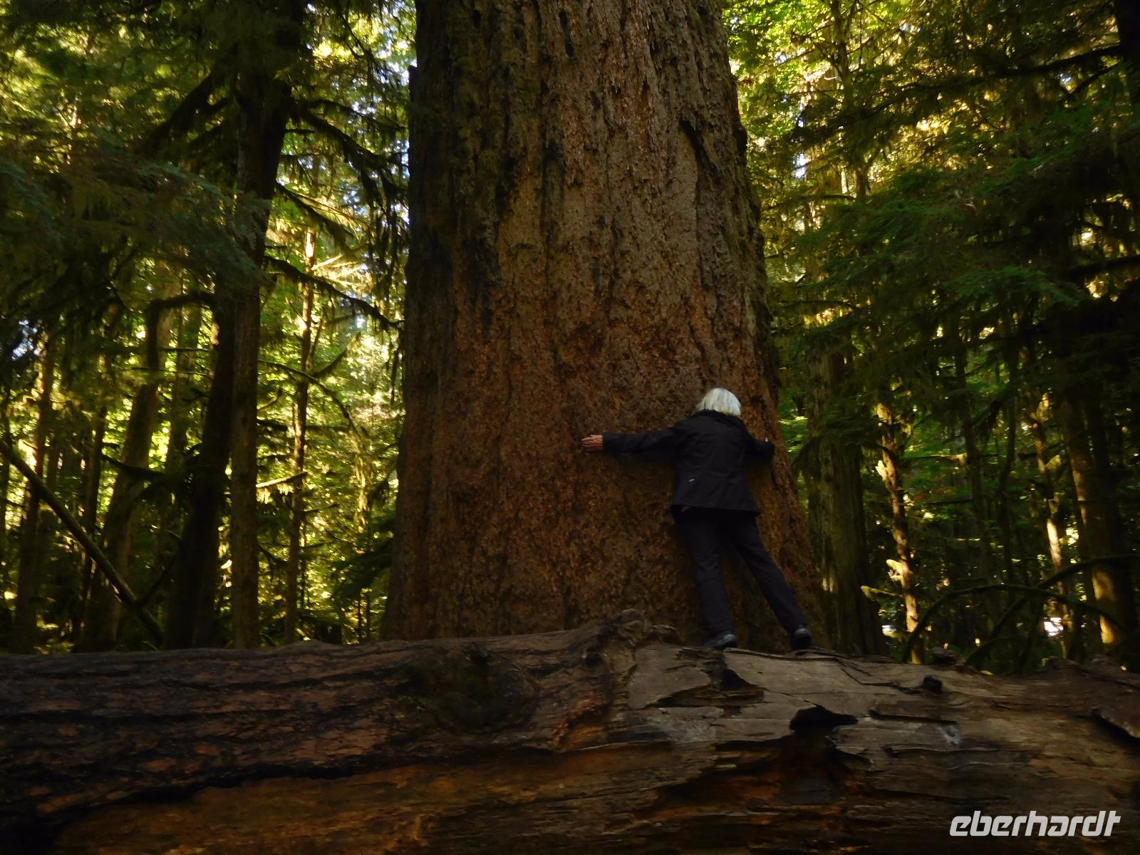 Und noch höher hinauf schauten wir, um die Baumwipfel in Cathedral Grove ausmachen zu können. Bei der Urbarmachung von Vancouver Island hatten die Bewohner diesen Ort naturbelassen, um der Nachwelt zu zeigen, auf welch mystischen Wald sie damals getroffen waren. Moose und Farne durchzogen den Wald, dessen Bäume acht Damen brauchten, um vollständig umfasst zu werden. Die ruhige Energie des Waldes war durchaus respekteinflößend.
