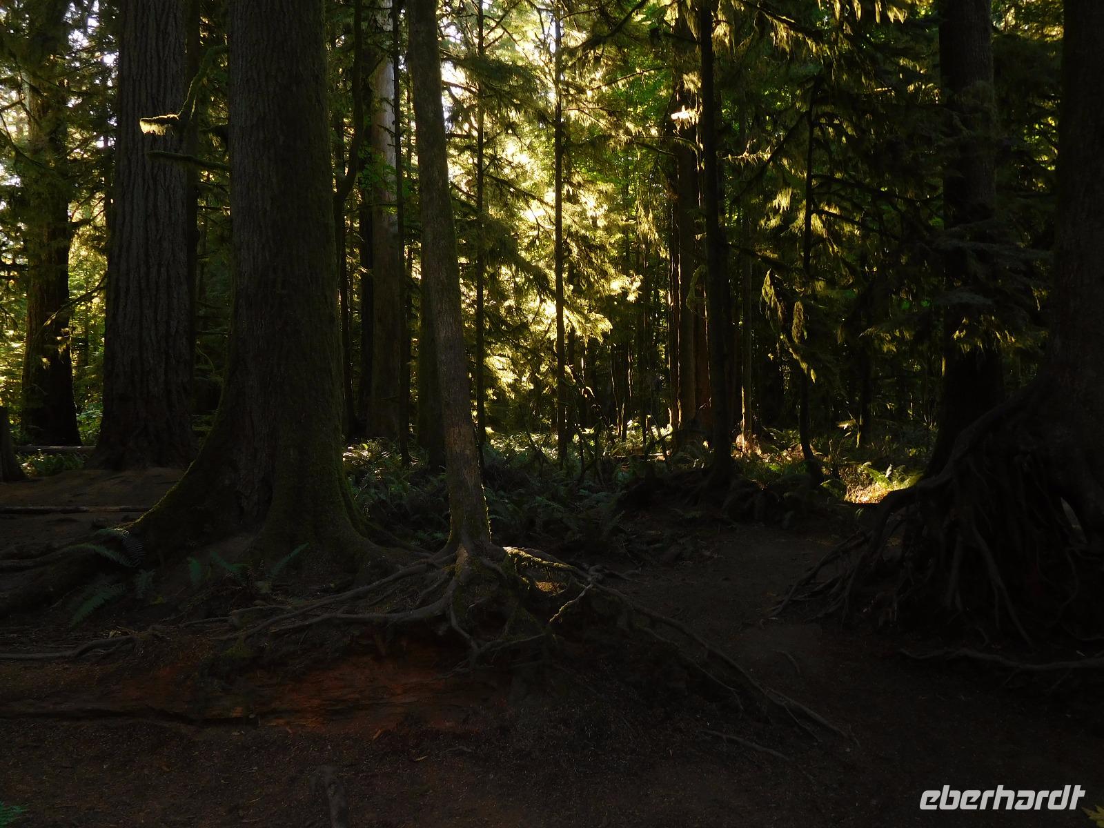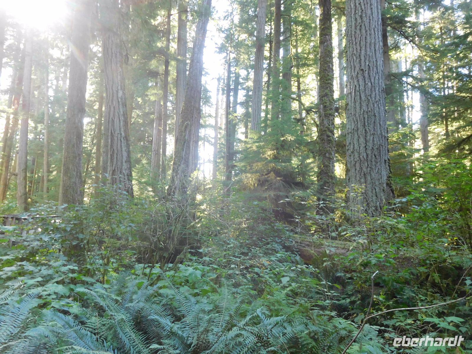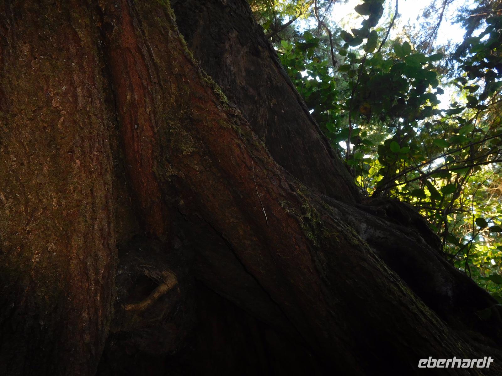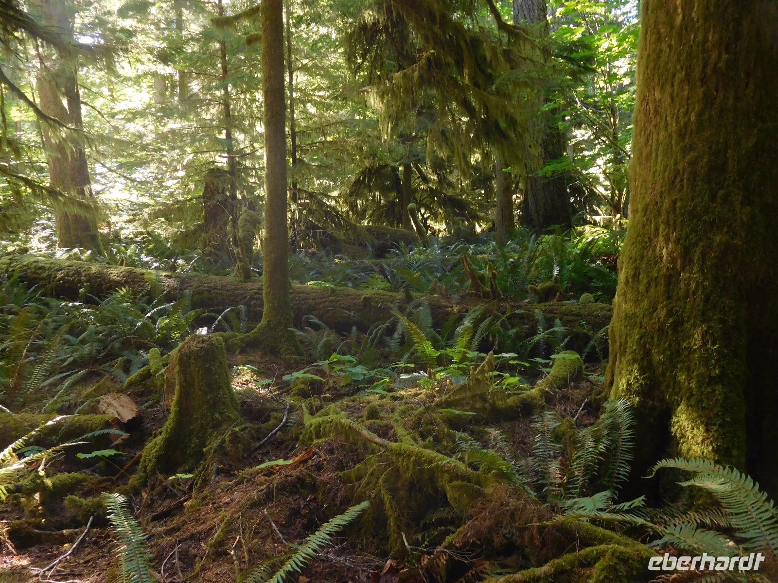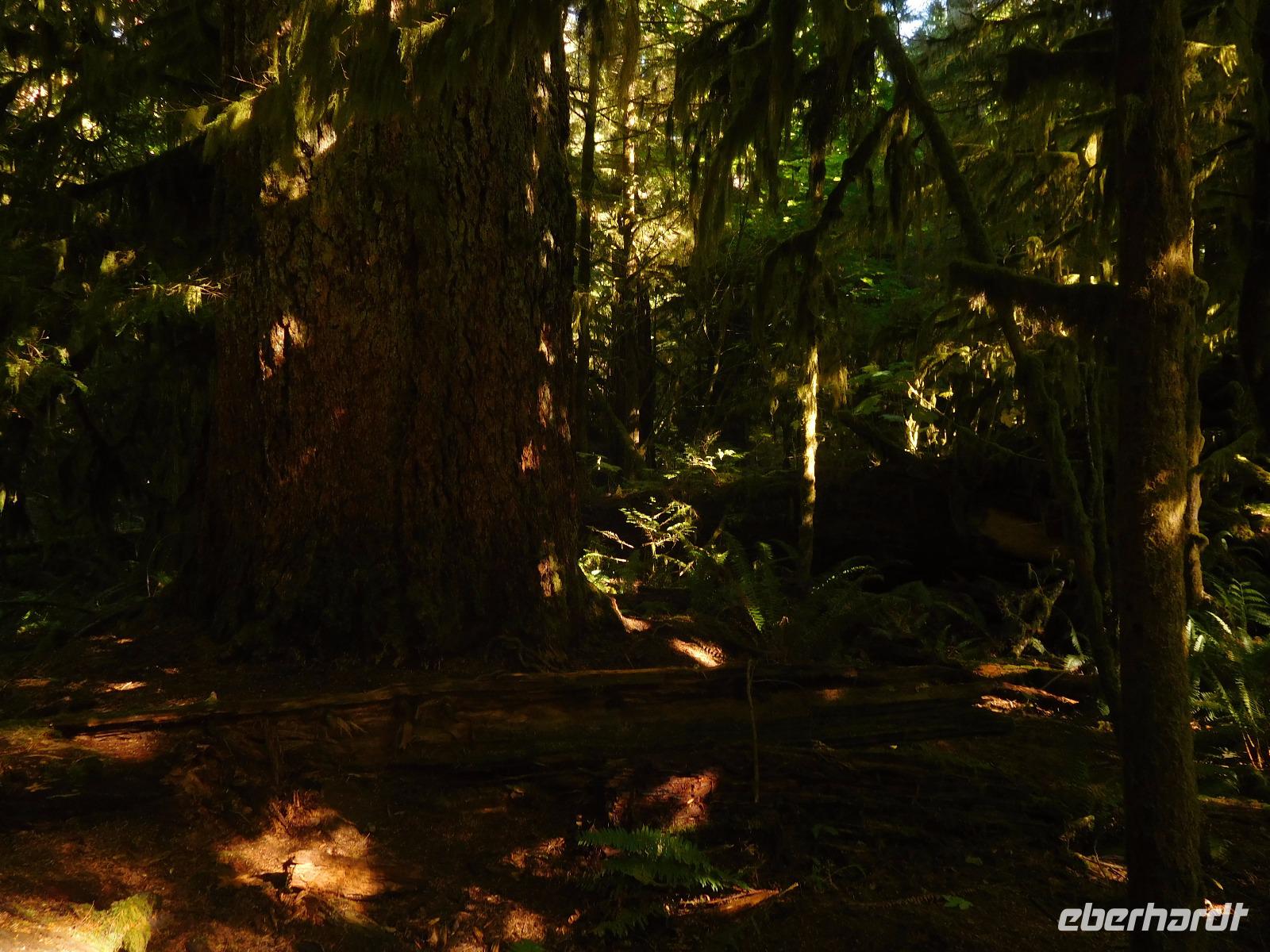 Und noch höher hinauf schauten wir, um die Baumwipfel in Cathedral Grove ausmachen zu können. Bei der Urbarmachung von Vancouver Island hatten die Bewohner diesen Ort naturbelassen, um der Nachwelt zu zeigen, auf welch mystischen Wald sie damals getroffen waren. Moose und Farne durchzogen den Wald, dessen Bäume acht Damen brauchten, um vollständig umfasst zu werden. Die ruhige Energie des Waldes war durchaus respekteinflößend.
