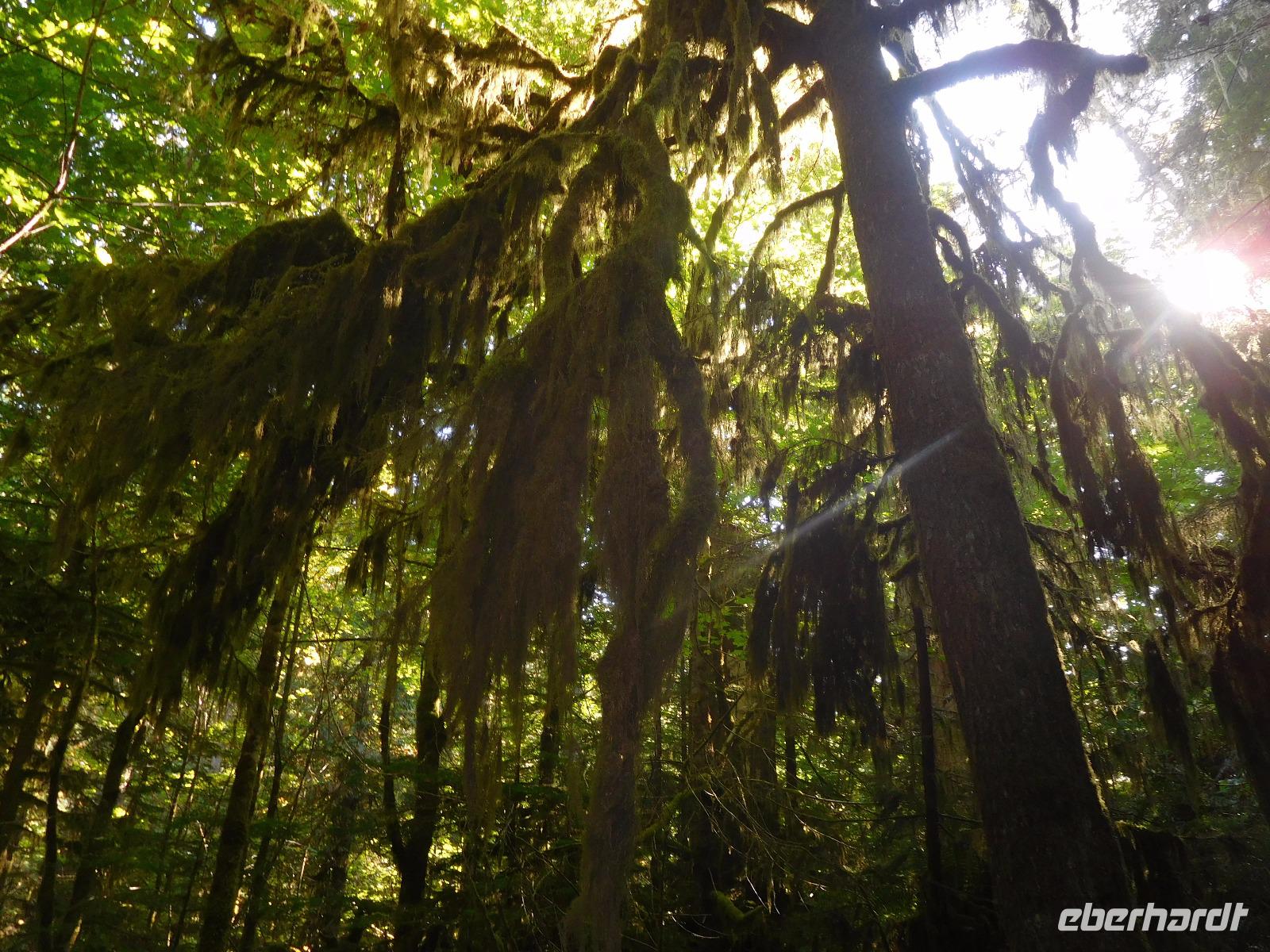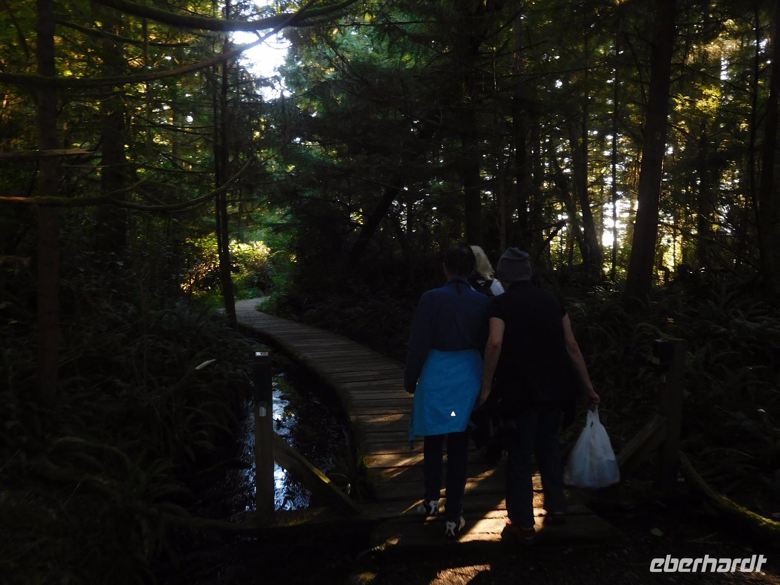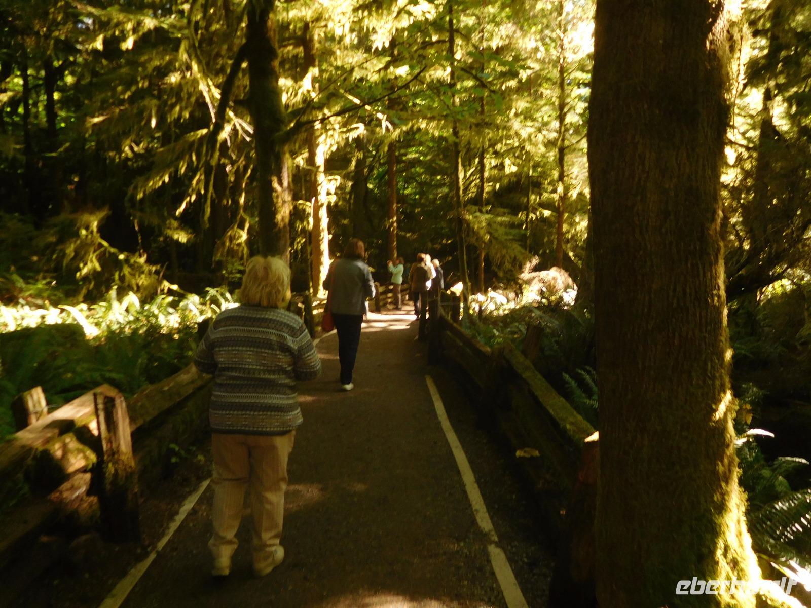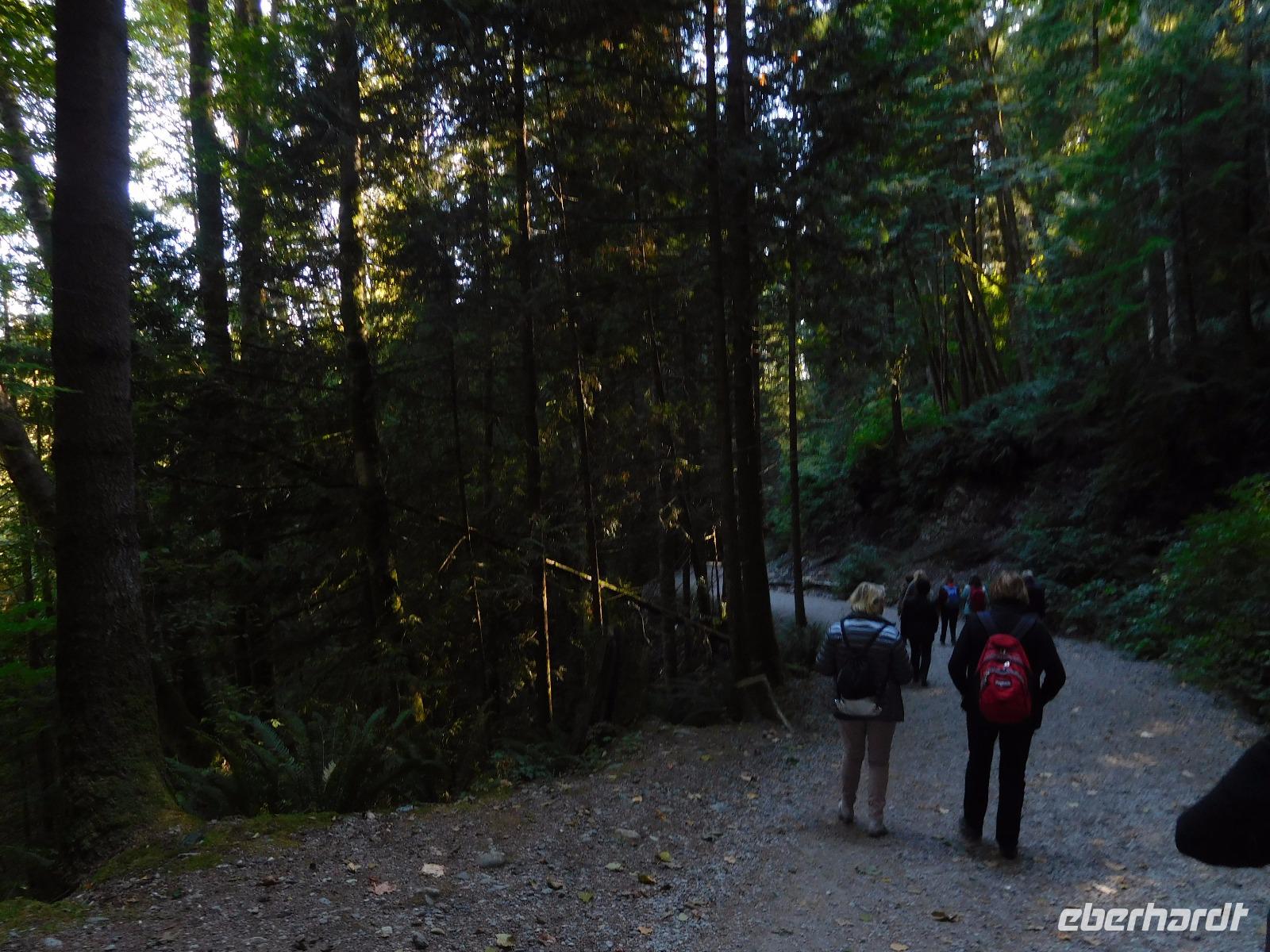 Und noch höher hinauf schauten wir, um die Baumwipfel in Cathedral Grove ausmachen zu können. Bei der Urbarmachung von Vancouver Island hatten die Bewohner diesen Ort naturbelassen, um der Nachwelt zu zeigen, auf welch mystischen Wald sie damals getroffen waren. Moose und Farne durchzogen den Wald, dessen Bäume acht Damen brauchten, um vollständig umfasst zu werden. Die ruhige Energie des Waldes war durchaus respekteinflößend.