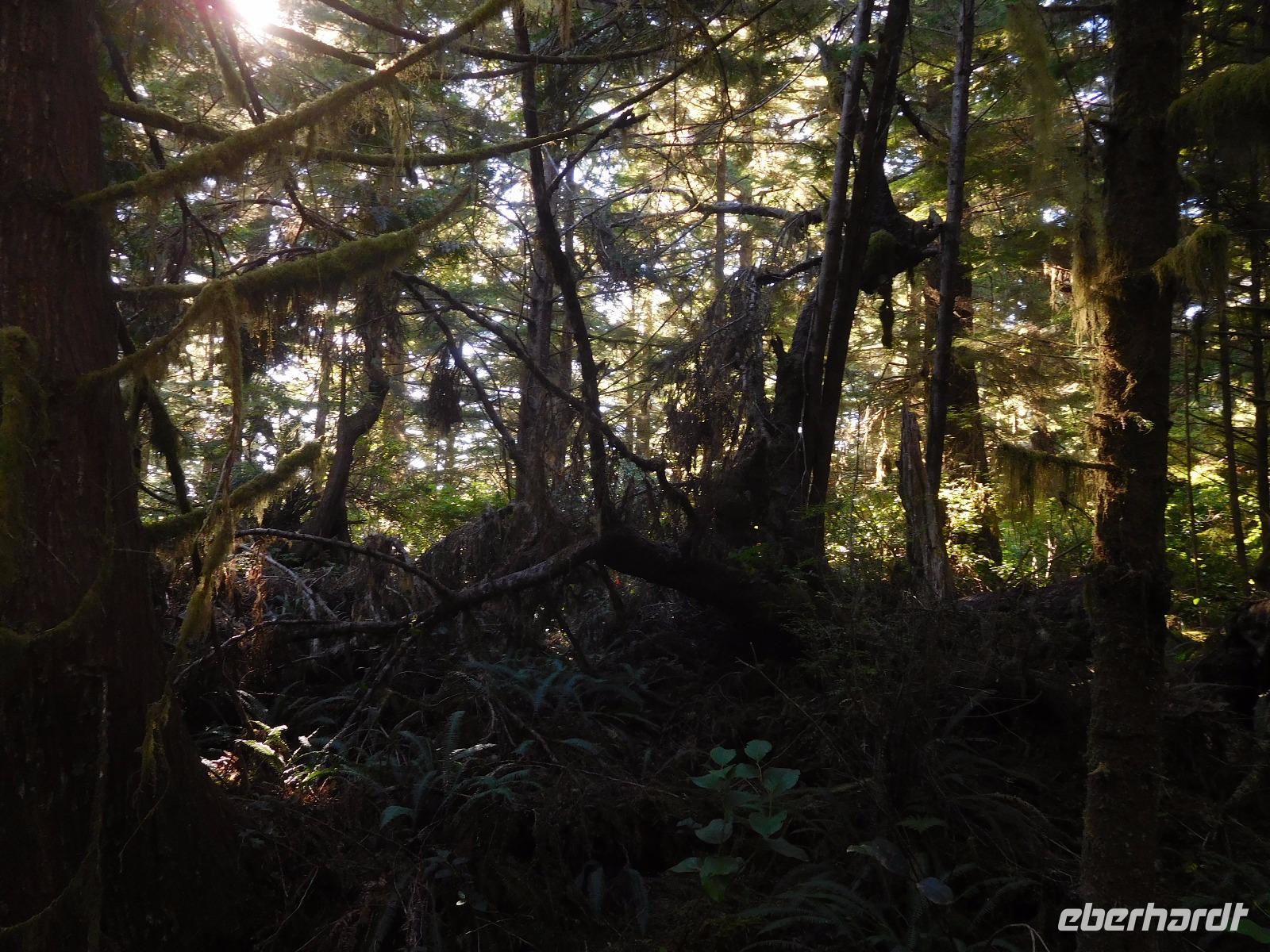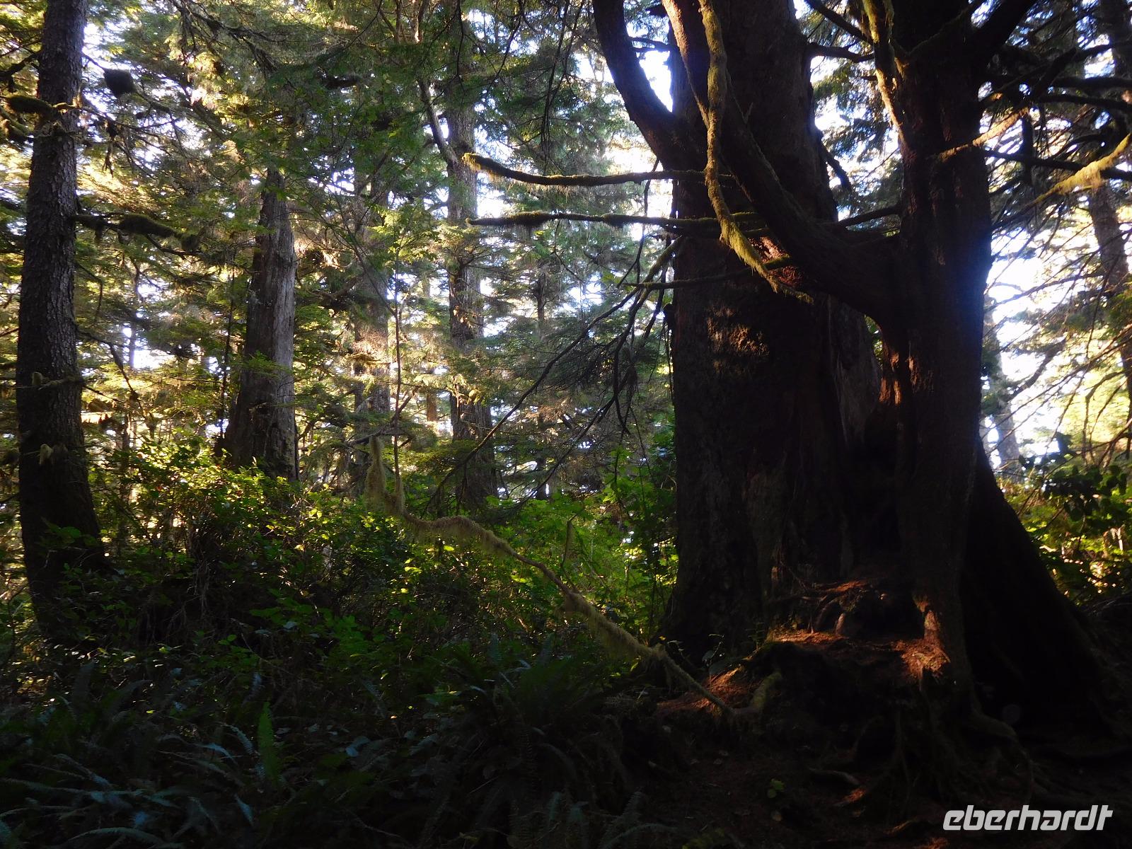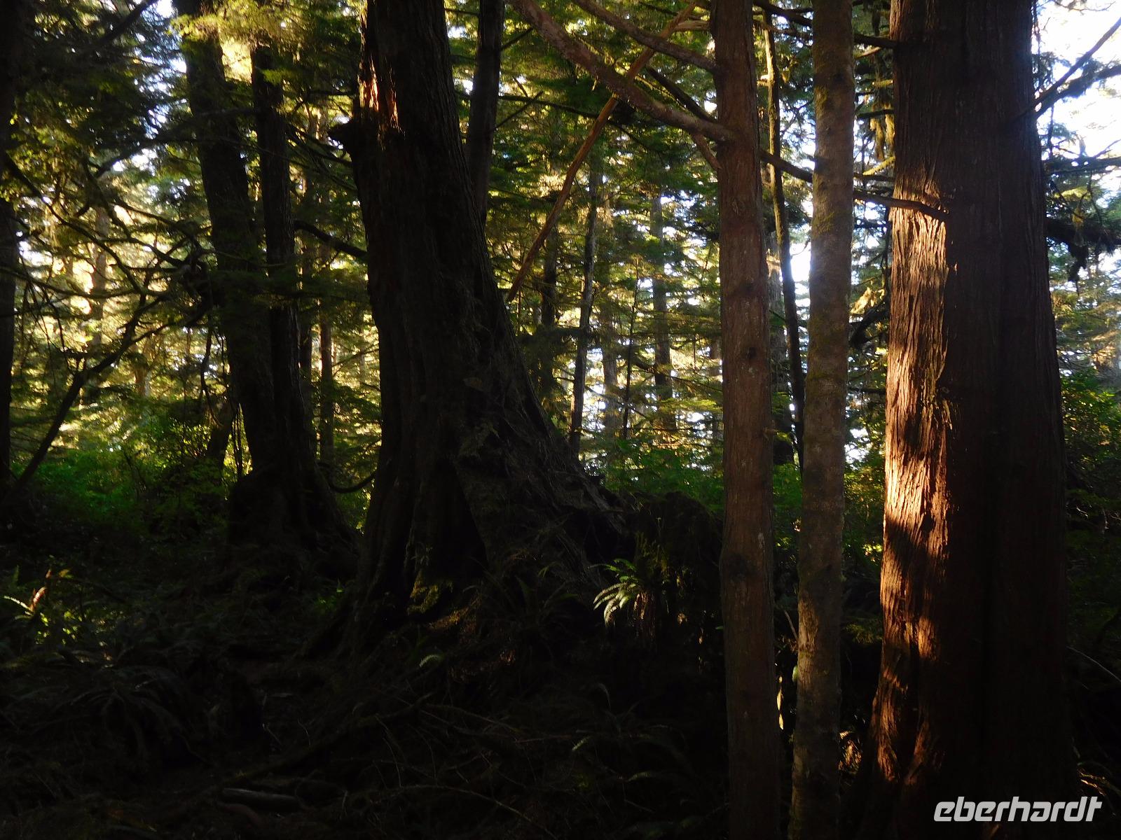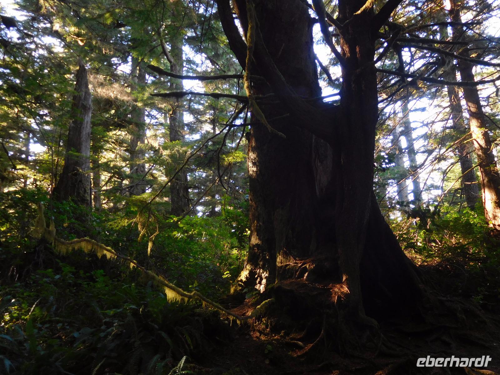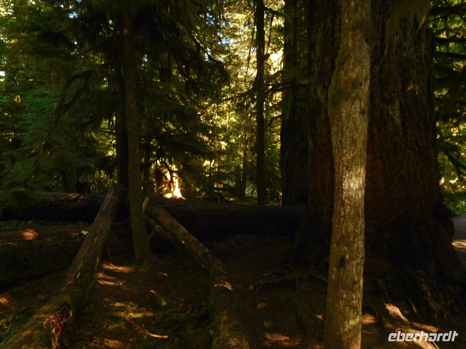 Und noch höher hinauf schauten wir, um die Baumwipfel in Cathedral Grove ausmachen zu können. Bei der Urbarmachung von Vancouver Island hatten die Bewohner diesen Ort naturbelassen, um der Nachwelt zu zeigen, auf welch mystischen Wald sie damals getroffen waren. Moose und Farne durchzogen den Wald, dessen Bäume acht Damen brauchten, um vollständig umfasst zu werden. Die ruhige Energie des Waldes war durchaus respekteinflößend.
