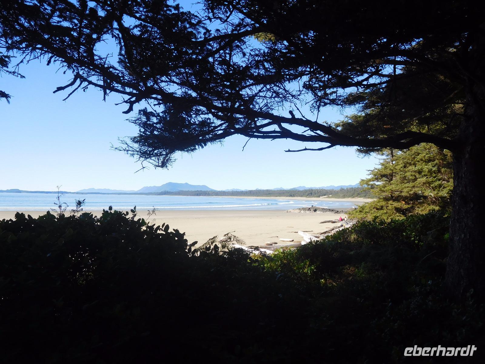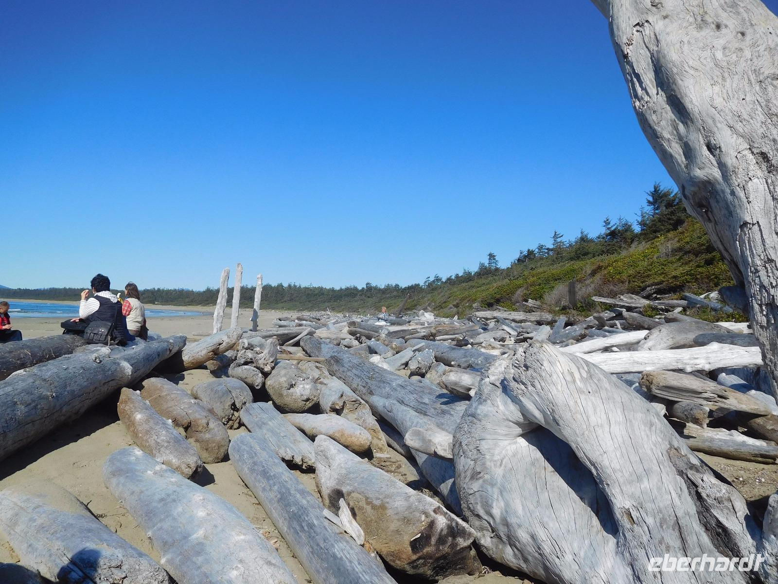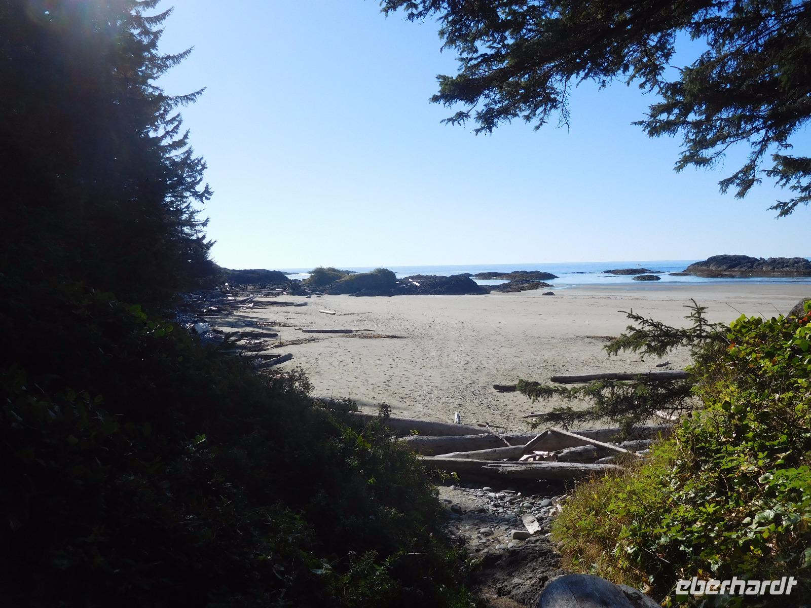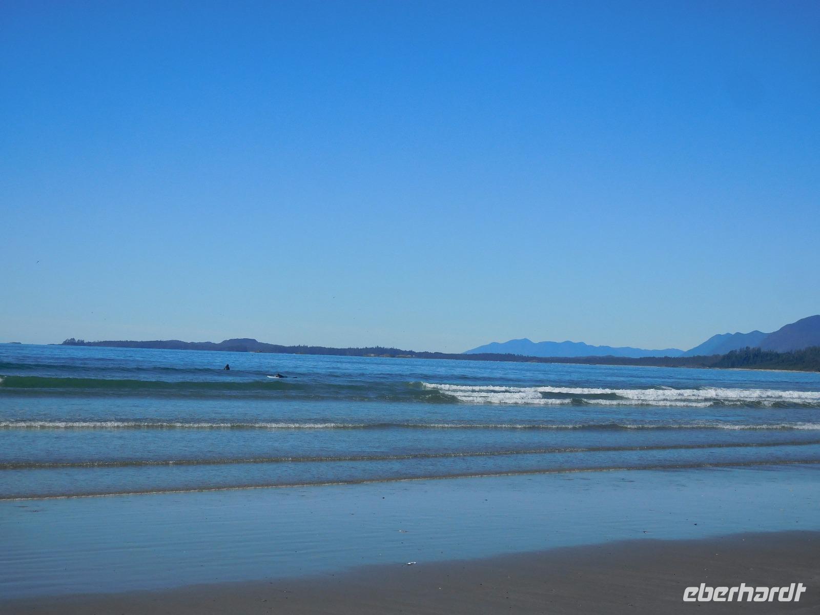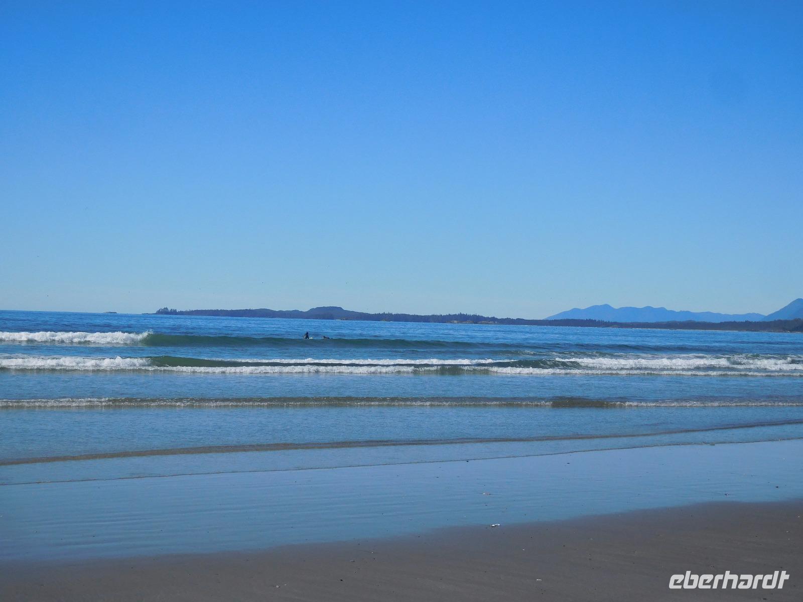 Jede Menge Treibholz, sanfte Wellen und ein paar Surfer ergänzten den Blick über den Strand. Ein kleiner Weg führte durch Sumpf durch einen tiefen Wald zu einem noch ruhiger gelegenen Wald.