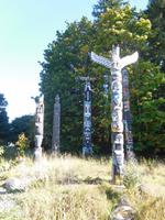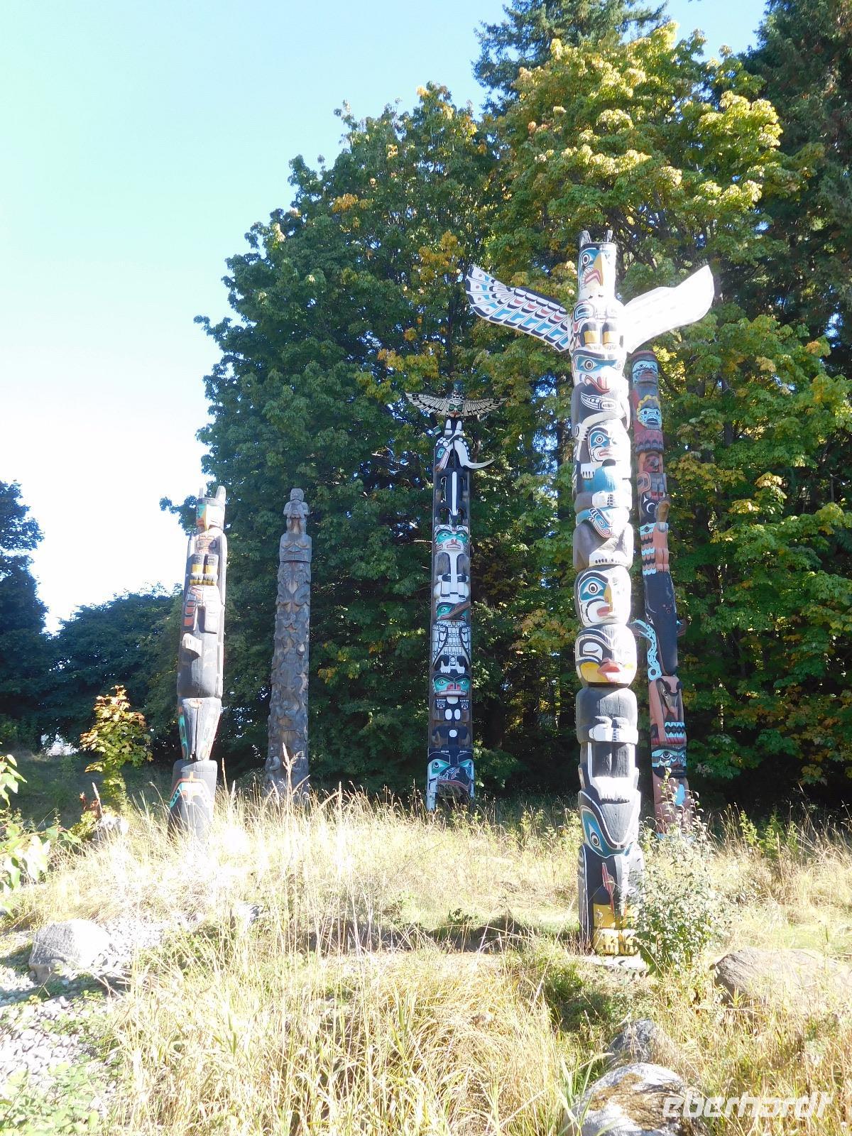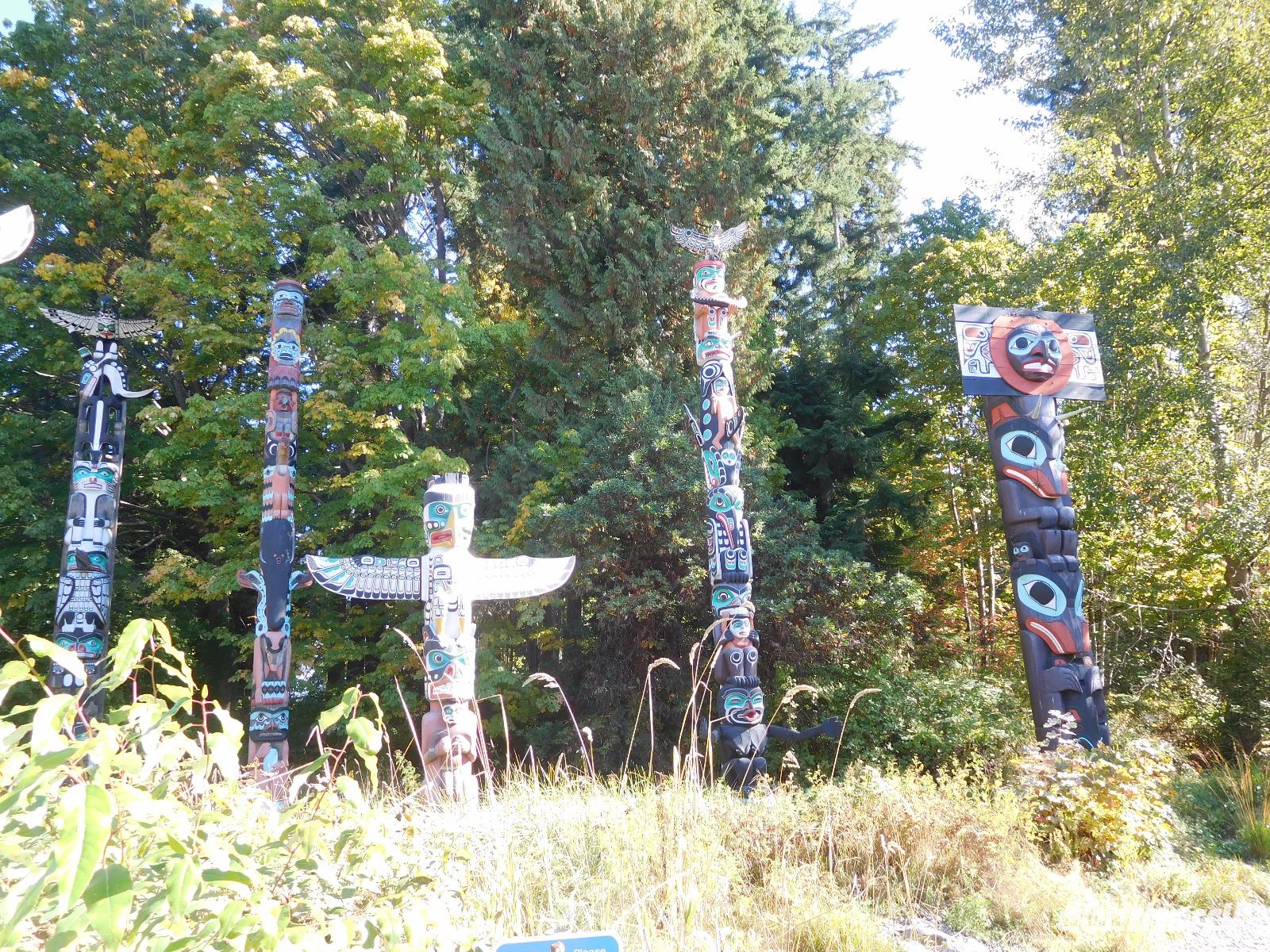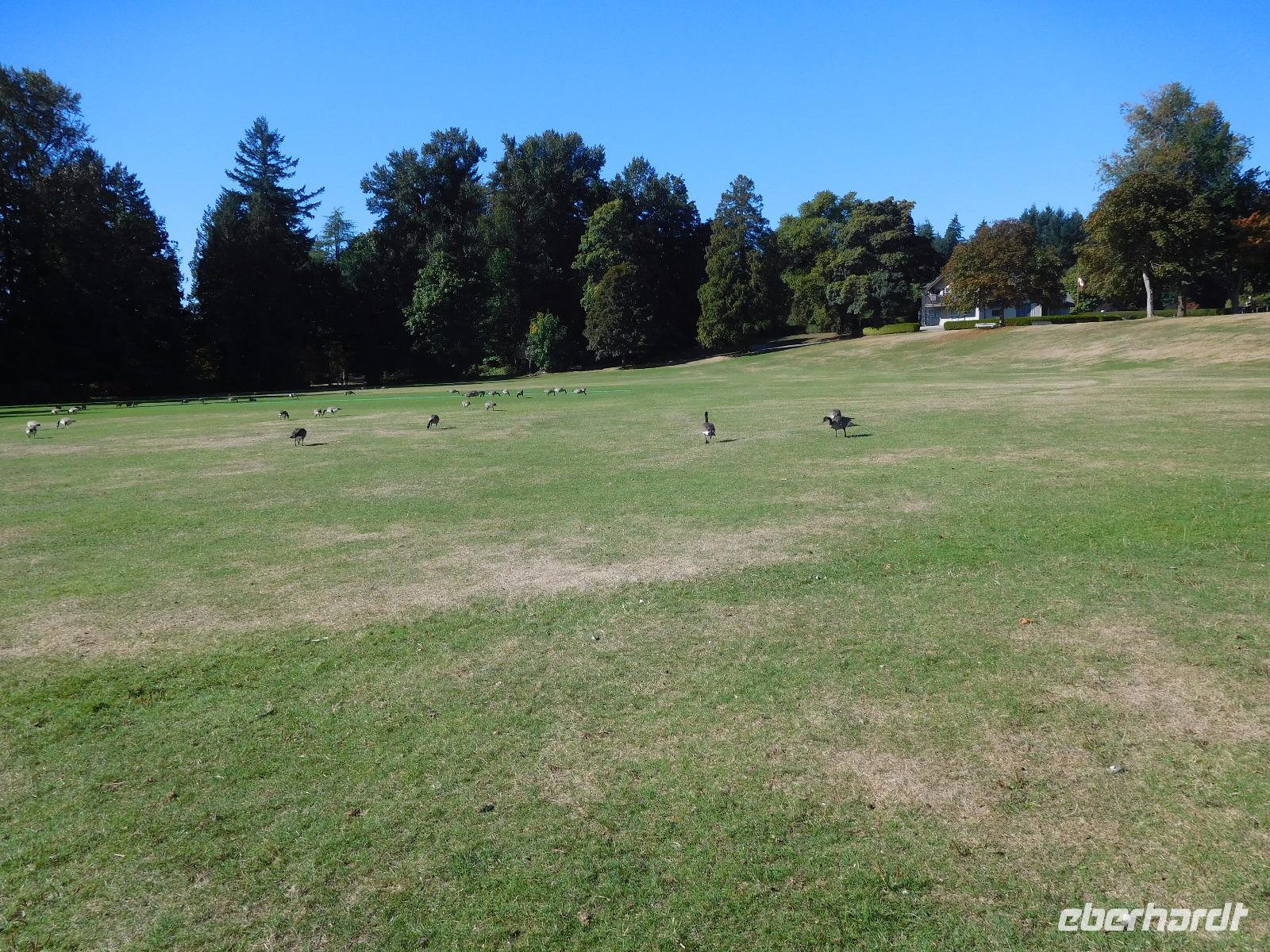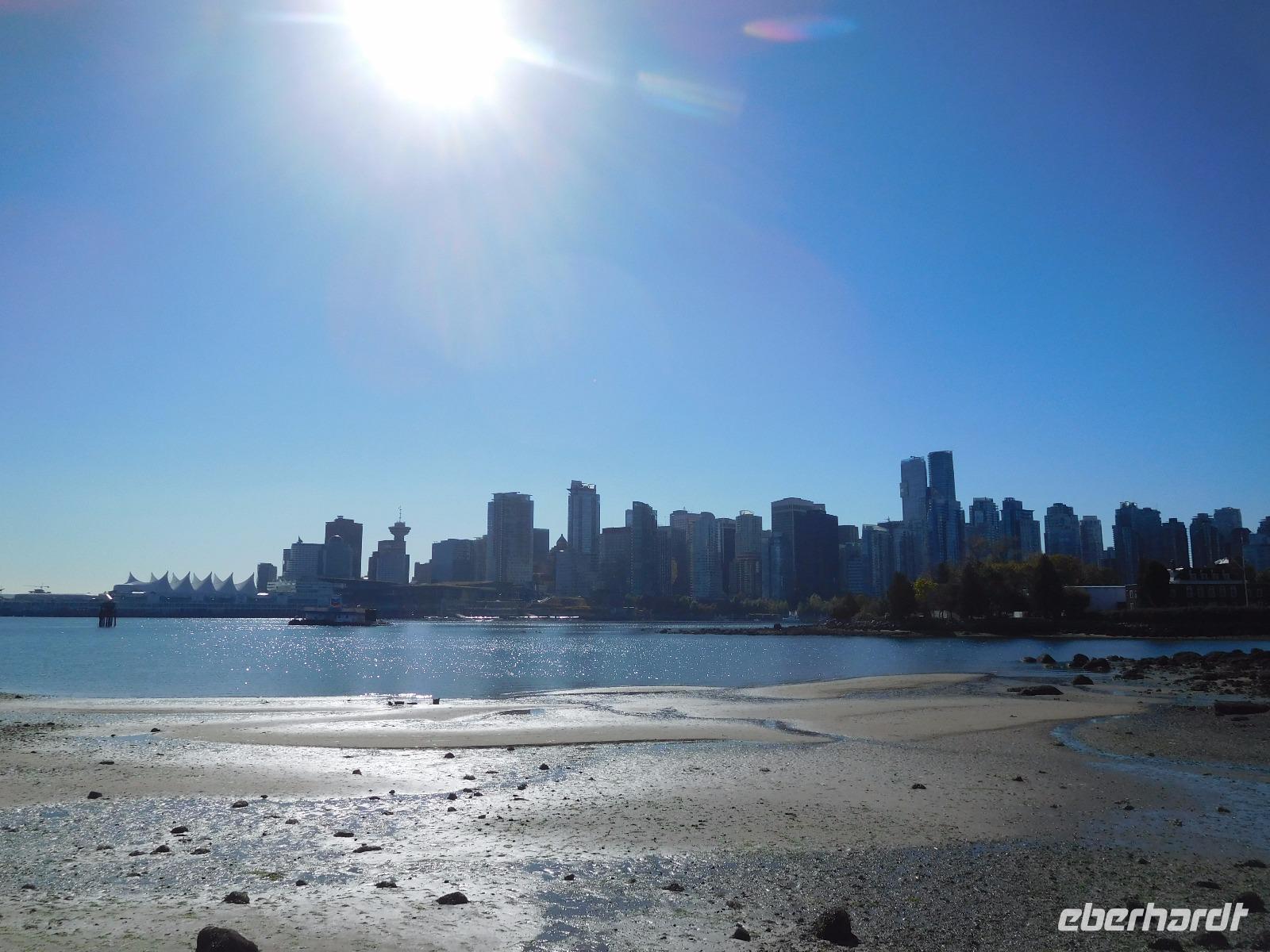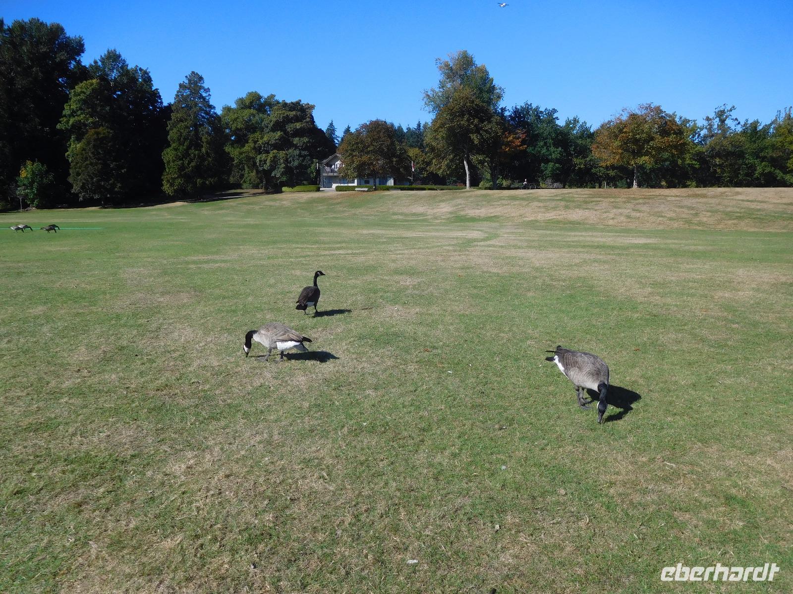 Die Skyline von Vancouver präsentierte sich im besten Sonnenschein vom Stanley Park aus. Kehrten wir der Stadt den Rücken zu, sahen wir wieder eine abwechslungsreiche Auswahl von originalen und replizierten Totempfählen. Eine Viertel Umdrehung weiter erholten sich Kanada-Gänse und ließen sich von den vielen Besuchern nicht ein bisschen aus der Ruhe bringen.