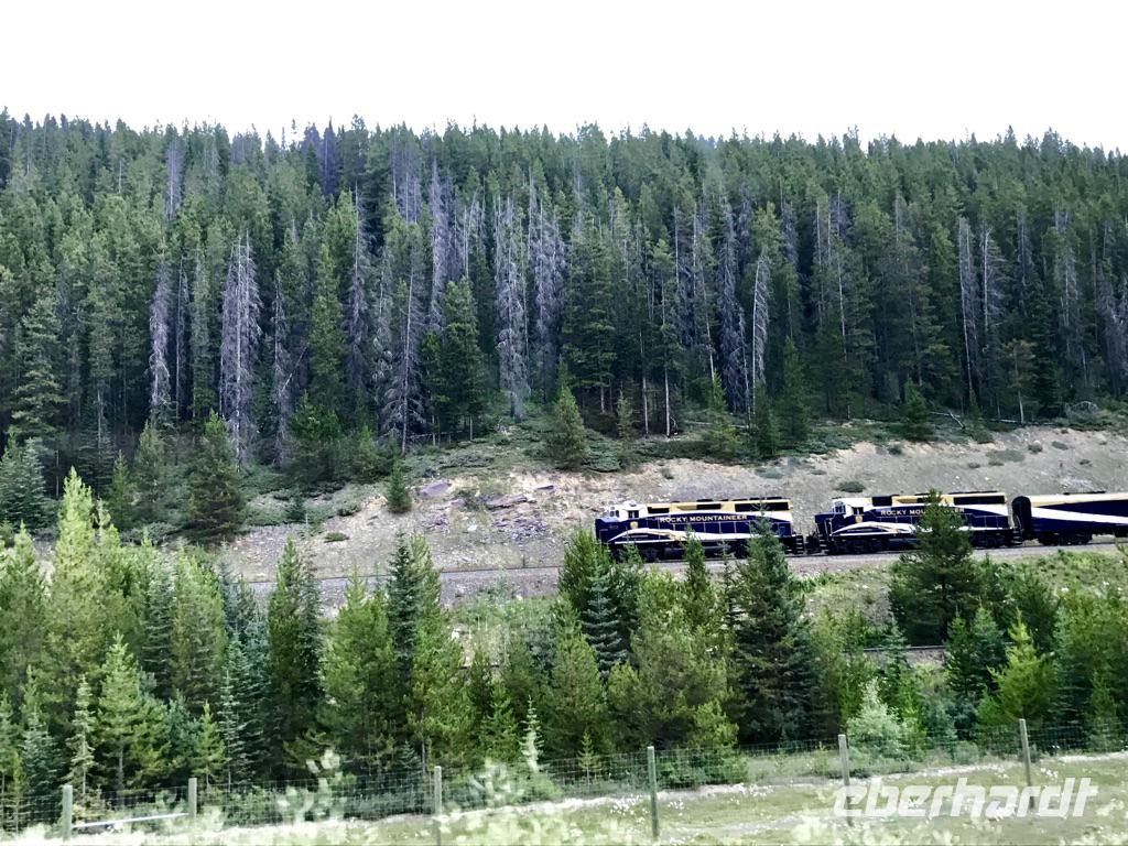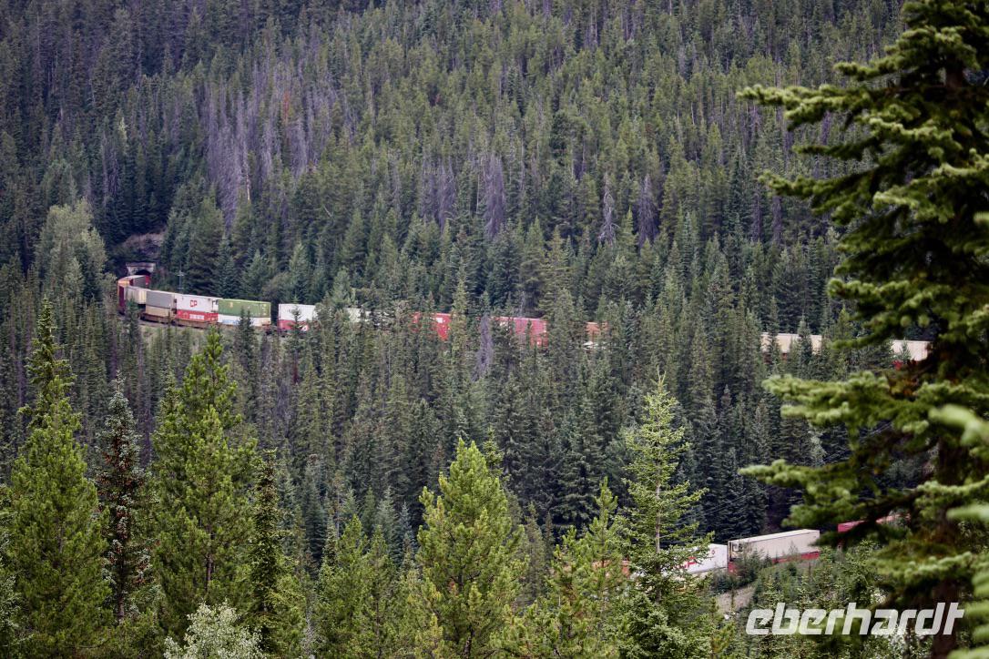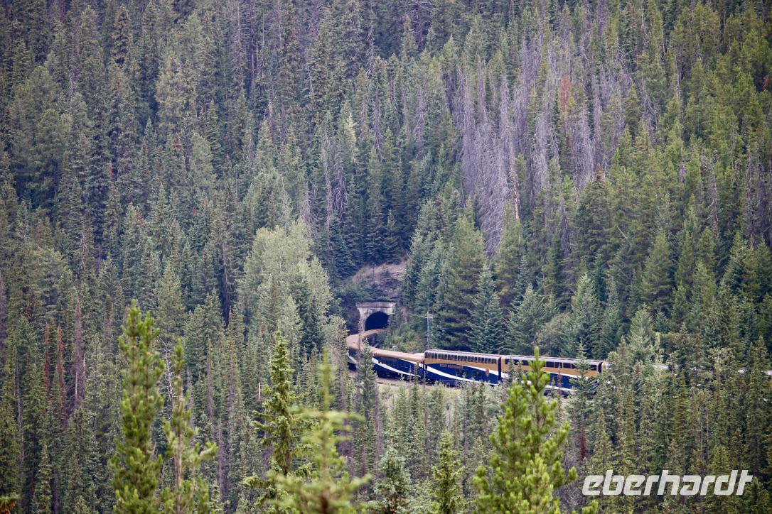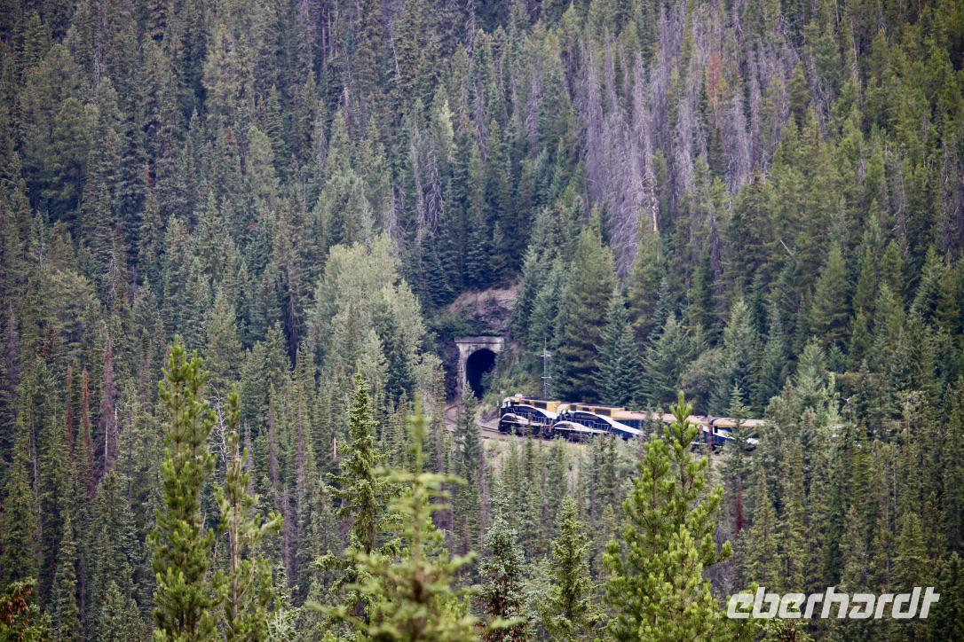 Heute sollte es nun richtig losgehen mit unserer Rundreise. Nach dem Frühstück verließen wir Calgary und fuhren in die Rocky Mountains. Während sich das Wetter am Morgen noch sehr trüb und verregnet gezeigt hatte, klarte es nun zu unserer großen Freude mehr und mehr auf. Unterwegs begegneten wir immer wieder verschiedenen Güterzügen, sowie auch dem Rocky Mountaineer, einem Panoramazug, welchen wir nur zu gern fotografierten. Besonders eindrucksvoll sollte dies bei den „Spiral Tunnels" sein, einer besonderen Konstruktion zum einfachen Überwinden des doch recht steilen Anstieges der Eisenbahngleise. Unser Timing passte perfekt, denn kaum waren wir an diesem Aussichtspunkt angekommen, ließ sich der erste Zug blicken. Weiter ging es bis zum Emerald Lake, wo sich sogar langsam die Sonne zeigte. Wir bewunderten das herrlich klare Wasser sowie die wunderschöne Farbe und fotografierten fleißig. Doch nicht nur uns beeindruckte dieses Fotomotiv. Zahlreiche weitere Busse ließen erkennen, dass aktuell Hochsaison hier in Kanada herrschte. Auch nachdem wir den Emerald Lake wieder verlassen hatten, verweilten wir noch etwas im Yoho-Nationalpark und besuchten die Natural Bridge, eine natürliche Brücke, über den Fluss Kicking Horse. Mit weiteren tollen Fotos im Gepäck erreichten wir schließlich den Takakkaw Wasserfall, welcher der zweitgrößte Wasserfall der Region ist. Wir waren sofort beeindruckt von den hinabstürzenden Wassermassen. Ein kleiner Spaziergang brachte uns dem Wasserfall immer näher, bis uns die Gischt schließlich ins Gesicht spritzte und wir den Rückweg antraten. Überall zeigten sich wieder neue Motive, die allesamt ein Foto wert waren. Anschließend verließen wir den Yoho-Nationalpark und widmeten uns nun, nach einer kleinen Mittagspause, dem Banff-Nationalpark.