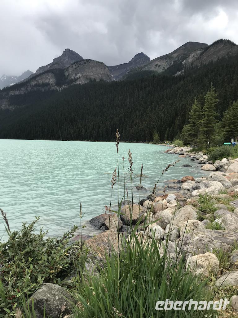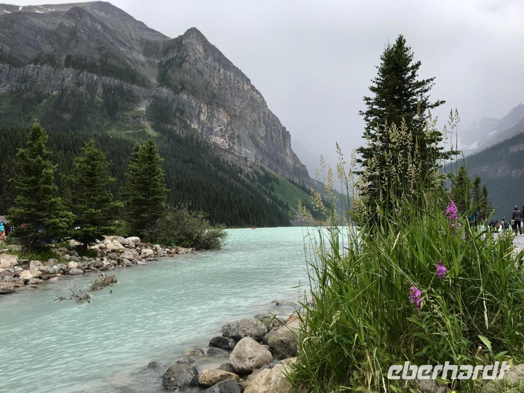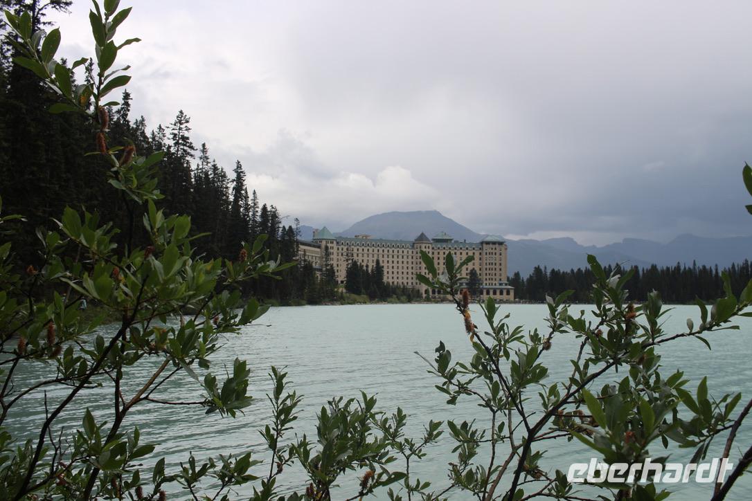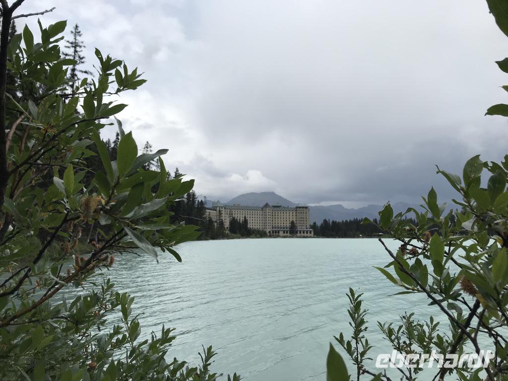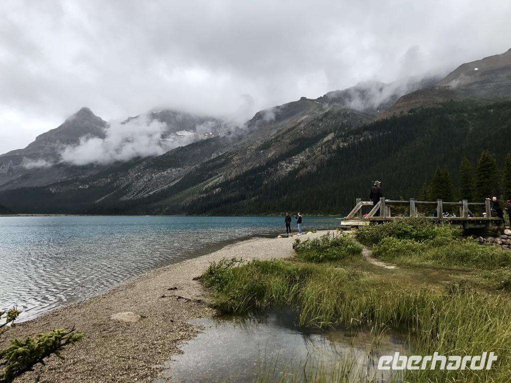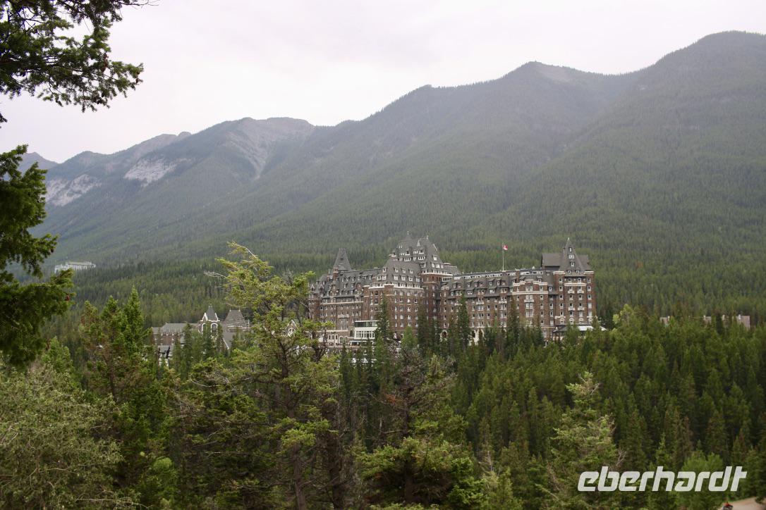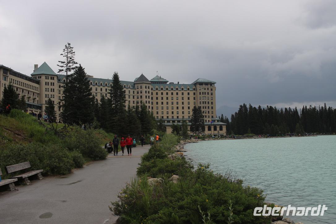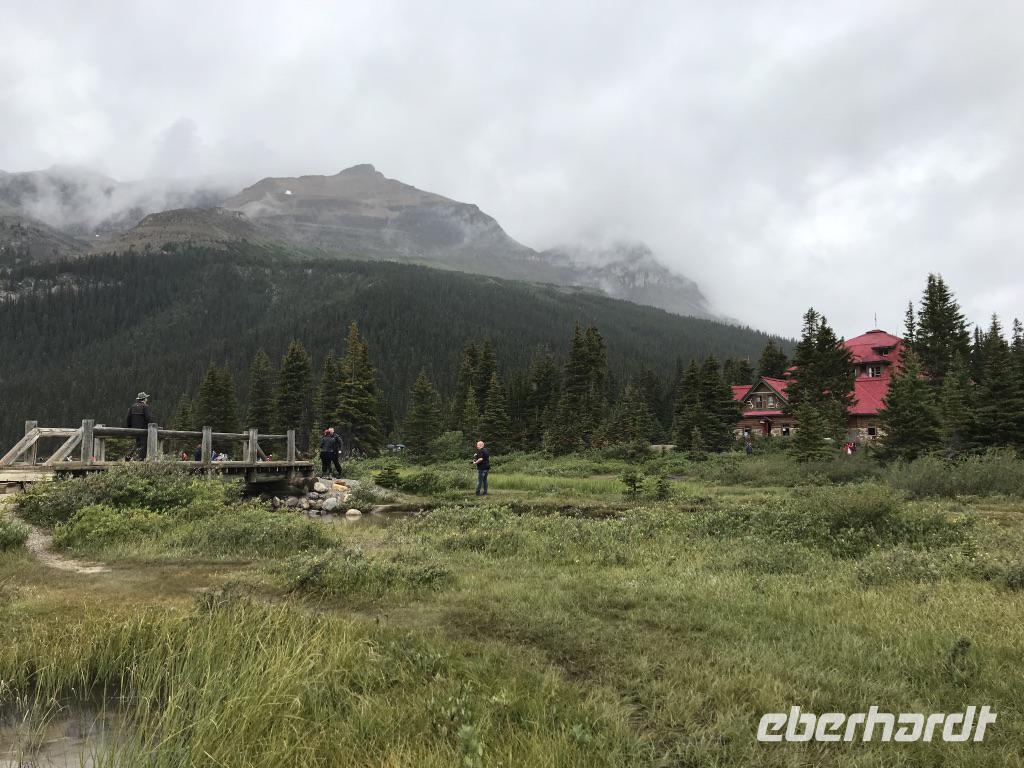 Dazu führte uns die Reise zunächst an den bekannten Lake Louise. Das Wetter zeigte sich zunächst nicht von seiner besten Seite, doch der Regen war schnell verflogen, sodass wir im Trockenen den See entlang spazieren und aus verschiedenen Perspektiven fotografieren konnten. Dem einen oder anderen wurde dabei sogar eine ganz besondere Vorstellung einiger tapferer Badenixen geboten. Anschließend fuhren wir zum Moraine Lake. Obwohl der Regen wieder einsetzte, trauten sich alle aus dem trockenen Bus hinaus und spazierten zum Aussichtspunkt hinauf. Und niemand sollte es bereuen, denn es zeigte sich uns ein spektakulärer Ausblick. Das herrlich tiefe Blau des Sees kam durch das trübe Wetter erst richtig zur Geltung und ließ uns nur staunen. Da rückte der Regen schnell in den Hintergrund. Als wir dann, zugegebenermaßen recht nass, wieder am Bus ankamen, machten wir uns auch auf den Weg nach Banff und zum Hotel. Bevor wir am Hotel ankamen, drehten wir mit dem Bus noch eine kleine orientierende Runde durch das Städtchen, um einen Eindruck davon zu erhalten. Weiterhin legten wir einen kurzen Stop am bekannten Springs Hotel ein, dem „Märchenschloss von Banff". Nun blieb noch etwas Zeit, sich im Hotel kurz auszuruhen, bevor wir uns zu einem kleinen Abendspaziergang trafen, welcher uns zum Restaurant für unser heutiges Abendessen führen sollte. Gemeinsam ließen wir den Abend ausklingen, bevor wir später wieder müde in die Betten fielen, denn die Zeitumstellung machte sich doch noch etwas bemerkbar.