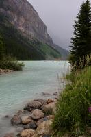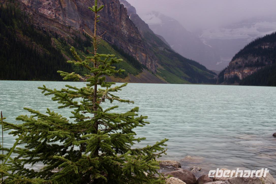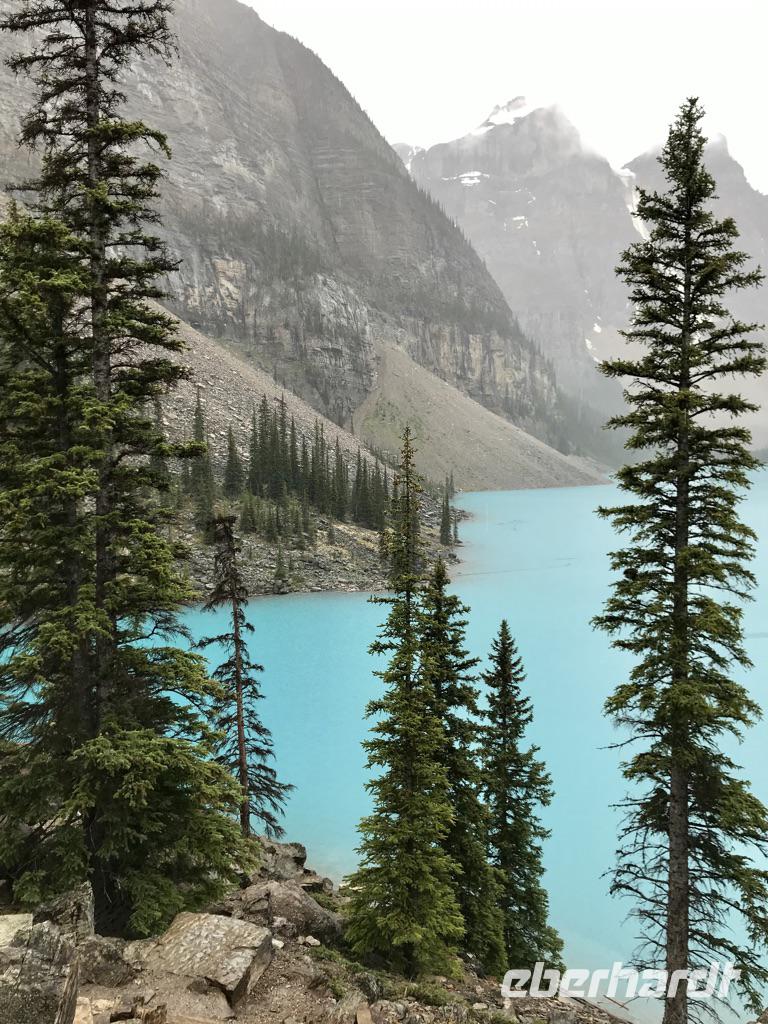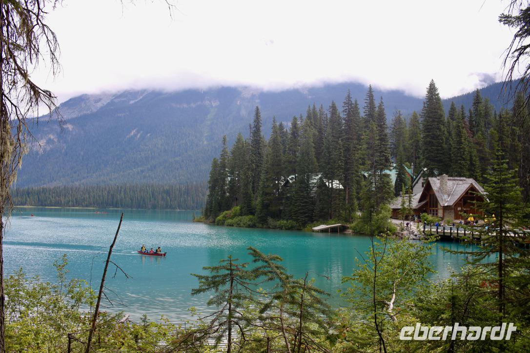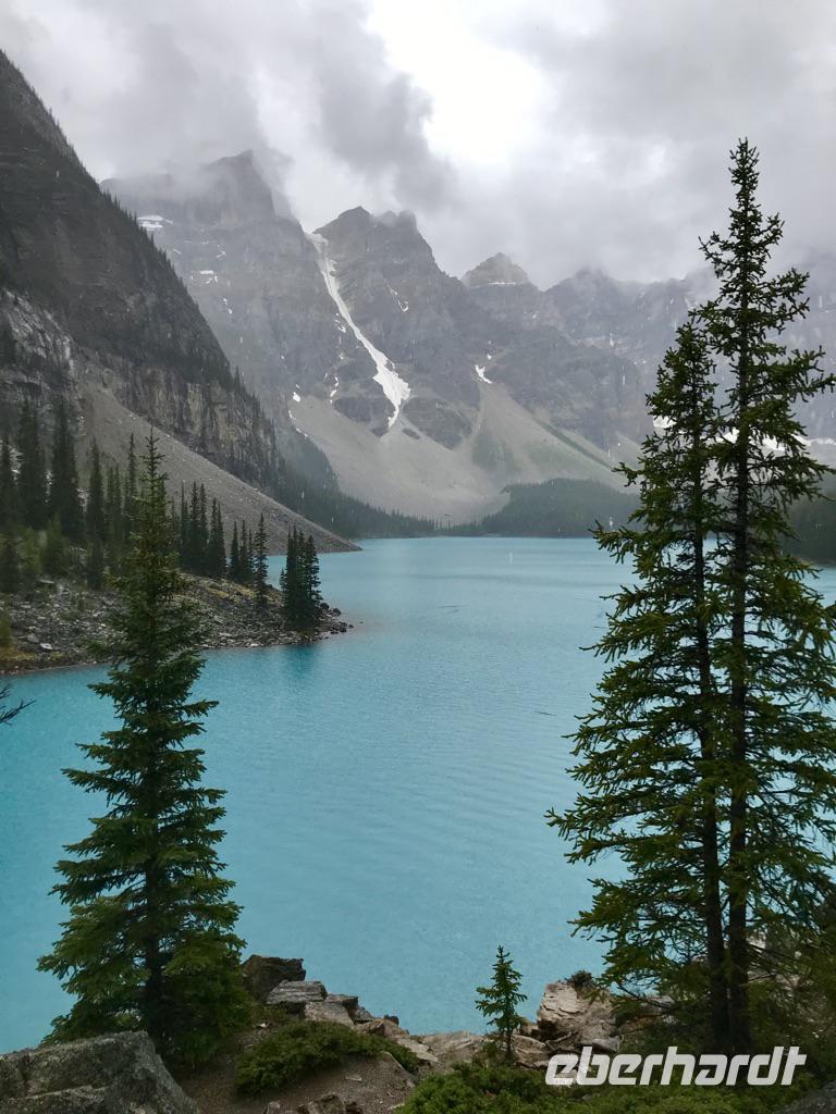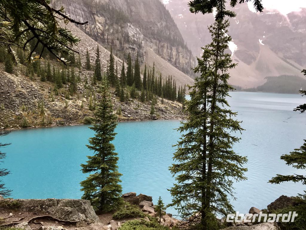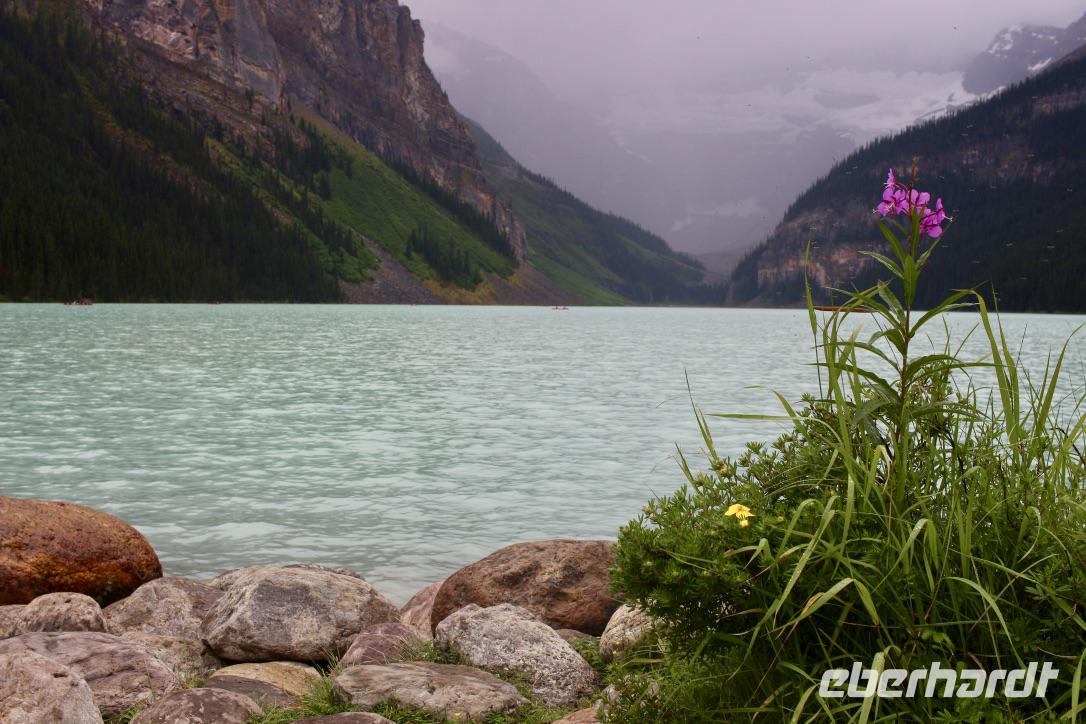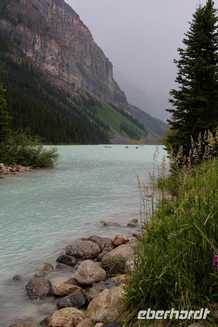 Dazu führte uns die Reise zunächst an den bekannten Lake Louise. Das Wetter zeigte sich zunächst nicht von seiner besten Seite, doch der Regen war schnell verflogen, sodass wir im Trockenen den See entlang spazieren und aus verschiedenen Perspektiven fotografieren konnten. Dem einen oder anderen wurde dabei sogar eine ganz besondere Vorstellung einiger tapferer Badenixen geboten. Anschließend fuhren wir zum Moraine Lake. Obwohl der Regen wieder einsetzte, trauten sich alle aus dem trockenen Bus hinaus und spazierten zum Aussichtspunkt hinauf. Und niemand sollte es bereuen, denn es zeigte sich uns ein spektakulärer Ausblick. Das herrlich tiefe Blau des Sees kam durch das trübe Wetter erst richtig zur Geltung und ließ uns nur staunen. Da rückte der Regen schnell in den Hintergrund. Als wir dann, zugegebenermaßen recht nass, wieder am Bus ankamen, machten wir uns auch auf den Weg nach Banff und zum Hotel. Bevor wir am Hotel ankamen, drehten wir mit dem Bus noch eine kleine orientierende Runde durch das Städtchen, um einen Eindruck davon zu erhalten. Weiterhin legten wir einen kurzen Stop am bekannten Springs Hotel ein, dem „Märchenschloss von Banff". Nun blieb noch etwas Zeit, sich im Hotel kurz auszuruhen, bevor wir uns zu einem kleinen Abendspaziergang trafen, welcher uns zum Restaurant für unser heutiges Abendessen führen sollte. Gemeinsam ließen wir den Abend ausklingen, bevor wir später wieder müde in die Betten fielen, denn die Zeitumstellung machte sich doch noch etwas bemerkbar.