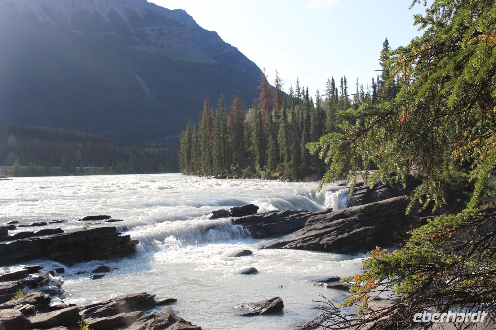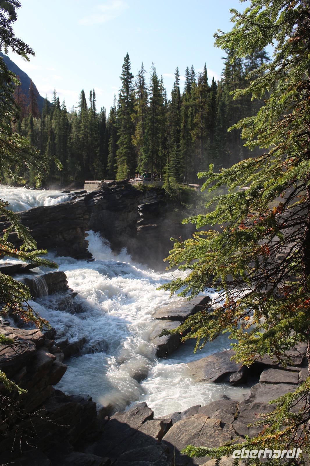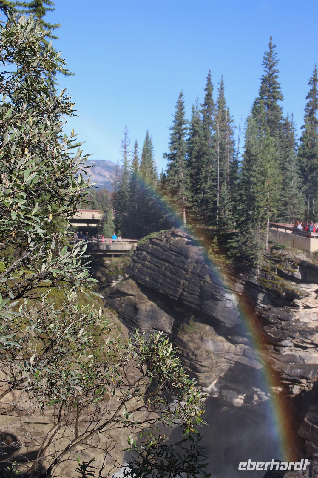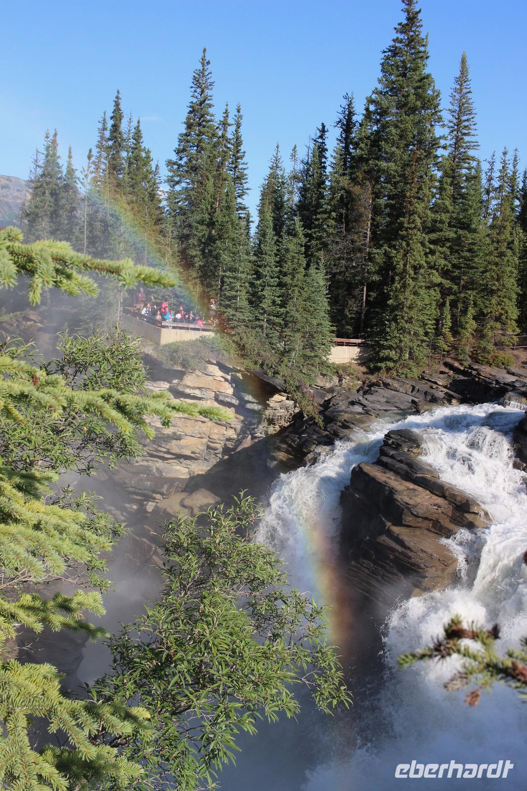 Nach einem reichhaltigen Frühstück verließen wir unser schönes Hotel bei bestem Wetter mit blauem Himmel und Sonnenschein. Vom Jasper Nationalpark konnten wir uns jedoch noch nicht ganz trennen, so fuhren wir zunächst noch zu den Athabasca Falls. Hier unternahmen wir einen kleinen Rundweg und bestaunten die Naturgewalten. Dabei zeigte sich uns auch ein wunderschöner Regenbogen, der die Fotos perfekt machte. Anschließend unternahmen wir noch eine kleine Rundfahrt durch das Örtchen Jasper, bevor wir den schönen Nationalpark dann endgültig hinter und ließen und in Richtung Westen weiterfuhren.