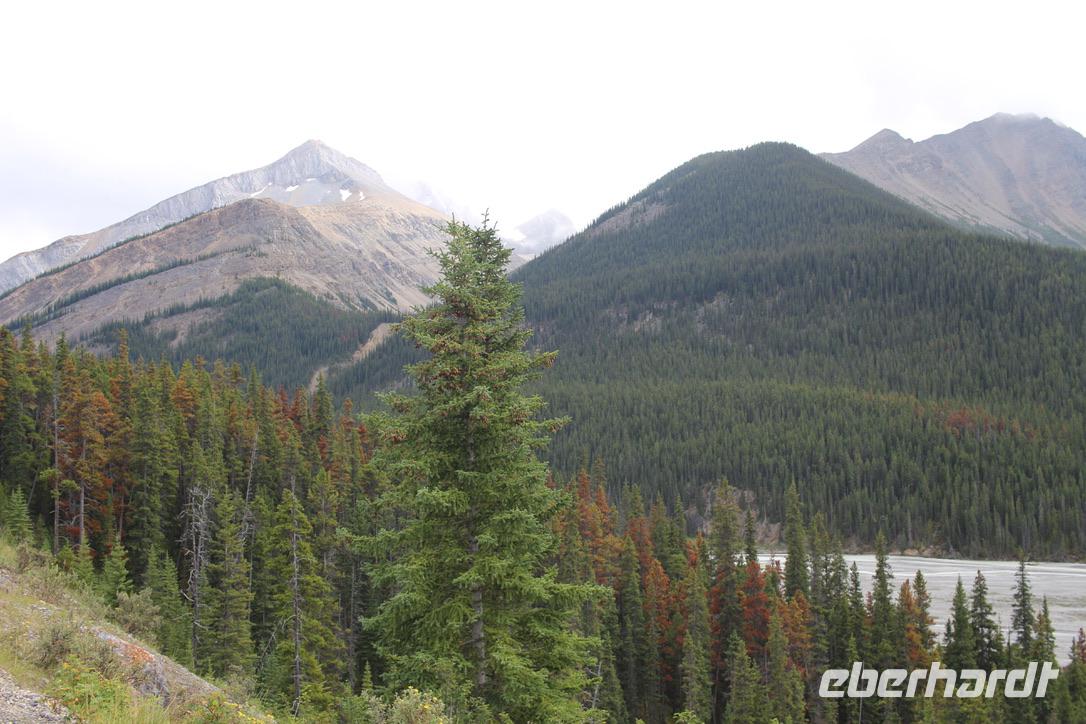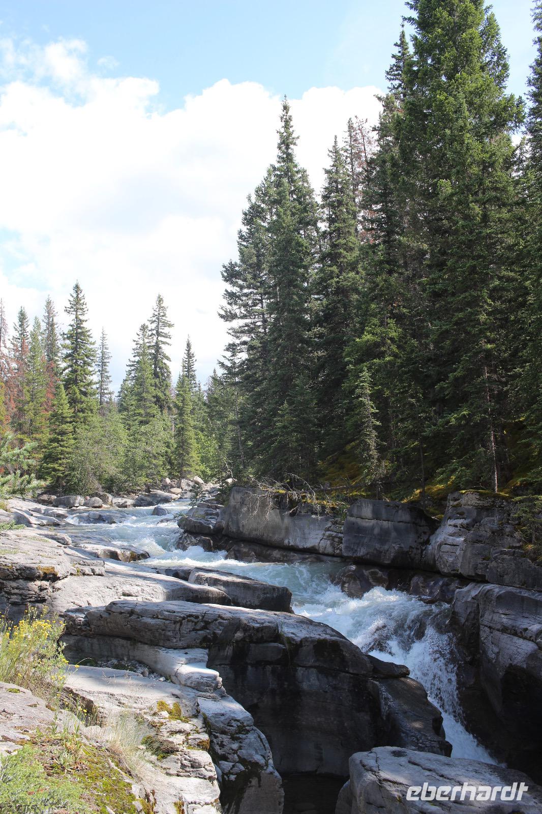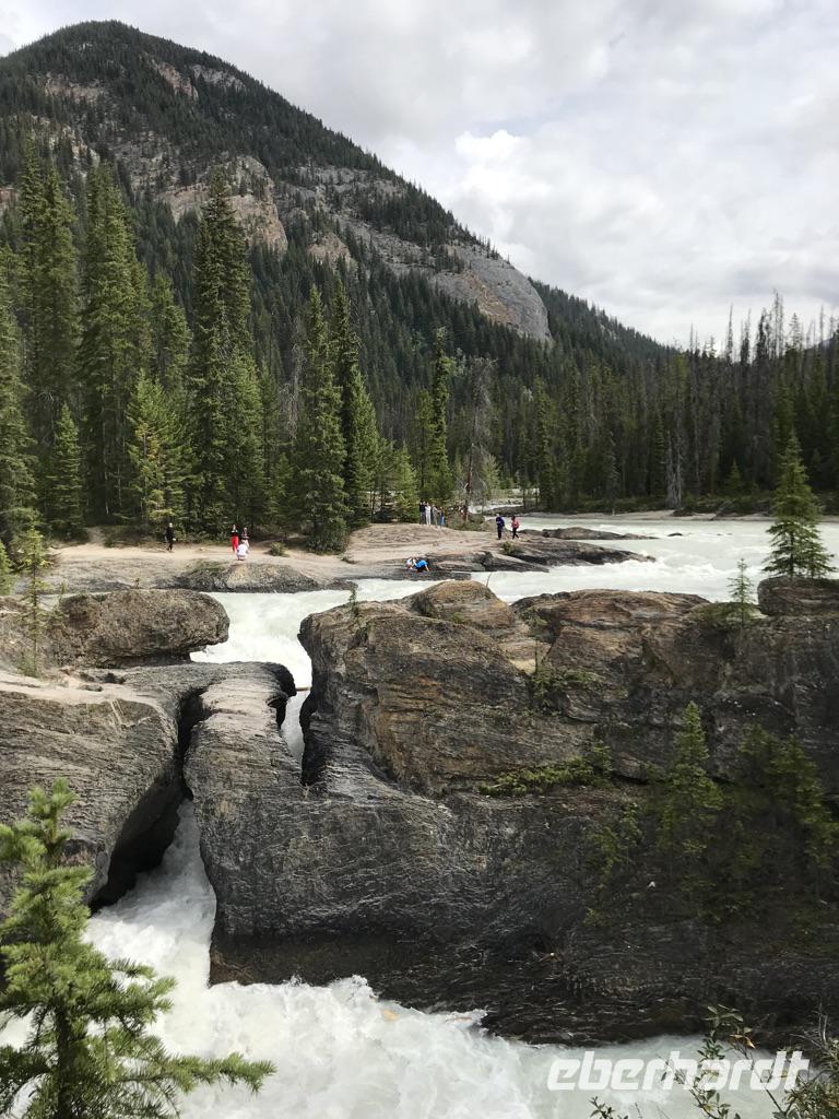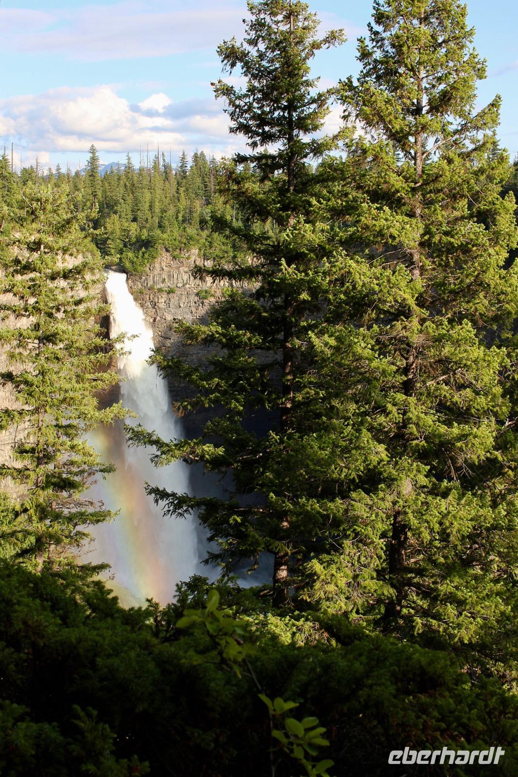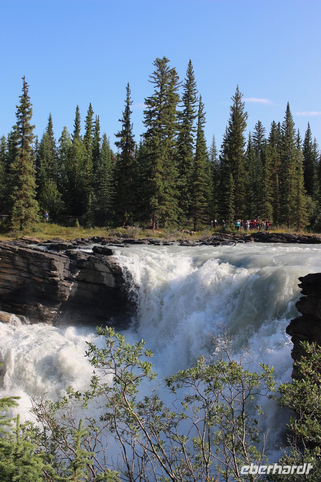 Nach einem reichhaltigen Frühstück verließen wir unser schönes Hotel bei bestem Wetter mit blauem Himmel und Sonnenschein. Vom Jasper Nationalpark konnten wir uns jedoch noch nicht ganz trennen, so fuhren wir zunächst noch zu den Athabasca Falls. Hier unternahmen wir einen kleinen Rundweg und bestaunten die Naturgewalten. Dabei zeigte sich uns auch ein wunderschöner Regenbogen, der die Fotos perfekt machte. Anschließend unternahmen wir noch eine kleine Rundfahrt durch das Örtchen Jasper, bevor wir den schönen Nationalpark dann endgültig hinter und ließen und in Richtung Westen weiterfuhren.