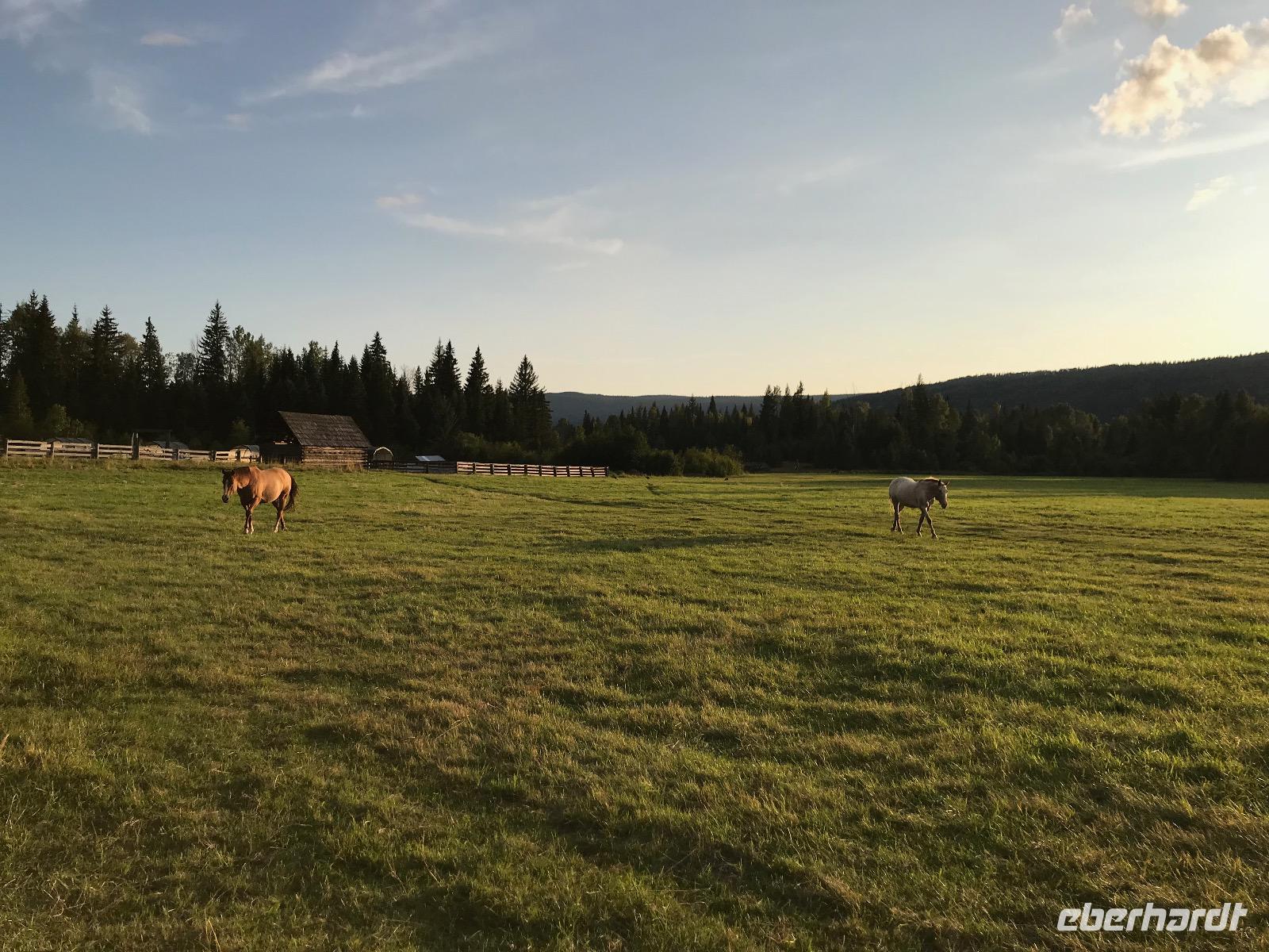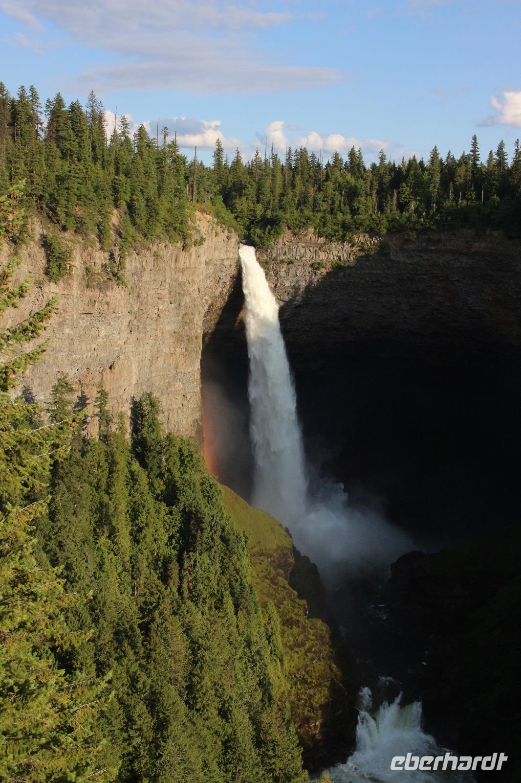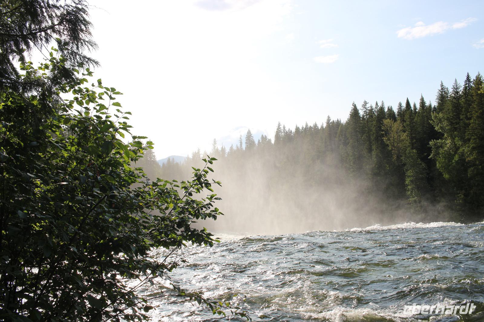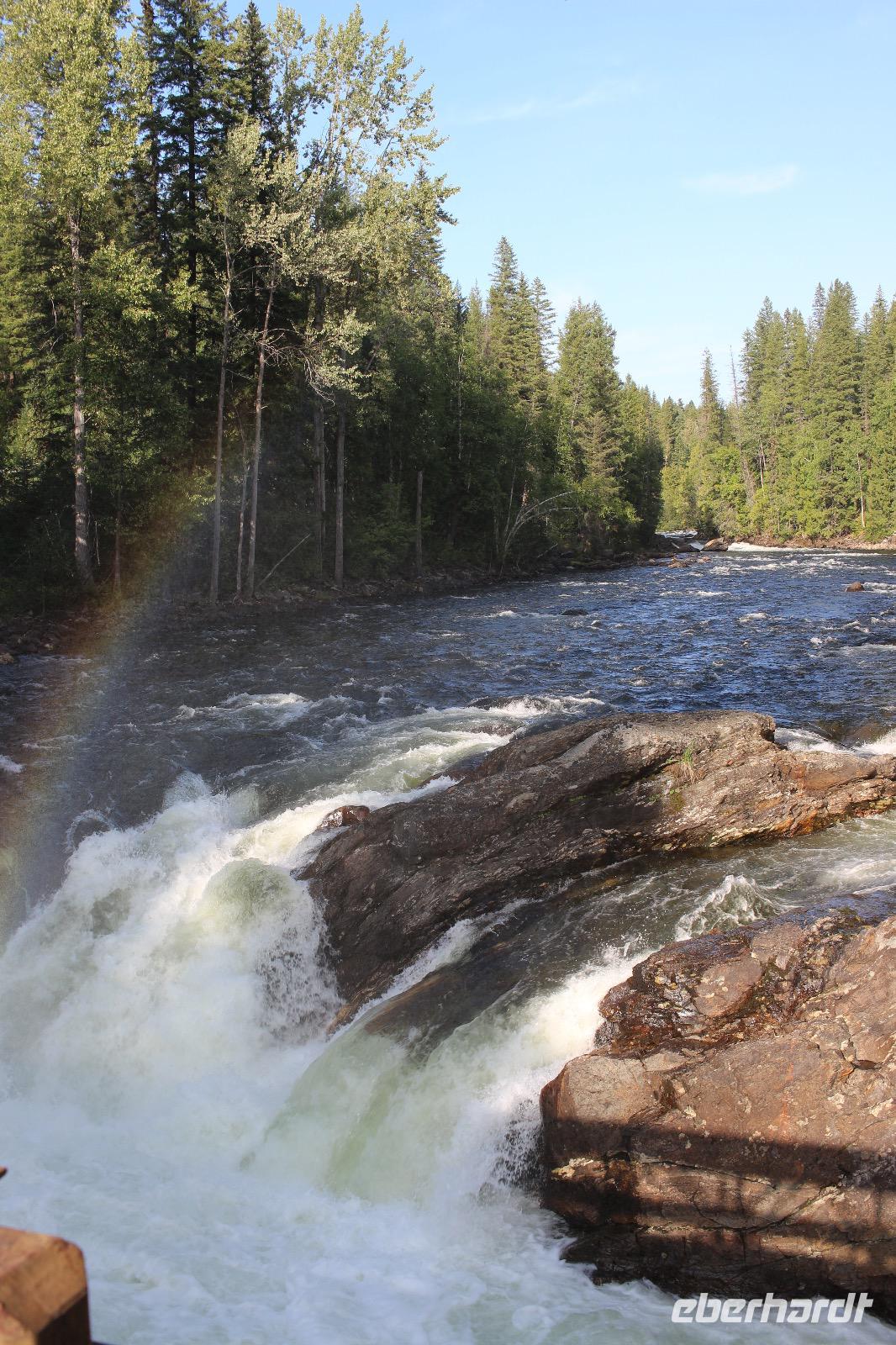 In Velmont legten wir einen kleinen Stop ein, um den einen tapferen Lachs zu suchen, der den schweren Weg hierher geschafft hatte. Jedoch wollte er sich uns nicht zeigen, wahrscheinlich war er längst weitergezogen. Nach einer recht langen Fahrt erreichten wir schließlich das kleine Städtchen Clearwater. Zunächst hielten wir kurz am hiesigen Besucherzentrum, bevor wir unser Hotel bezogen. Doch hier hielten wir uns nicht lange auf, wollten wir doch den Wells Gray Provincial Park erkunden. So fuhren wir wenig später zu diesem Park, wo uns wieder einige schöne Wasserfälle erwarteten. Wir begannen mit den etwas kleineren Spahats Falls, wo erste Fotos gemacht werden konnten. Anschließend führte uns unsere Tour zu den Dawson Falls, welche nicht zu Unrecht den Spitznamen „Mini-Niagarafälle" tragen. Wir bestaunten die herunterstürzenden Wassermassen und fotografierten fleißig. Um einen noch besseren Blick erlangen zu können, begaben wir uns sogar auf eine kleine Klettertour hinunter zum Fluss, von wo aus wir die Wasserfälle perfekt fotografieren konnten. Alle meisterten die kleine sportliche Herausforderung gut, sodass wir wieder gesund und munter am Bus ankamen. Anschließend zeigte sich uns ein kleinerer Wasserfall (Mush Bowl), an welchem wir zu Fuß eine kleine Brücke überquerten, bevor es zu den bekannten Helmecken Falls gehen sollte. Wieder ein ganz anderer Wasserfall und trotzdem wunderschön! Aufgrund der für uns sehr günstigen Sonneneinstrahlung konnten wir an verschiedenen Stellen des Wasserfalls immer wieder einen Regenbogen erkennen, welcher unsere Fotos natürlich perfekt machte. Als unsere Mägen langsam zu knurren begannen, fuhren wir zur Wells Gray Ranch. Hier fühlten wir uns wie in einem Westernfilm. Durch eine Schwingtür gelangten wir in den Saloon, bestellten am Tresen unser Bier und machten es uns an den Tischen im Garten bequem - umgeben von Planwagen und riesengroßen Weiden für die Pferde. Um uns herum schier unendliche Weiten. Begrüßt wurden wir von zwei Schweizern und einer Österreicherin, welche alle im perfekten Cowboy-Outfit gekleidet waren. Während wir die Atmosphäre genossen, die Pferde auf der Weide beobachten und in der Ferne die Sandkraniche fotografierten, wurde unser Abendessen zubereitet. Schließlich erwarteten uns frisch gegrillte, saftige Steaks, dazu Bohnen und Backkartoffeln. Wir ließen es uns schmecken und saßen noch lange zusammen, bevor wir zurück zu unserem Hotel fuhren, wo wir müde in unsere Betten fielen.