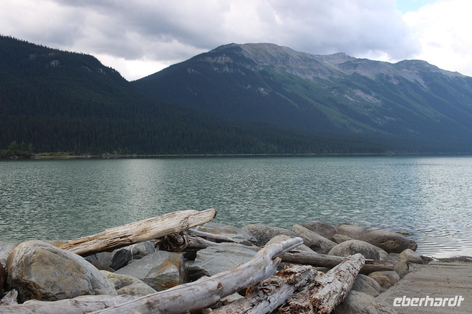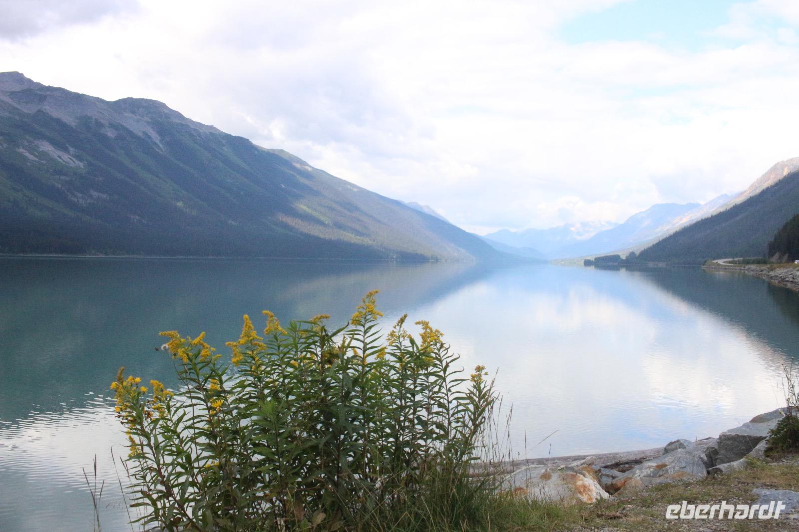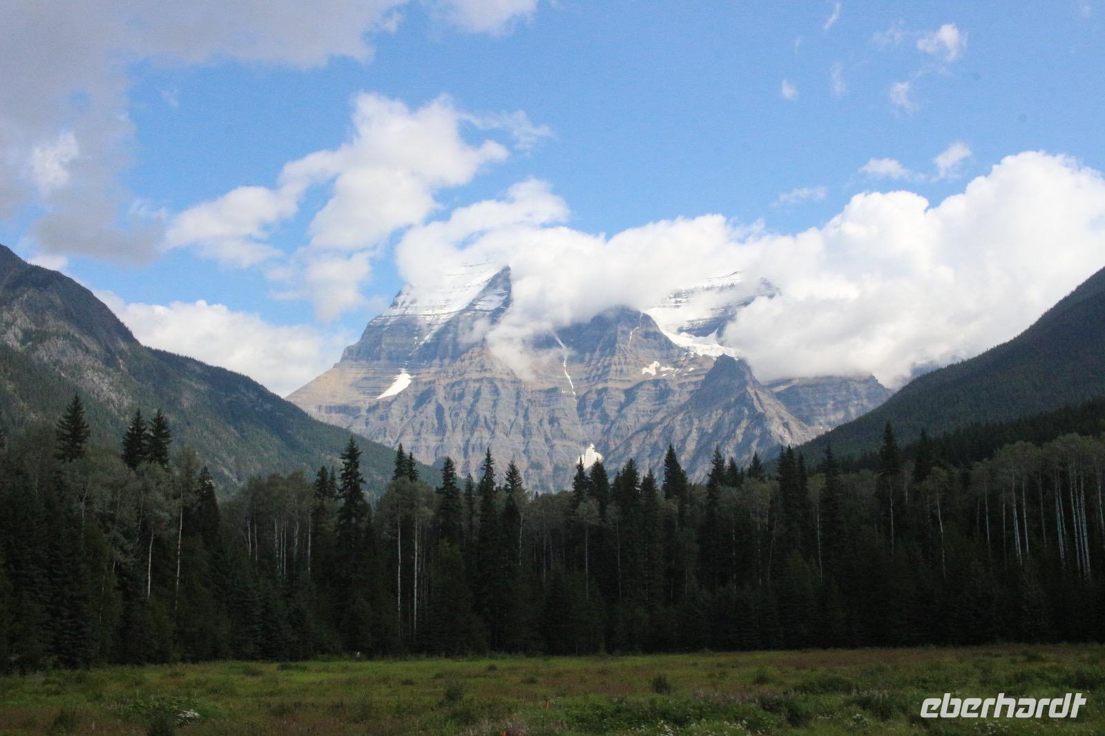 Nach einiger Zeit erreichten wir schließlich British Columbia. Nun war es Zeit, die Uhren umzustellen. Ab jetzt betrug der Zeitunterschied zu Deutschland 9 Stunden. Nach verschiedenen Fotostops an der Provinzgrenze sowie am Moose Lake erreichten wir schließlich den Mount Robson Provincial Park und auch das dazugehörige Besucherzentrum. Von hier aus hatten wir einen guten Blick auf den Mount Robson, den höchsten Berg der kanadischen Rockys. Leider zeigte sich uns dieser nicht ganz in voller Pracht, die Wolken an der Spitze wollten sich nicht vollständig verziehen. Dennoch zeigte sich uns ein herrliches Bild und wir fotografierten fleißig. Nachdem der eine oder andere noch eine Kleinigkeit gegessen oder getrunken hatte, setzten wir unsere Fahrt fort.