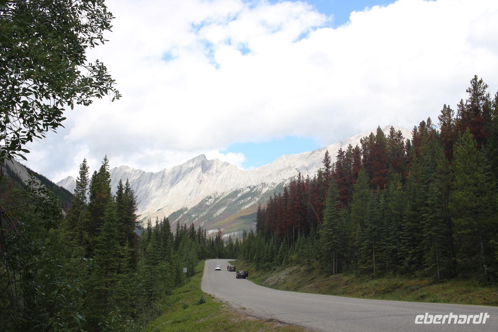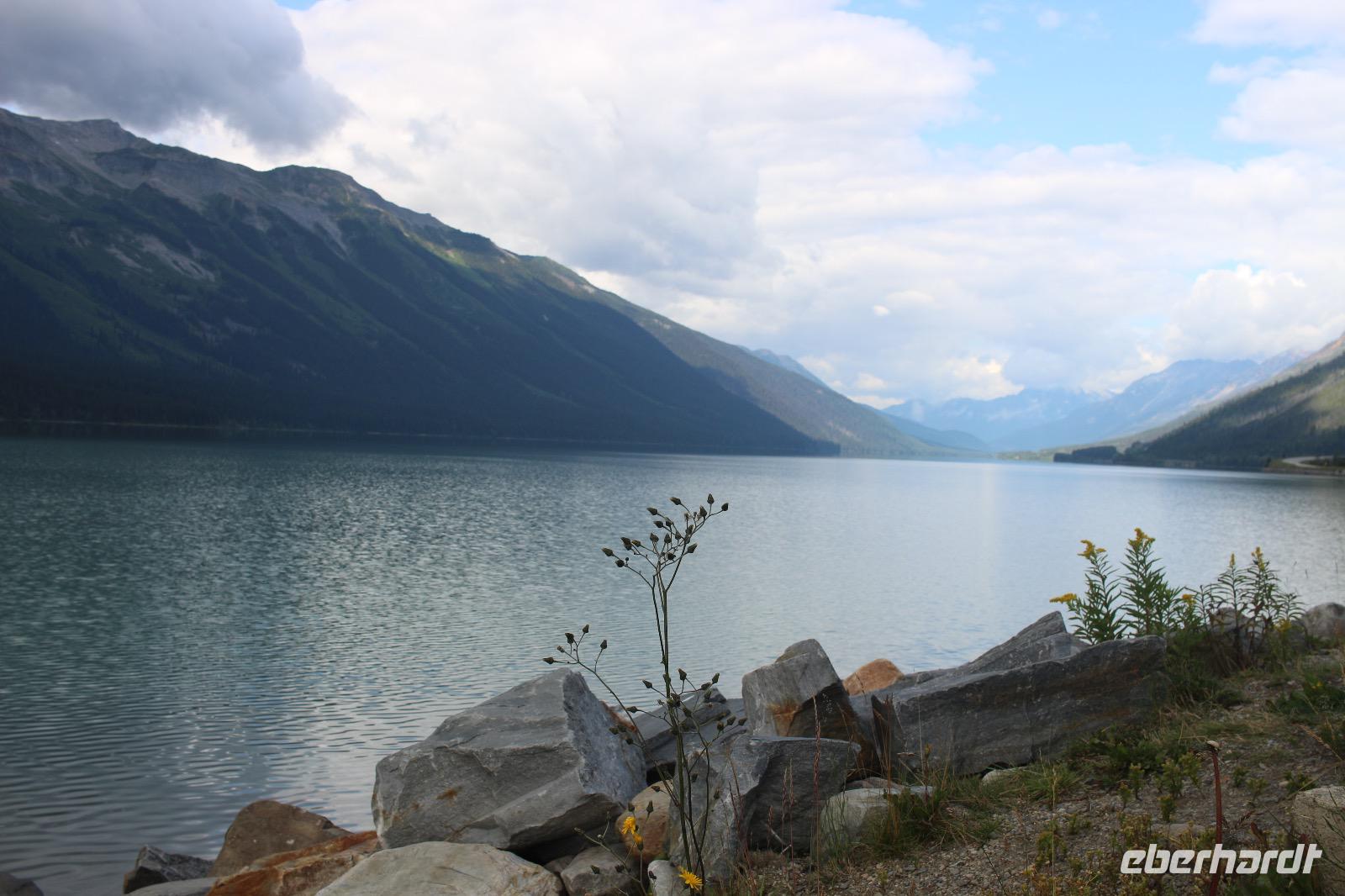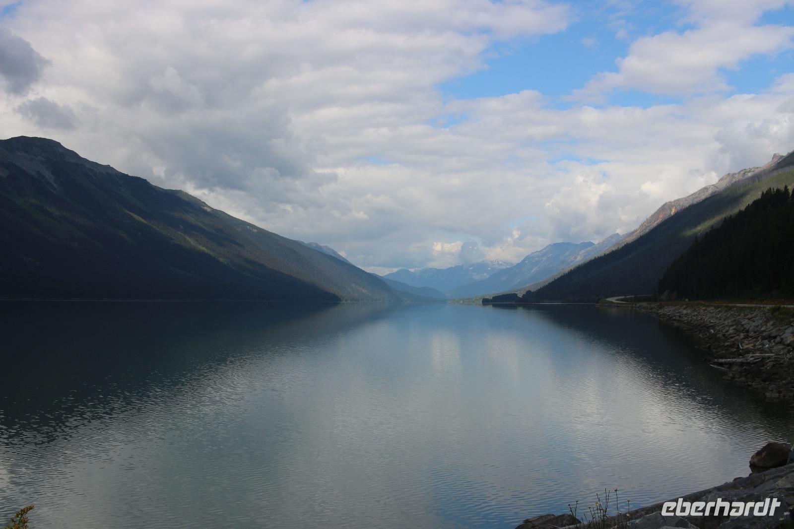 Nach einiger Zeit erreichten wir schließlich British Columbia. Nun war es Zeit, die Uhren umzustellen. Ab jetzt betrug der Zeitunterschied zu Deutschland 9 Stunden. Nach verschiedenen Fotostops an der Provinzgrenze sowie am Moose Lake erreichten wir schließlich den Mount Robson Provincial Park und auch das dazugehörige Besucherzentrum. Von hier aus hatten wir einen guten Blick auf den Mount Robson, den höchsten Berg der kanadischen Rockys. Leider zeigte sich uns dieser nicht ganz in voller Pracht, die Wolken an der Spitze wollten sich nicht vollständig verziehen. Dennoch zeigte sich uns ein herrliches Bild und wir fotografierten fleißig. Nachdem der eine oder andere noch eine Kleinigkeit gegessen oder getrunken hatte, setzten wir unsere Fahrt fort.
