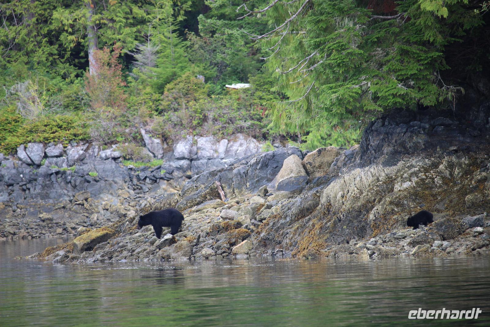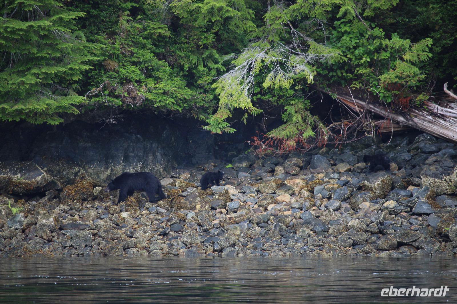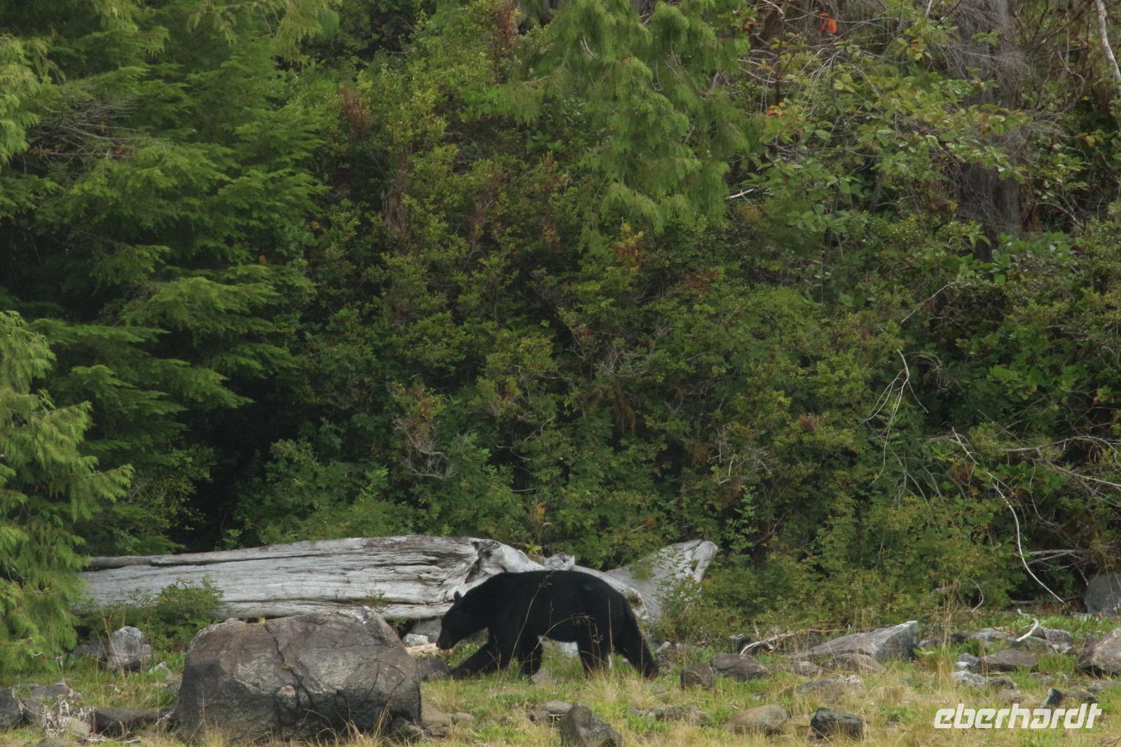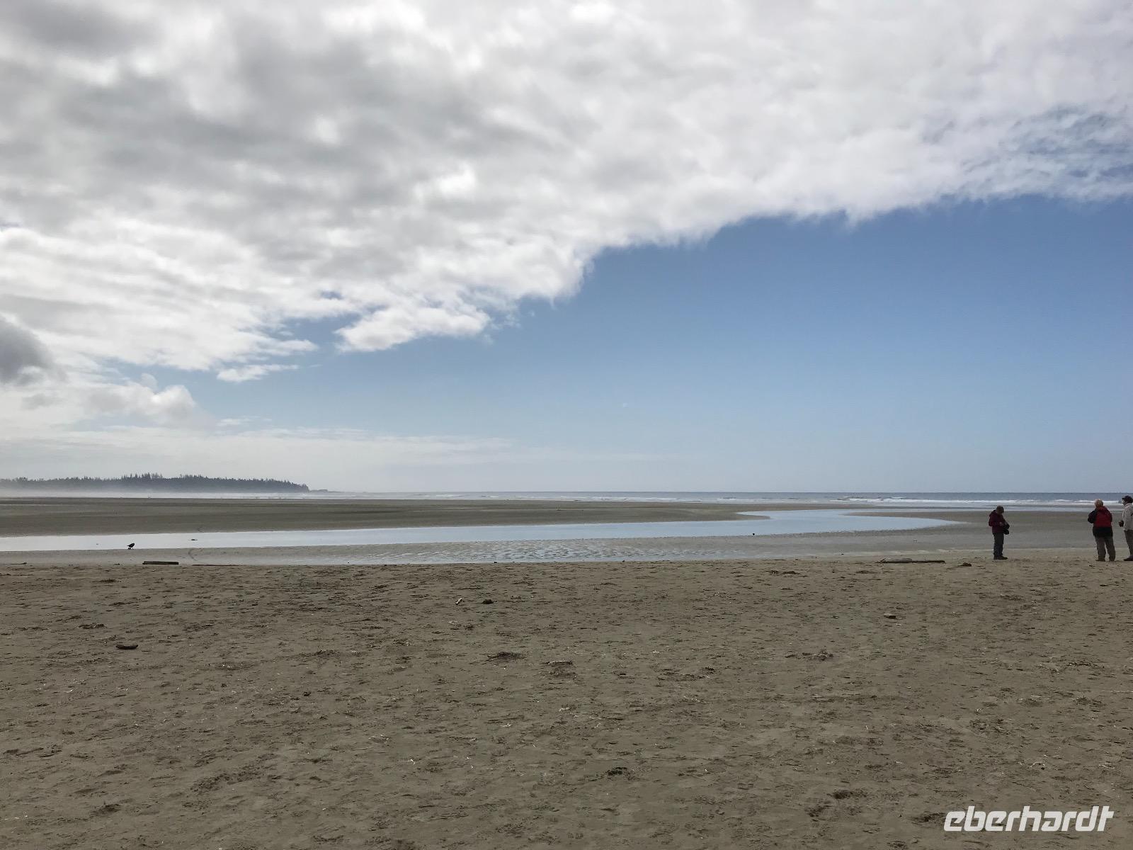 Heute begann der Tag in aller Frühe und bereits vor dem Frühstück trafen wir uns am Bus. Jedoch sollte niemand Hunger leiden, so stand für alle ein Frühstückspaket bereit. Nach einer kurzen Busfahrt kamen wir an einem Bootshaus an, wo wir uns für die heutige Bärenbeobachtungstour eincheckten. Nachdem die Formalitäten geklärt waren, blieb noch etwas Zeit, um unser Frühstück zu verzehren, wobei bereits die ersten Tiere gesichtet wurden: Fischotter. Zufrieden mit diesem ersten Erfolgserlebnis gingen wir schließlich an Bord unseres mit 500 PS ausgestatteten Bootes. Unser Kapitän und Reiseleiter für diesen Ausflug brachte uns zunächst etwas weg von der Ortschaft, wobei wir die Kraft des Motors durch die hohe Fahrtgeschwindigkeit erstmals erahnen konnten. Aktuell herrschte Ebbe vor, sodass die hier ansässigen Schwarzbären normalerweise herauskommen, um auf dem schlammigen Boden nach Nahrung zu suchen. Unter den Steinen finden sie zahlreiche Leckereien, wie beispielsweise Muscheln und kleine Krabben. In der Hoffnung, ein solches Szenario beobachten zu können, hielten wir fleißig Ausschau. Unsere Geduld sollte belohnt werden, denn schon bald zeigte sich ein ausgewachsener Schwarzbär mit seinen zwei Jungen. Wir fotografierten fleißig und unser Kapitän brachte uns immer weiter heran. Nach kurzer Weiterfahrt konnte bereits der nächste Bär verzeichnet werden, diesmal ein einzelner. Auch er befand sich auf Nahrungssuche und wurde von uns dabei bestens beobachtet uns natürlich fotografiert. Auf dem Rückweg entdeckten wir nochmal eine Mutter mit ihrem Jungen, jedoch in weiterer Entfernung, sowie schließlich zum Abschluss noch einen Weißkopfadler. Während der Tour hatten wir auch viel gelernt, sodass wir mit zahlreichen neuen Erkenntnissen wieder in Tofino ankamen. Hier wurden wir mit heißem Pfefferminztee erwartet, bevor wir mit dem Bus zum Pacific Rim Nationalpark aufbrachen.
