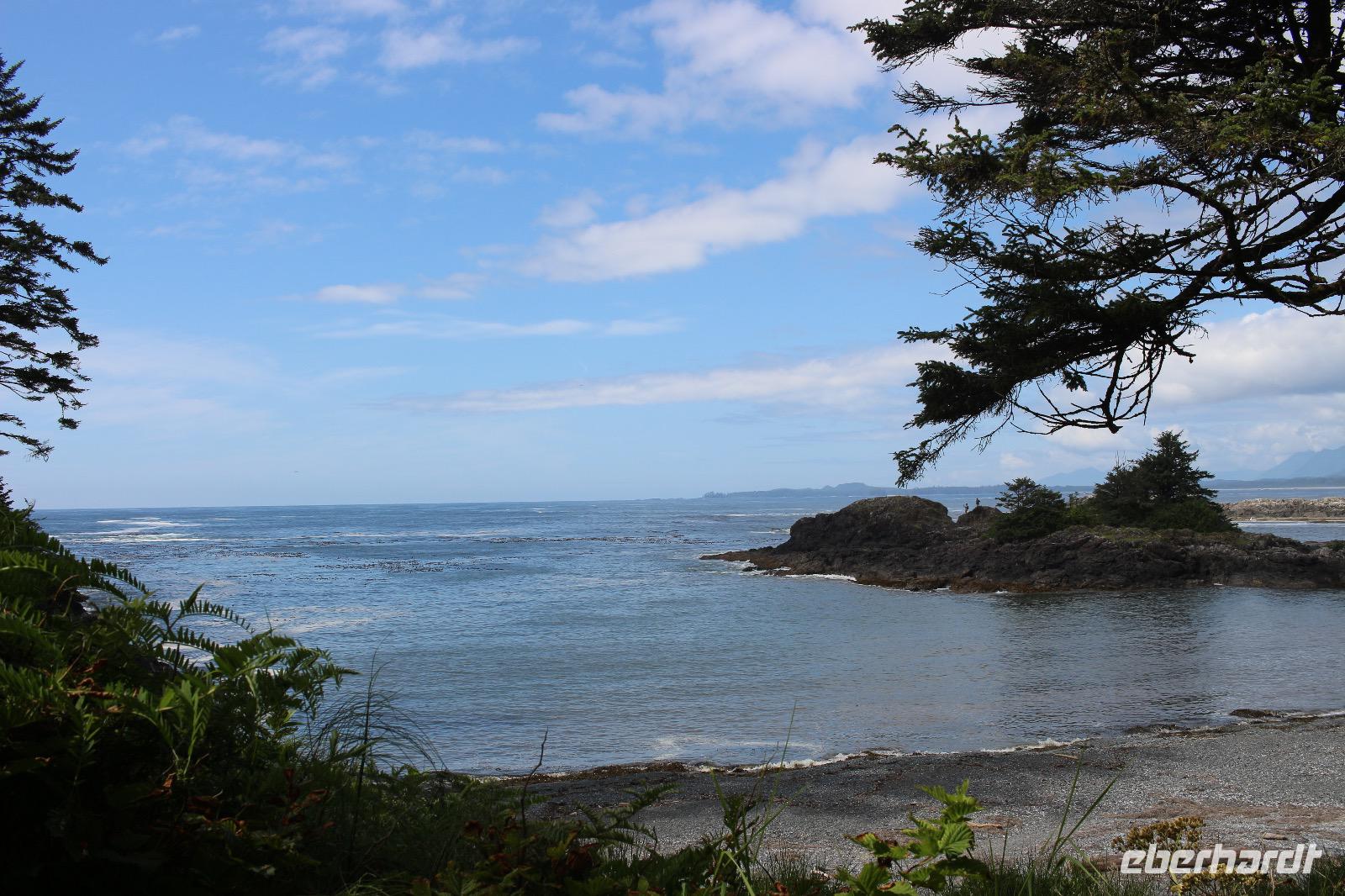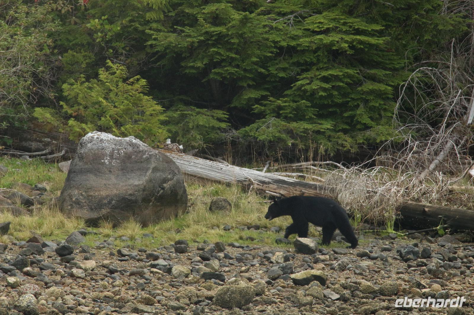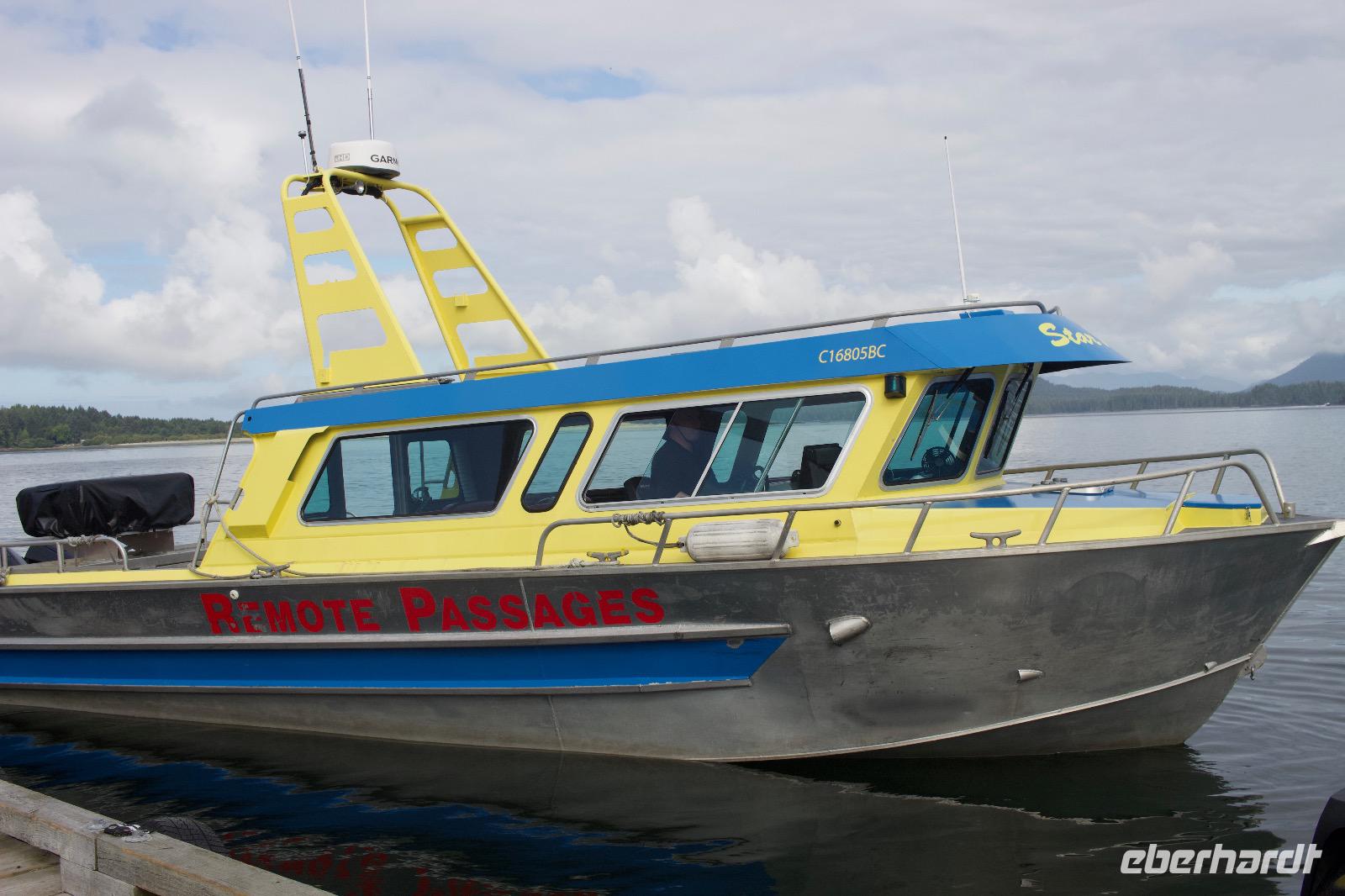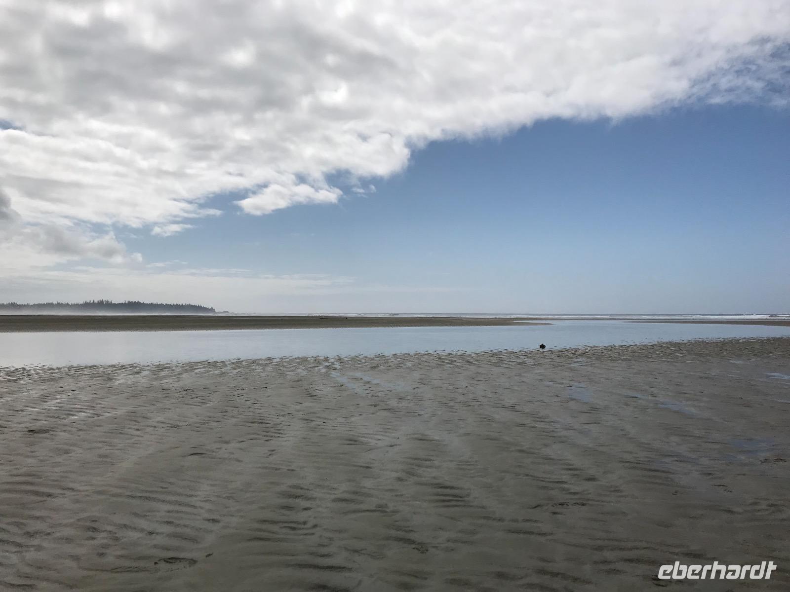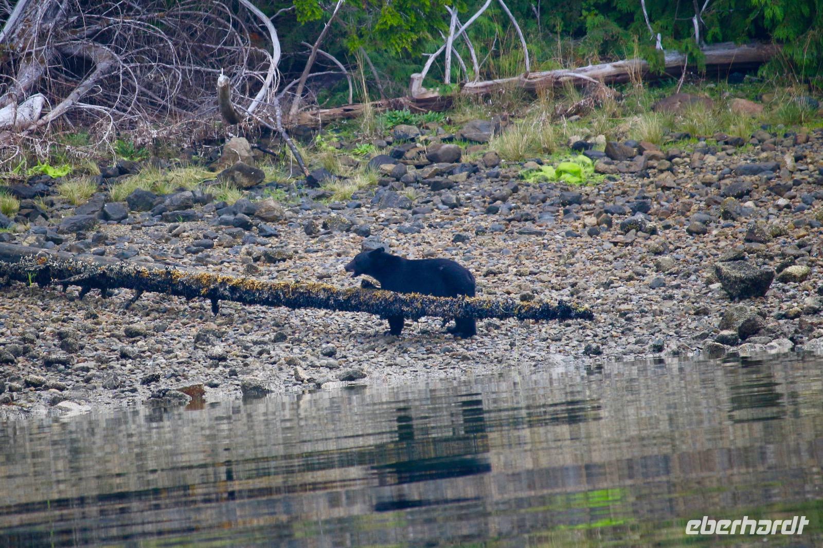 Heute begann der Tag in aller Frühe und bereits vor dem Frühstück trafen wir uns am Bus. Jedoch sollte niemand Hunger leiden, so stand für alle ein Frühstückspaket bereit. Nach einer kurzen Busfahrt kamen wir an einem Bootshaus an, wo wir uns für die heutige Bärenbeobachtungstour eincheckten. Nachdem die Formalitäten geklärt waren, blieb noch etwas Zeit, um unser Frühstück zu verzehren, wobei bereits die ersten Tiere gesichtet wurden: Fischotter. Zufrieden mit diesem ersten Erfolgserlebnis gingen wir schließlich an Bord unseres mit 500 PS ausgestatteten Bootes. Unser Kapitän und Reiseleiter für diesen Ausflug brachte uns zunächst etwas weg von der Ortschaft, wobei wir die Kraft des Motors durch die hohe Fahrtgeschwindigkeit erstmals erahnen konnten. Aktuell herrschte Ebbe vor, sodass die hier ansässigen Schwarzbären normalerweise herauskommen, um auf dem schlammigen Boden nach Nahrung zu suchen. Unter den Steinen finden sie zahlreiche Leckereien, wie beispielsweise Muscheln und kleine Krabben. In der Hoffnung, ein solches Szenario beobachten zu können, hielten wir fleißig Ausschau. Unsere Geduld sollte belohnt werden, denn schon bald zeigte sich ein ausgewachsener Schwarzbär mit seinen zwei Jungen. Wir fotografierten fleißig und unser Kapitän brachte uns immer weiter heran. Nach kurzer Weiterfahrt konnte bereits der nächste Bär verzeichnet werden, diesmal ein einzelner. Auch er befand sich auf Nahrungssuche und wurde von uns dabei bestens beobachtet uns natürlich fotografiert. Auf dem Rückweg entdeckten wir nochmal eine Mutter mit ihrem Jungen, jedoch in weiterer Entfernung, sowie schließlich zum Abschluss noch einen Weißkopfadler. Während der Tour hatten wir auch viel gelernt, sodass wir mit zahlreichen neuen Erkenntnissen wieder in Tofino ankamen. Hier wurden wir mit heißem Pfefferminztee erwartet, bevor wir mit dem Bus zum Pacific Rim Nationalpark aufbrachen.